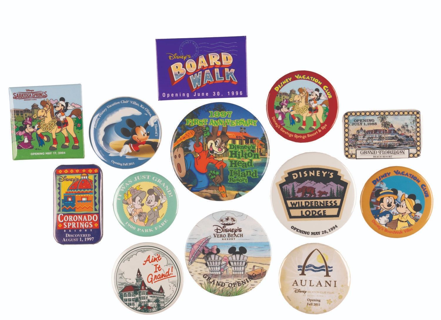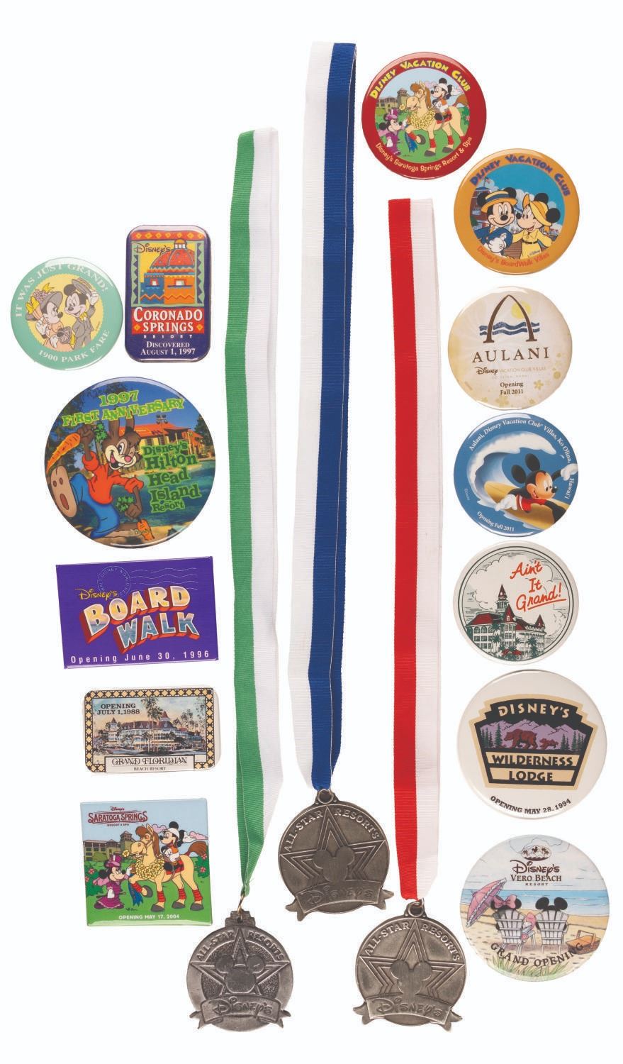 (Disney Resorts, 1994-2011) A collection of thirteen buttons and three medals from Disney Resort Grand Openings and Anniversaries. Included are buttons from Disney’s BoardWalk, Aulani, Disney’s Saratoga Springs Resort & Spa, Disney’s Coronado Springs Resort, Disney’s Wilderness Lodge, Disney’s Vero Beach Resort, the Grand Floridian, and three medals from Disney’s All-Star Music Resort, Disney’s All-Star Movies Resort, and Disney’s All-Star Sports Resort. Ranging in size from 2.25” to 3.5” in diameter, the items are in good to very good condition with surface scratches and wear.