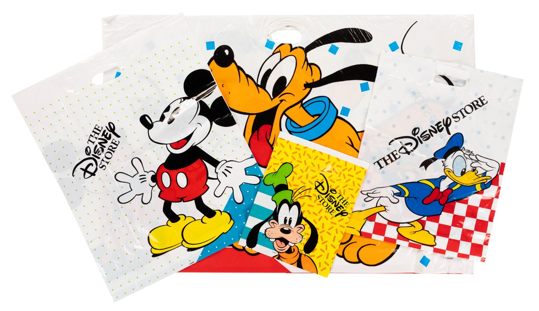 (Disney Store, 1980s-90s) A collection of four shopping bags from the Disney Store featuring Mickey Mouse, Donald Duck, Goofy, and Pluto. Ranging in size from 9.25” x 11.75” to 24.5” x 35.5”, the bags are in good condition with creases, scratches, scuffs, and wear.