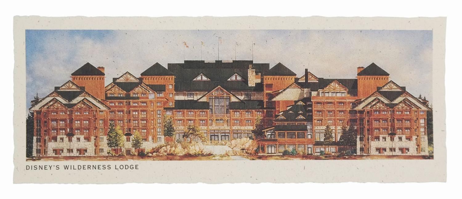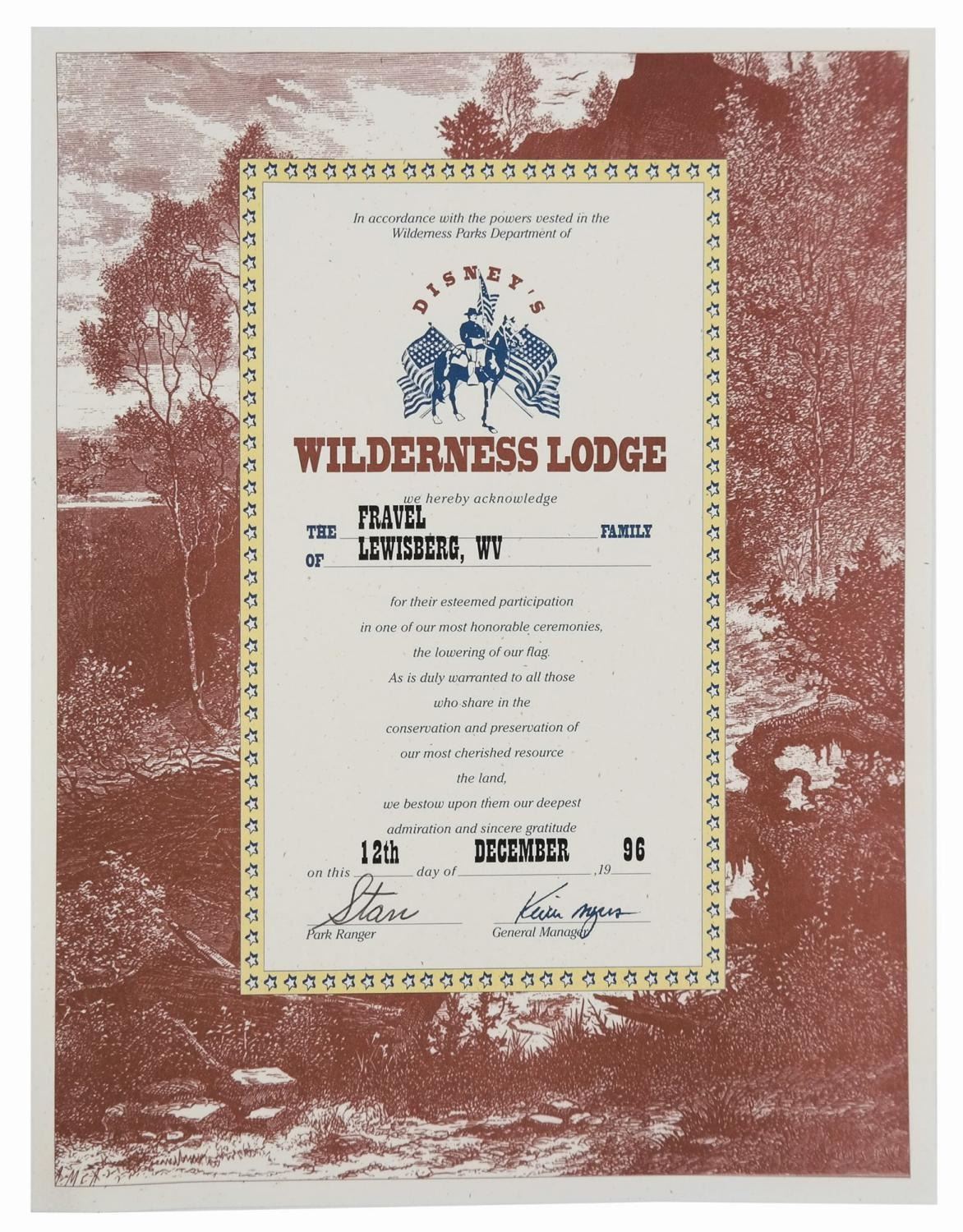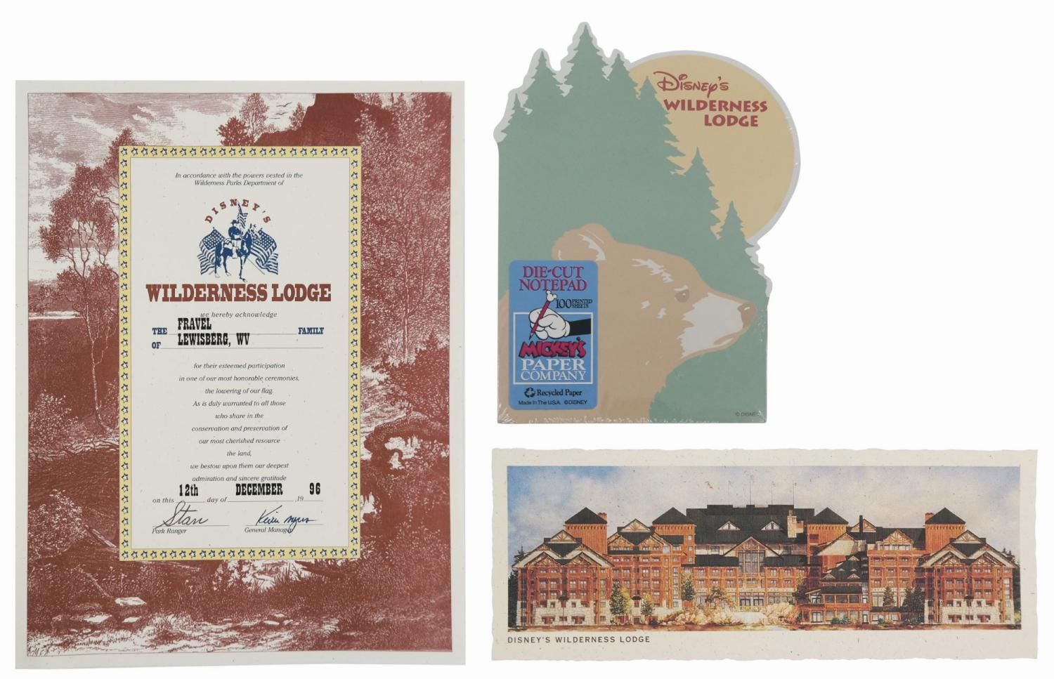 (Walt Disney World, 1996) A collection of paper souvenirs from Disney’s Wilderness Lodge at Walt Disney World. Included are a postcard, an unopened notepad, and a certificate presented to the family of Gary Fravel, who helped establish the Disney University training program. Ranging in size from 4.75” x 6.75” to 8.5” x 11”, the items are in very good to fine condition with light wear.