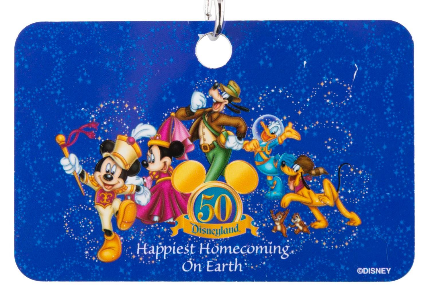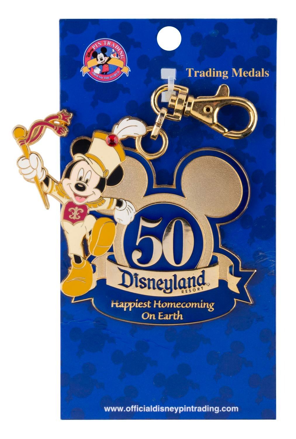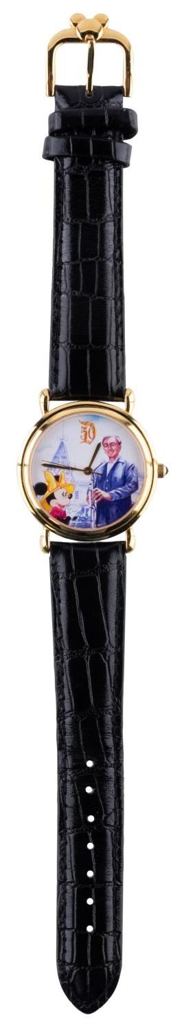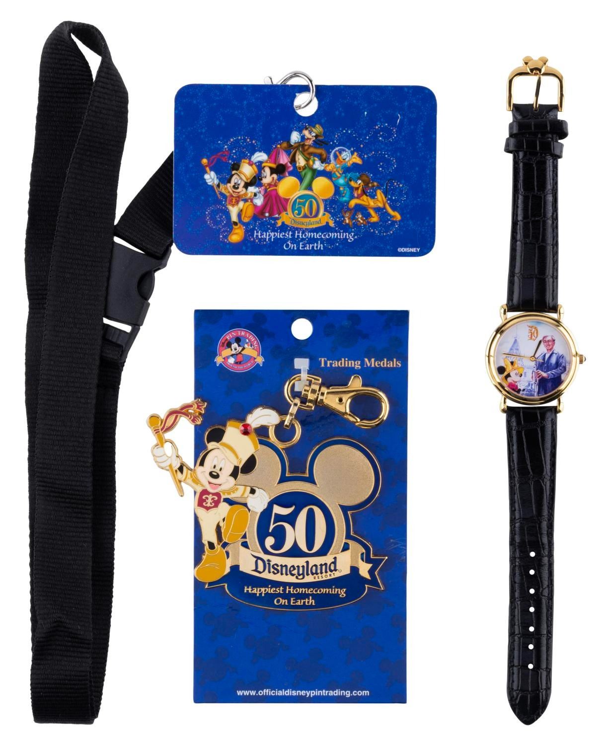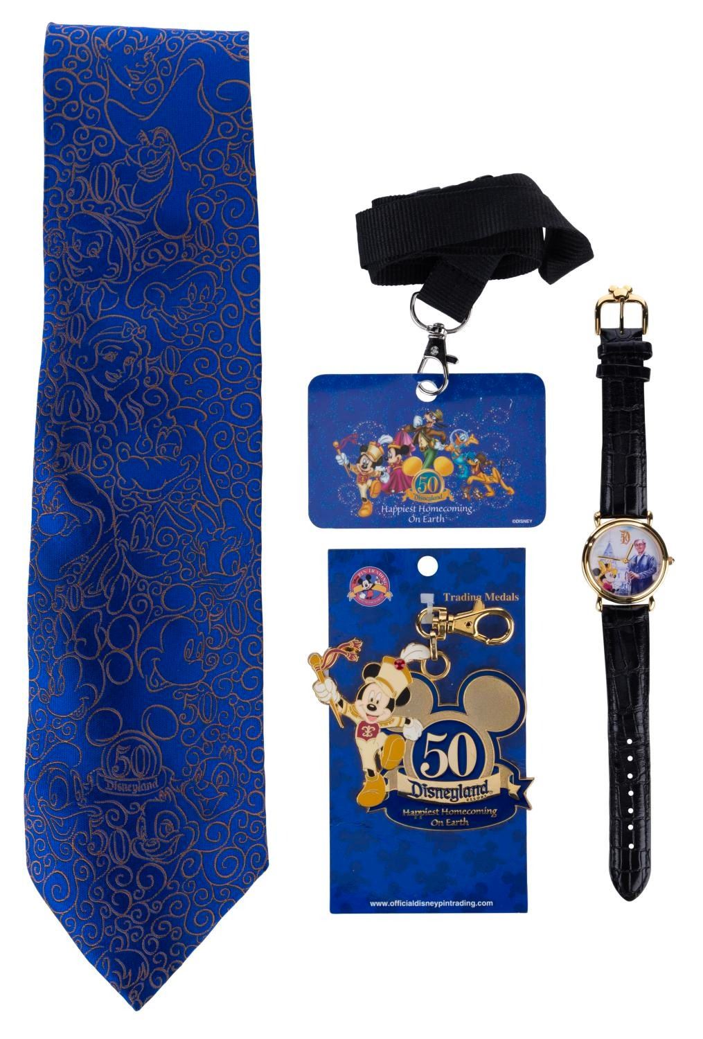 (Disneyland, 2005) A collection of items from Disneyland's 50th anniversary including a wristwatch, a lanyard badge, a necktie, and a trading medal. The watch measures 9.5" long with a 1.25" x 1.25" face and is in very good condition with a light bend. The tie is in fine unworn condition. The medal and lanyard badge are in very good condition and exhibit light scratches on their surfaces.