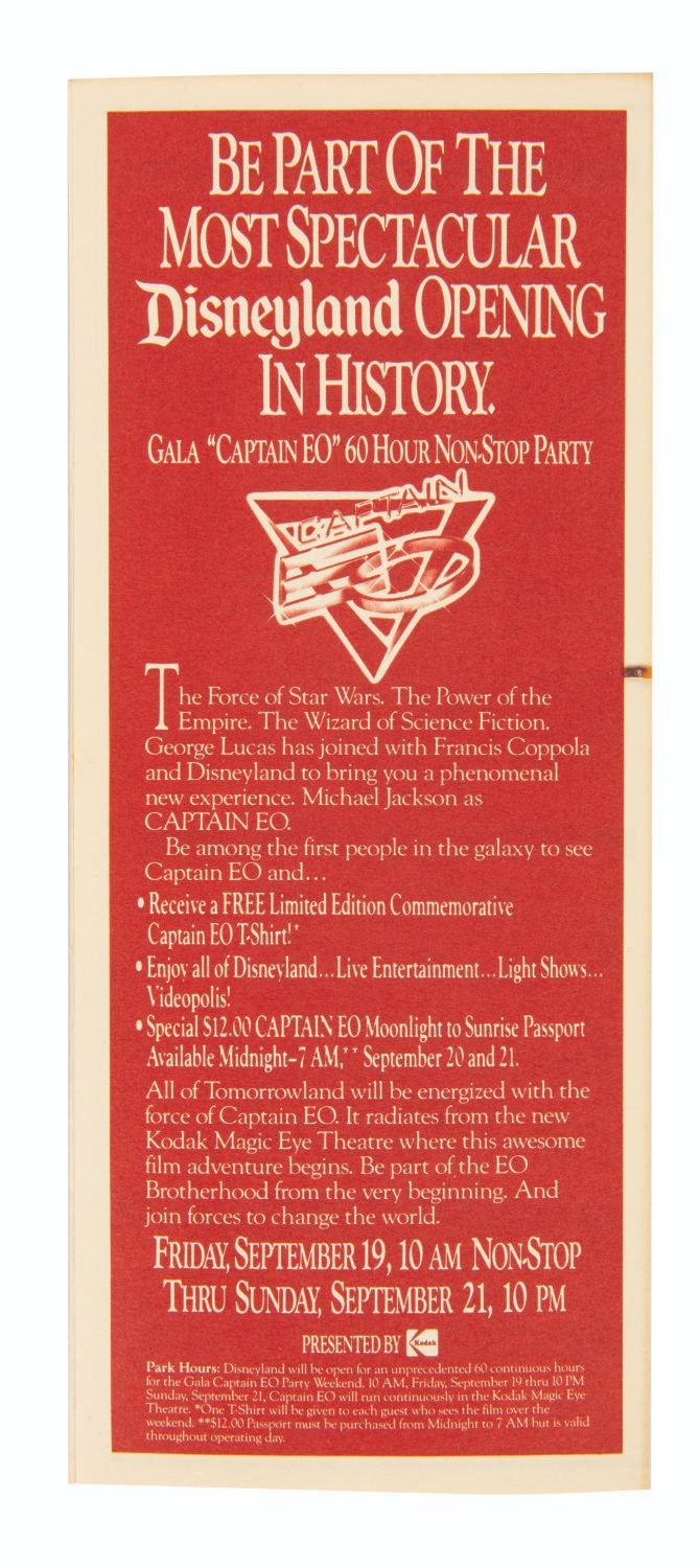 (Disneyland, 1986) A collection of 35 Disneyland Today Main Gate handbills. Documenting April through September of 1986, the handbills promote special events, closings, and other happenings, including the debut of Captain EO, as well as Park closures beforehand to film the EO television special. Also included is a Parking & Admission Information Guide. Measuring from 3.25" x 7" to 3.5" x 8.5", the handbills are in fine condition.