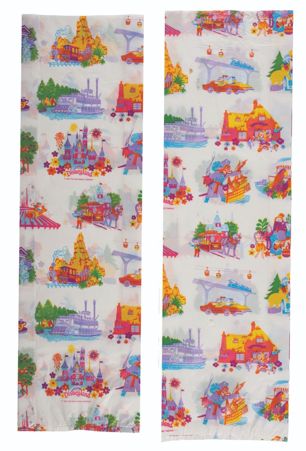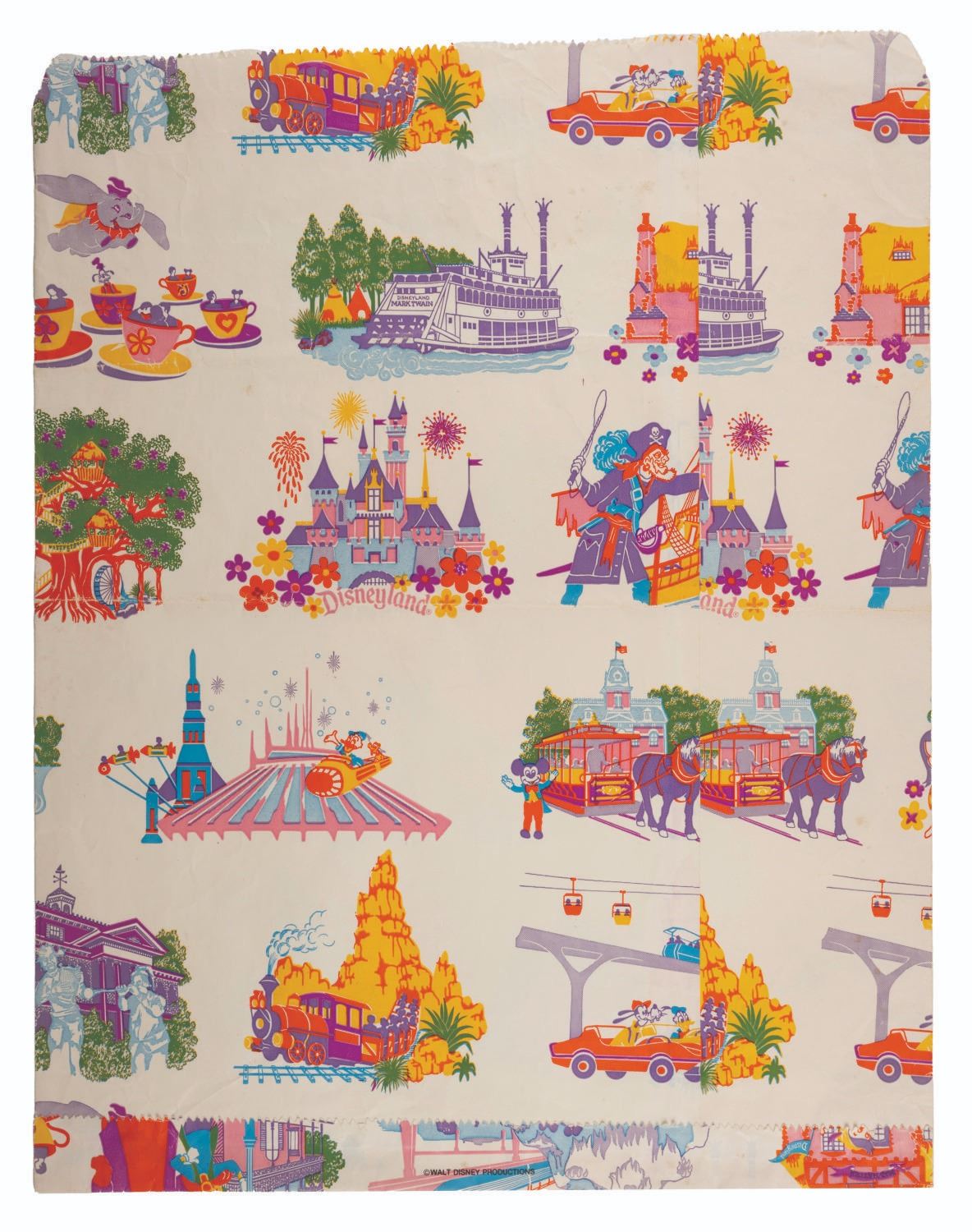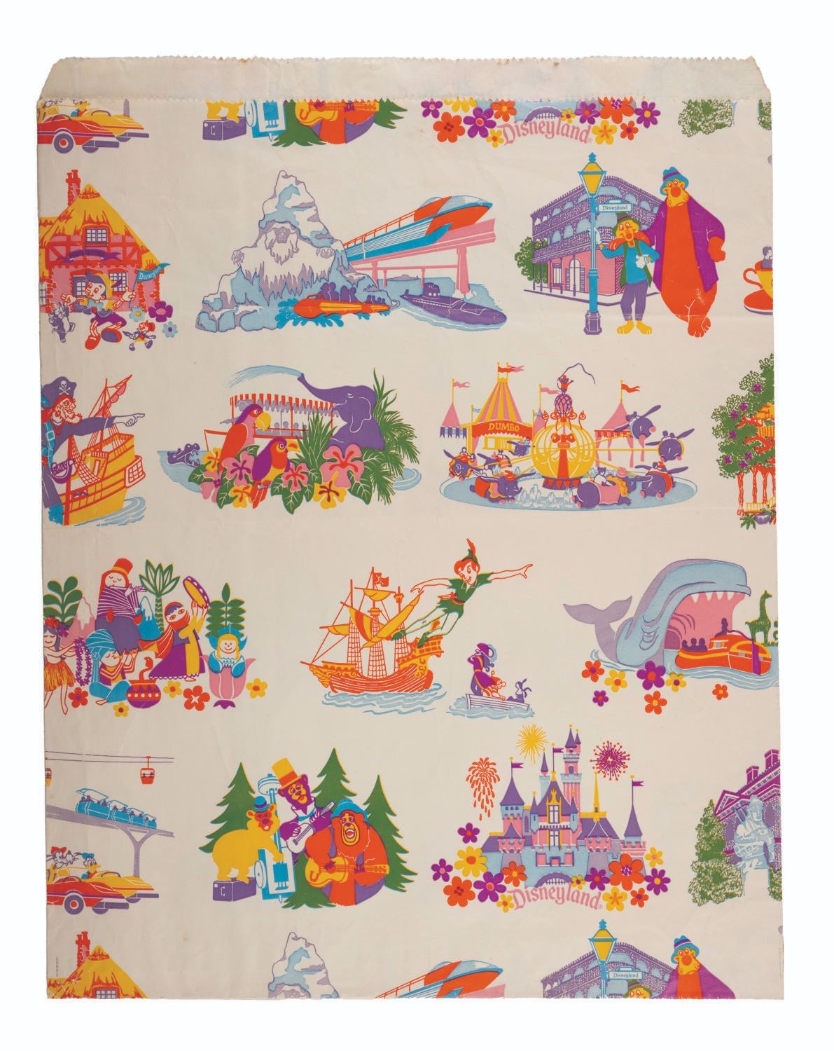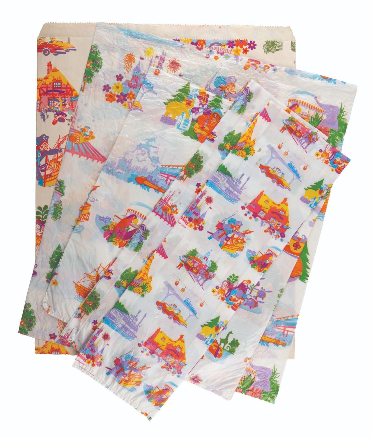 (Disneyland, 1970s) A collection of five plastic and paper merchandise bags from Disneyland featuring Park attractions including Pirates of the Caribbean, the Matterhorn, the Country Bear Jamboree, and more. Ranging in size from 5.5" x 18" to 14.5" x 18.5", the bags are in good to very good condition with folds, creases, and wear from handling and age.
