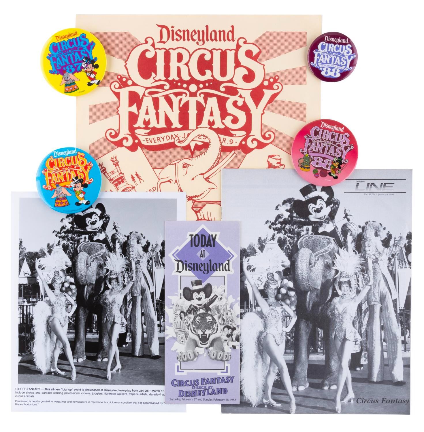 (Disneyland, 1986-88) A collection of Disneyland Circus Fantasy souvenirs, including a press photo, a Disneyland Line from 1986, a "Today at Disneyland" schedule from February 1988, a mini poster, and four buttons. Measuring 2.25" in diameter up to 11" x 17", the souvenirs are in very good condition, with typical light wear, and edge wear including slight chipping to the poster.