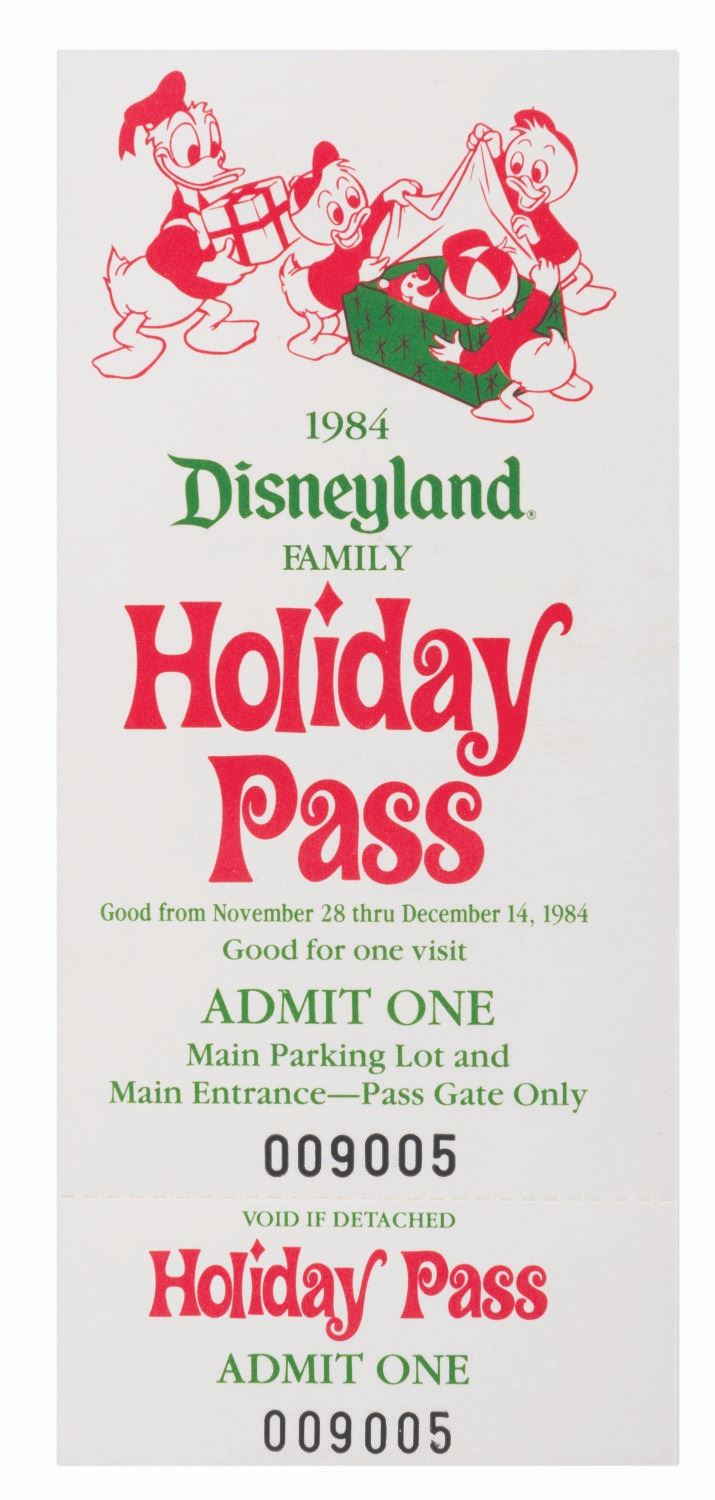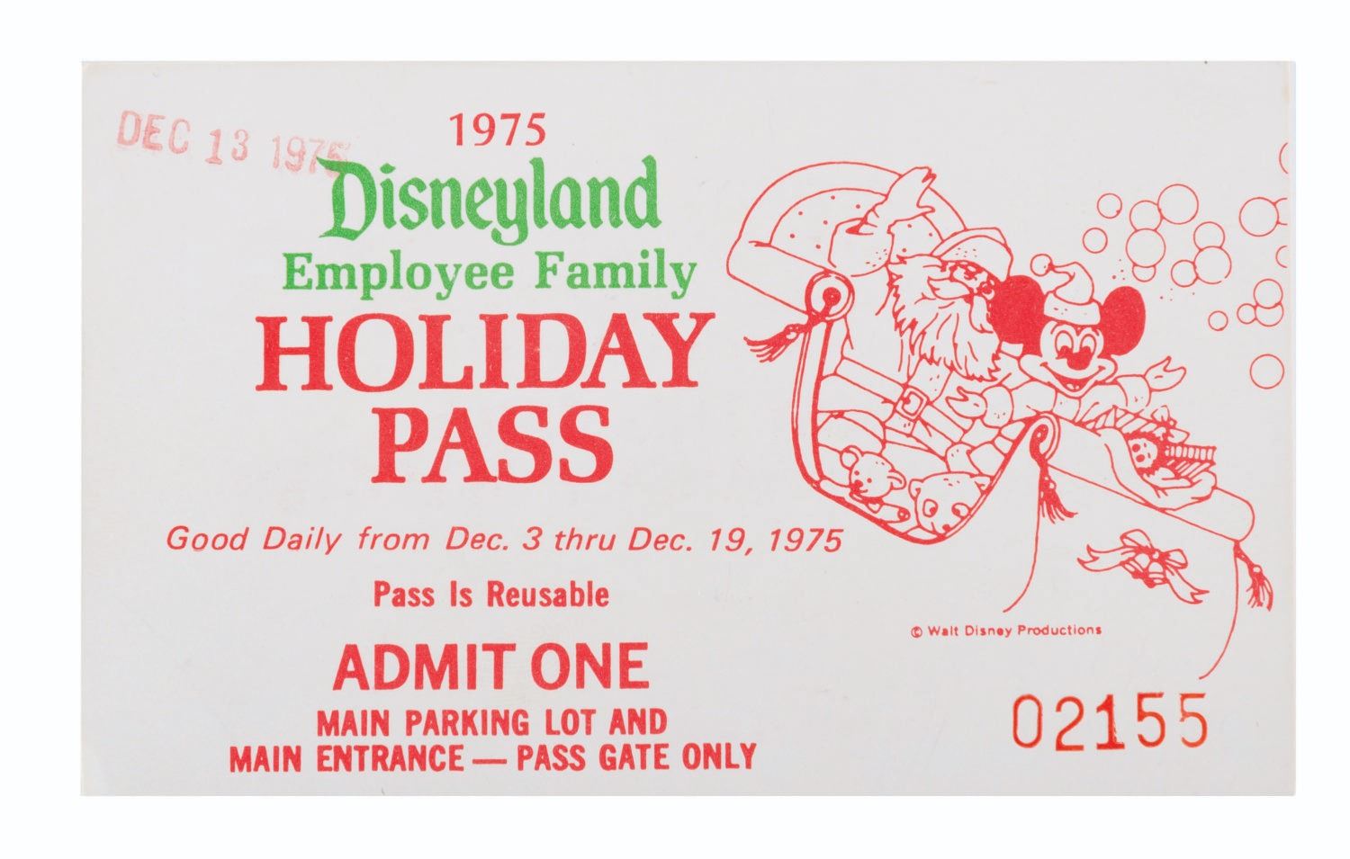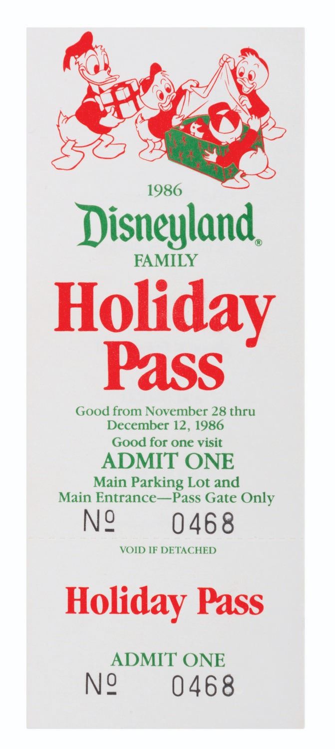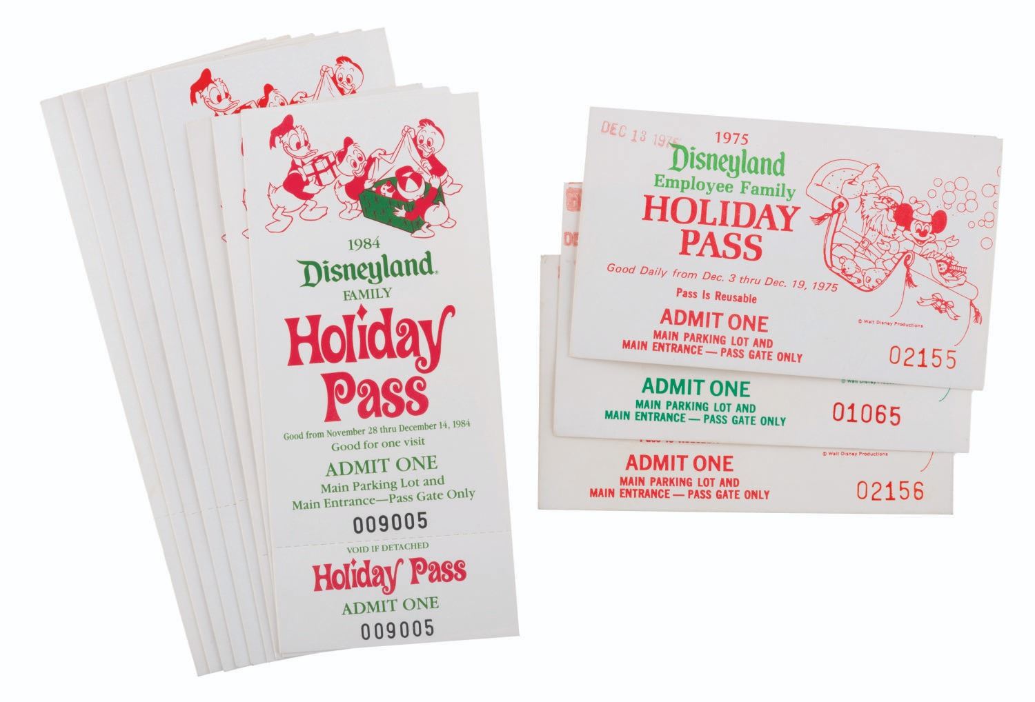 (Disneyland, 1975-1986) A collection of Disneyland employee family holiday passes from 1975, 1976, 1984, and 1986. The 1970s holiday passes have been signed on the back by Ralph Hansen, who drove more than 100,000 miles down Main Street, U.S.A. during his Disney career. Ranging in size from 2.75” x 4” to 2.25” x 5.75”, the passes are in very good to good condition with light scratches, stains, stamps from use, and wear from age and use.