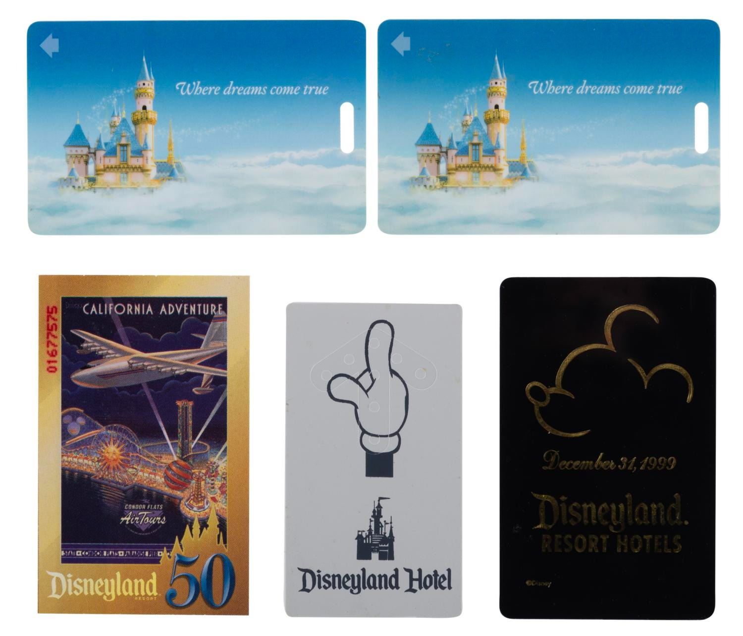 (Disneyland, 1990s-2005) A pair of Disneyland Hotel keys, a pair of unused luggage tags, and one Park-hopper ticket, featuring Disneyland's 50th anniversary logo and imagery. Measuring from 1.75" x 3.25" to 2.25" x 3.5", the items are in very good to good condition with light wear, scratching from use, and ink fading on the back of the ticket.