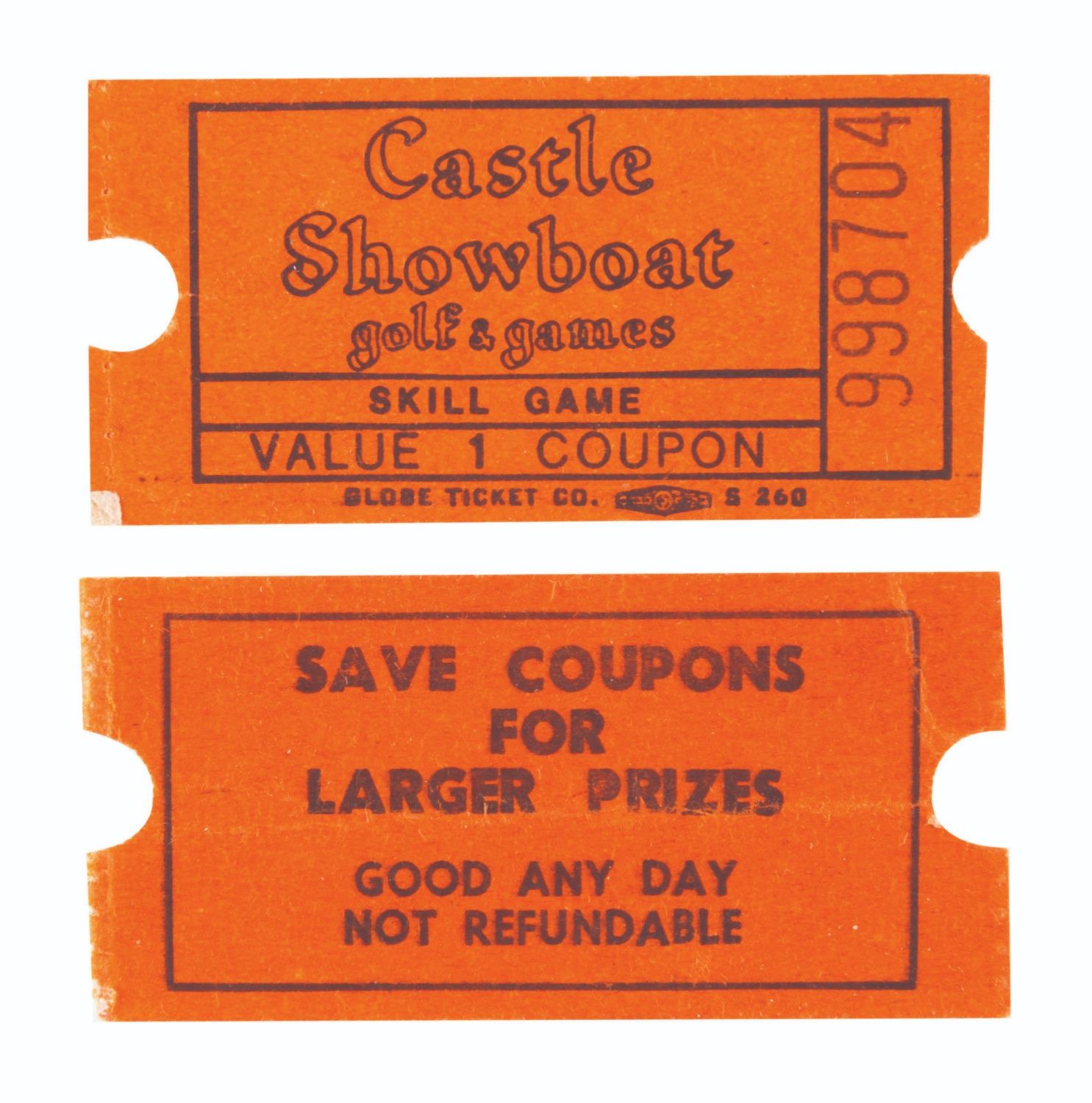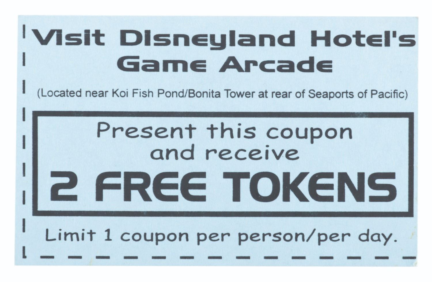 (Disneyland, 1950s-80s) A collection of Disneyland Hotel paper ephemera. Included are a doily, an unused sheet of stationery and an envelope, a hotel bill from 1957, a parking ticket from 1985, five Game Arcade tokens coupons, and a pair of Castle Showboat game coupons. Ranging in size from the 1" x 2" game coupons to the 8" diameter doily, the items all display in good to very good condition with edge wear, light discoloration from age, and light stains to the stationery.