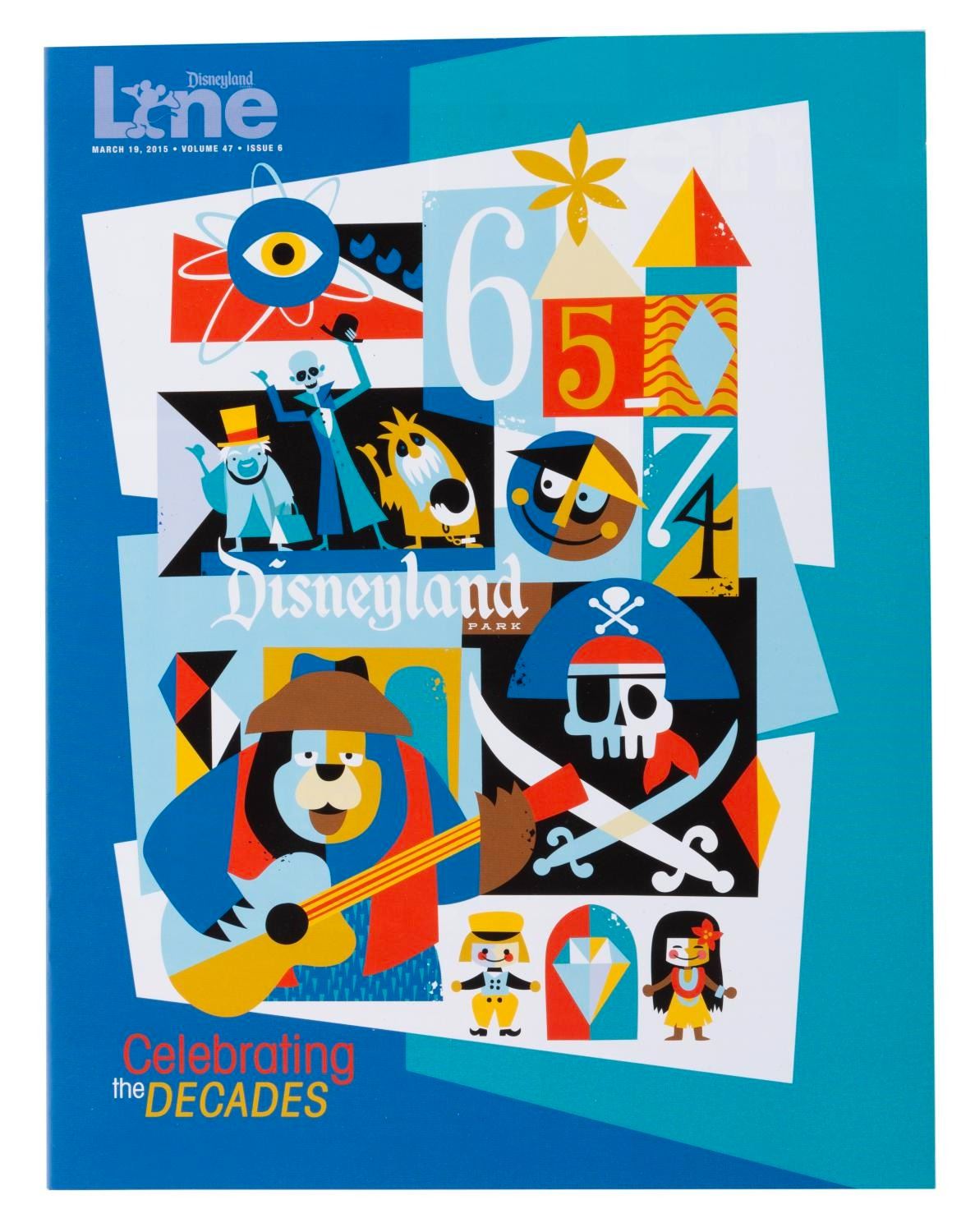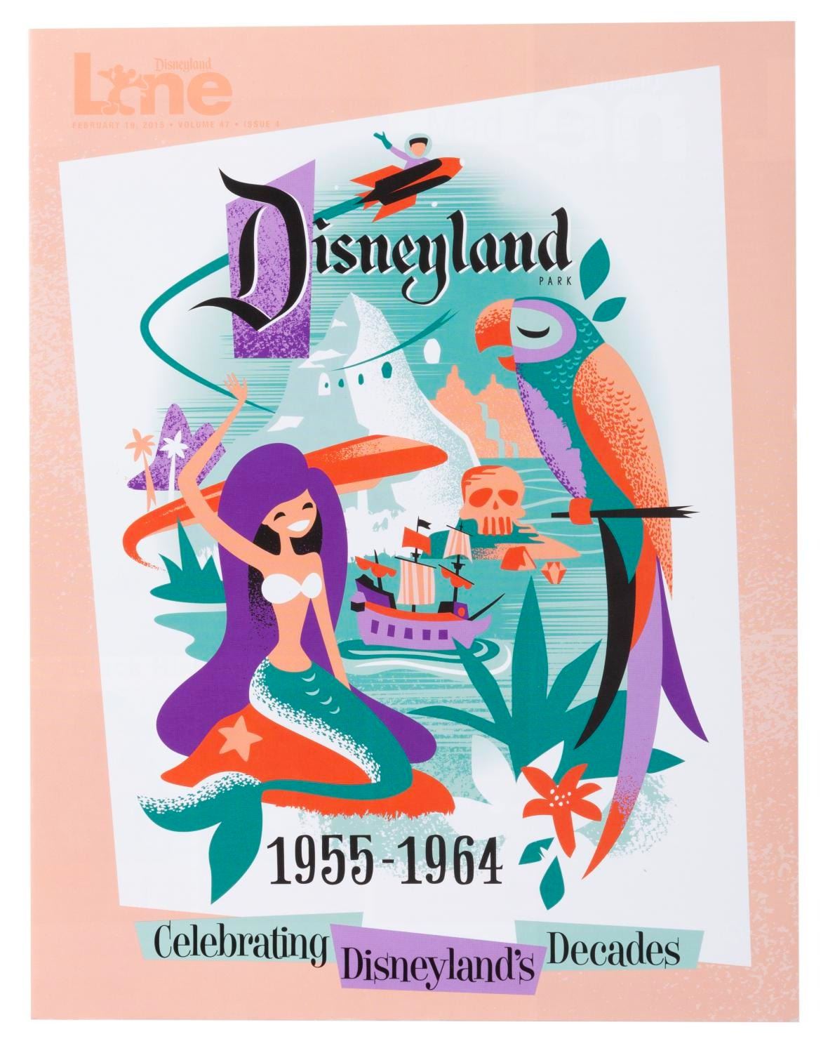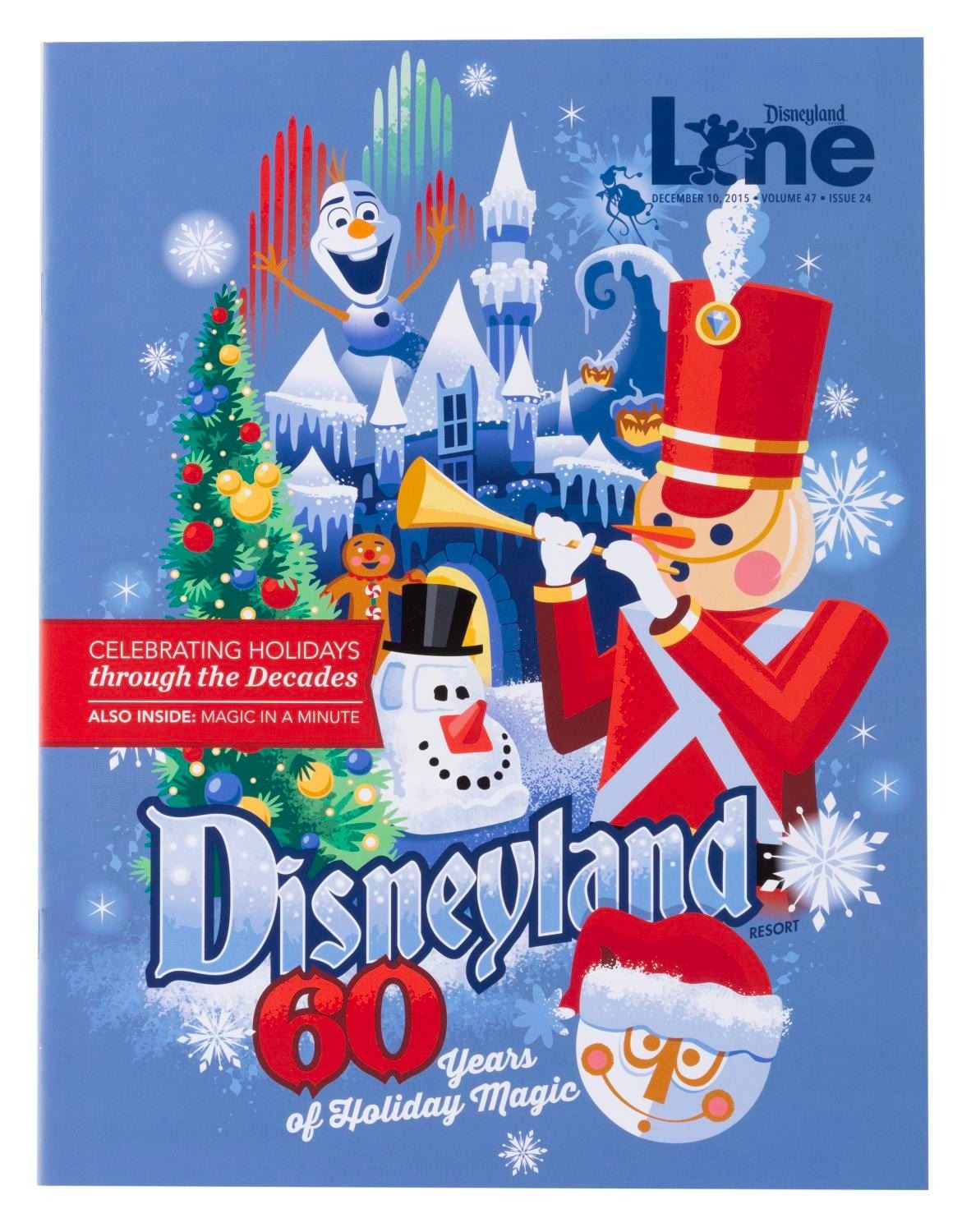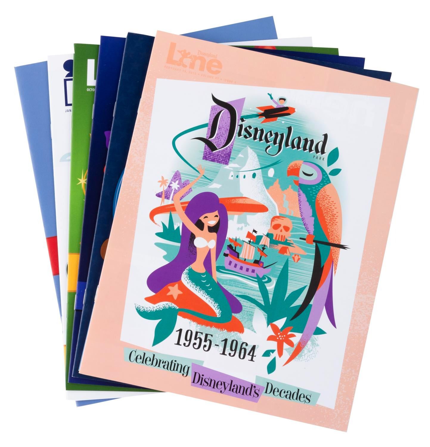 (Disneyland, 2015-16) A set of seven Disneyland Line employee newsletter magazines about the Park’s 60th anniversary. Six focus on one decade since 1955 forward in Park history, with the seventh celebrating holidays through the decades. The magazines are in very good to fine condition with some very light handling wear.