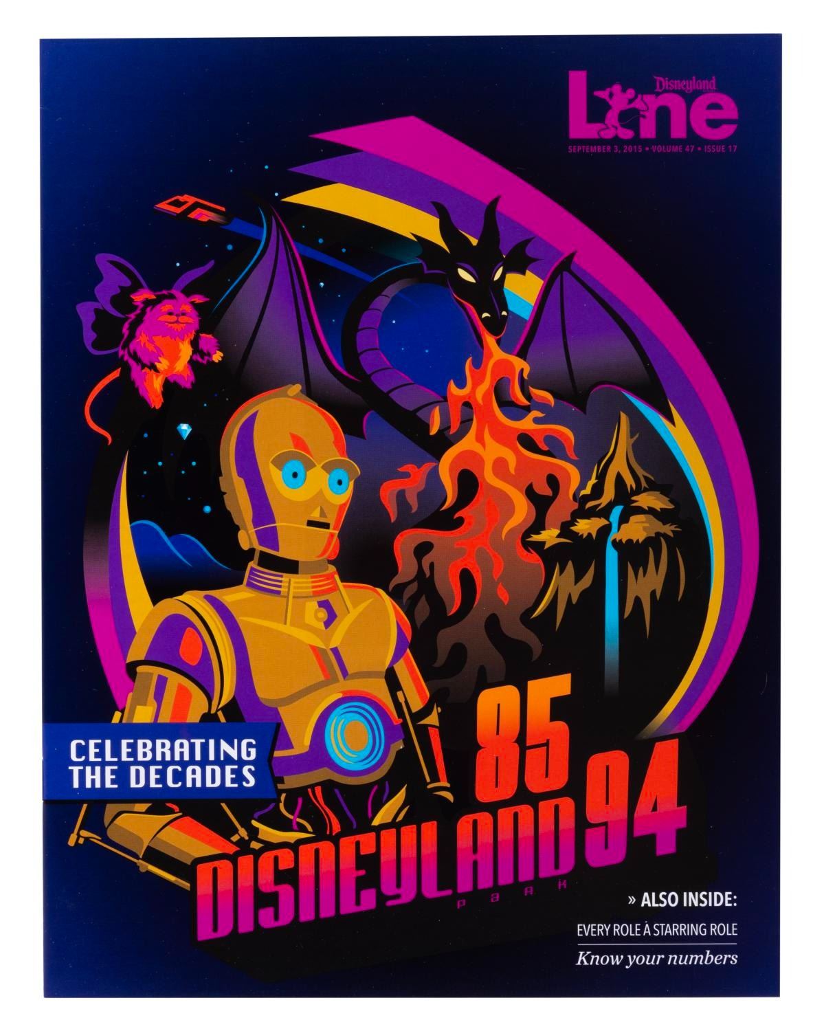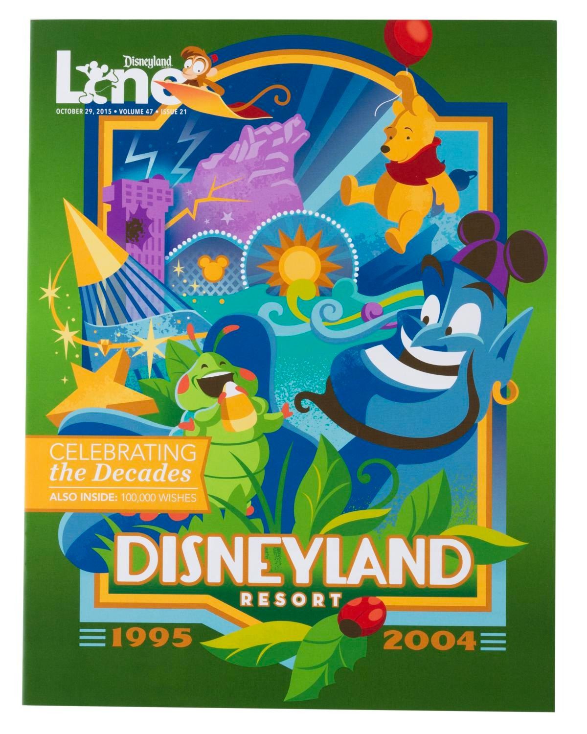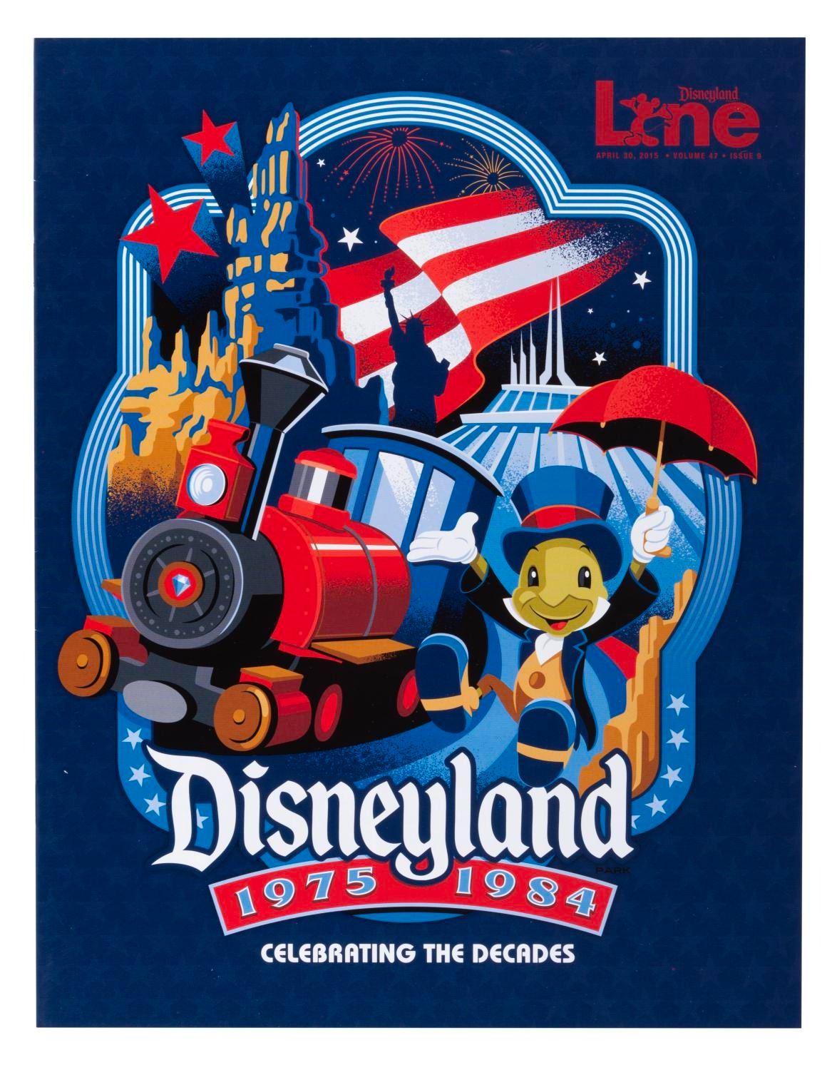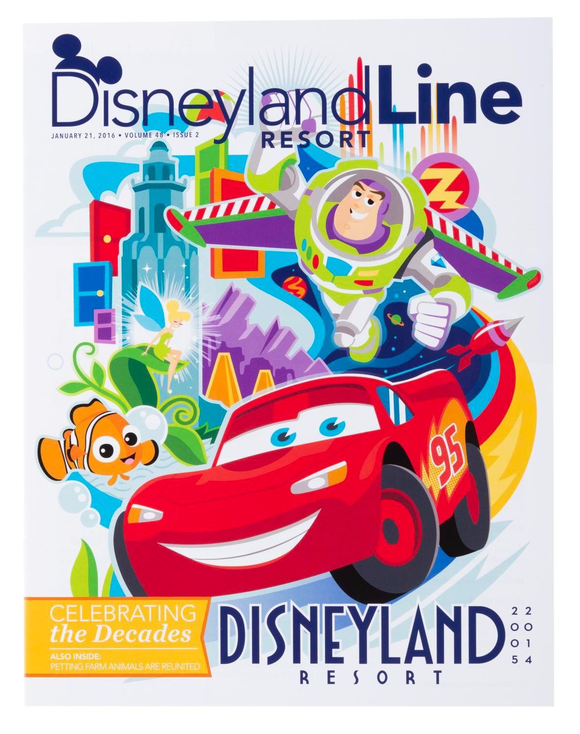 (Disneyland, 2015-16) A set of seven Disneyland Line employee newsletter magazines about the Park’s 60th anniversary. Six focus on one decade since 1955 forward in Park history, with the seventh celebrating holidays through the decades. The magazines are in very good to fine condition with some very light handling wear.