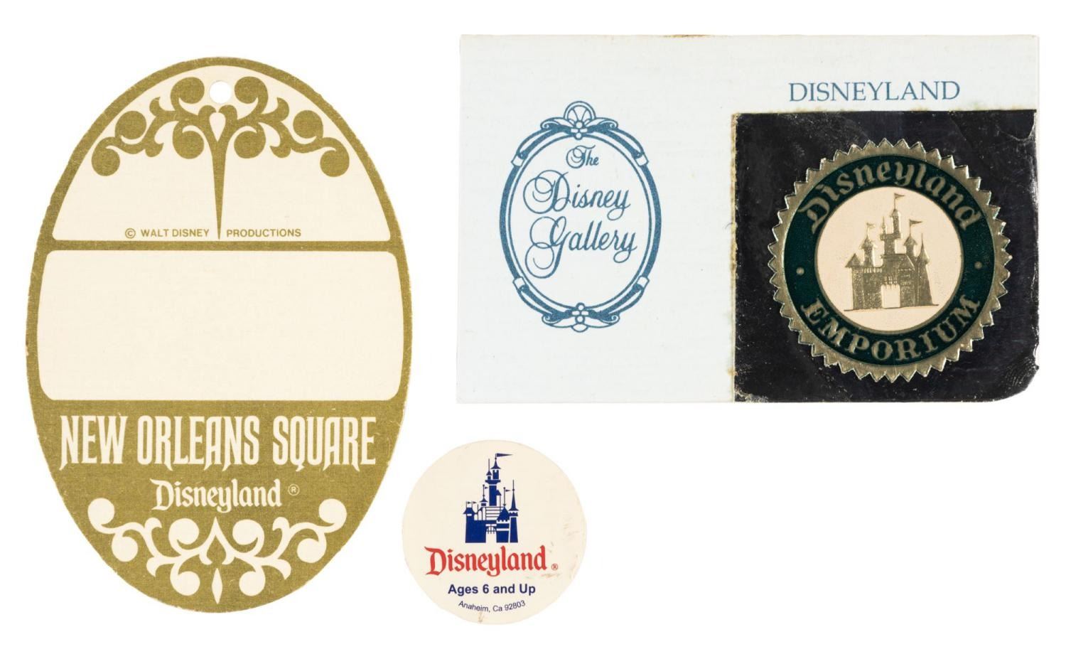 (Disneyland, 1980s-2000s) A collection of Disneyland memorabilia from all over the Park. Included are a Disneyland Emporium sticker, a Disneyland ages 6 and up sticker, a New Orleans Square tag, and a business card from The Disney Gallery. Ranging in size from 1” in diameter to 2” x 3.25”, the items are in good to fair condition with creases, scuffs, stains, blue ink inscriptions on the back of the business card, and a silver adhesive obscuring half of the card.