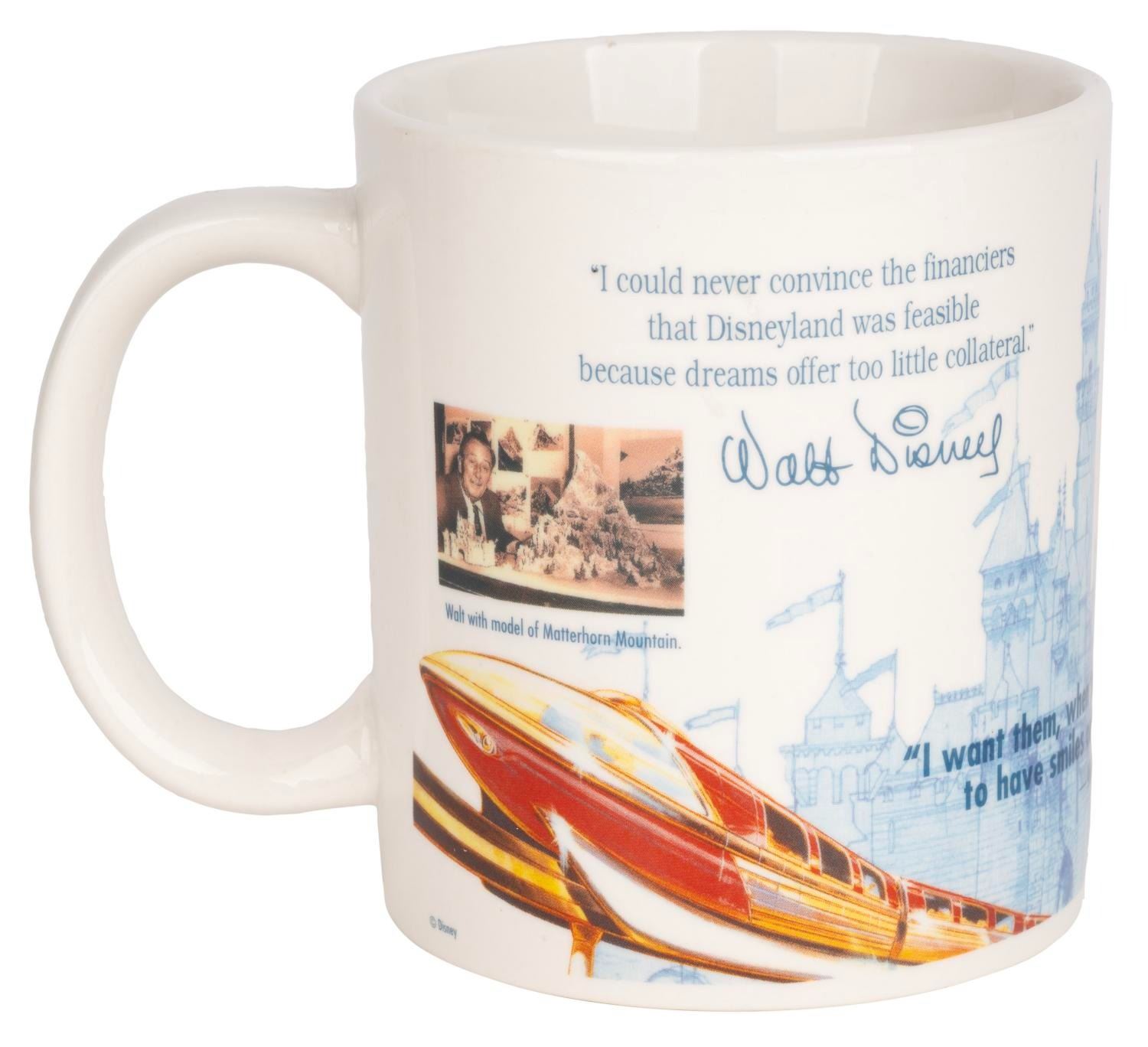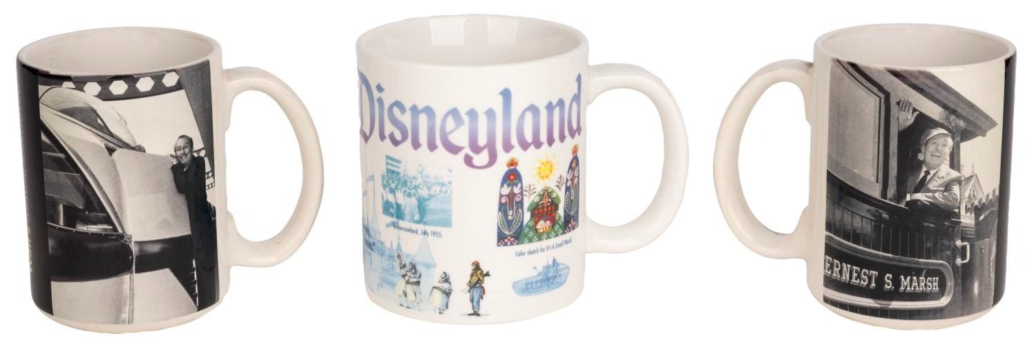 (Disney, 1990s-2000s) A collection of three Disneyland mugs. Two feature archival images of Walt in the Park, and the third is a Walt Disney Gallery mug with quotes from Walt about Disneyland. Measuring 3.25" to 4" in diameter and 4.5" high, the mugs are in fine unused condition.