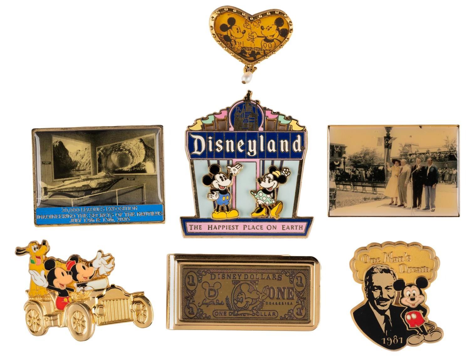(Disneyland, 1990s-2000s) A collection of six pins featuring Mickey and Minnie, Walt Disney, and the 20,000 Leagues Unde the Sea Walk Through Attraction. Also included is a money clip featuring Mickey Mouse. Measuring from 1.25" to 2", the pieces are in very good condition with light handling wear.