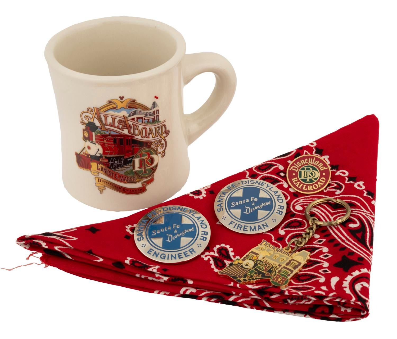 (Disneyland, 2010s) A collection of souvenirs from an Ernest S. Marsh-themed event at Disneyland. Included are Santa Fe & Disneyland Railroad Fireman and Engineer pinback badges, a mug, a handkerchief, a pin, a keychain, and a patch. The mug measures 4"x4.75", the handkerchief is 20"x20", the patch is 3" in diameter, the keyring is 1.5"x1.75", and the pins are 1" and 1.75". Each piece is in fine or very good condition with very light signs of wear.