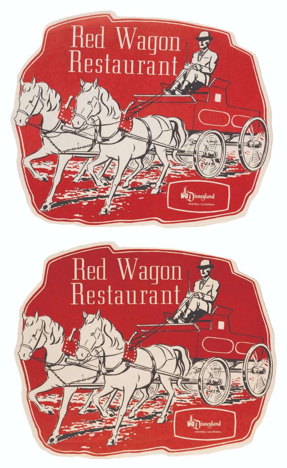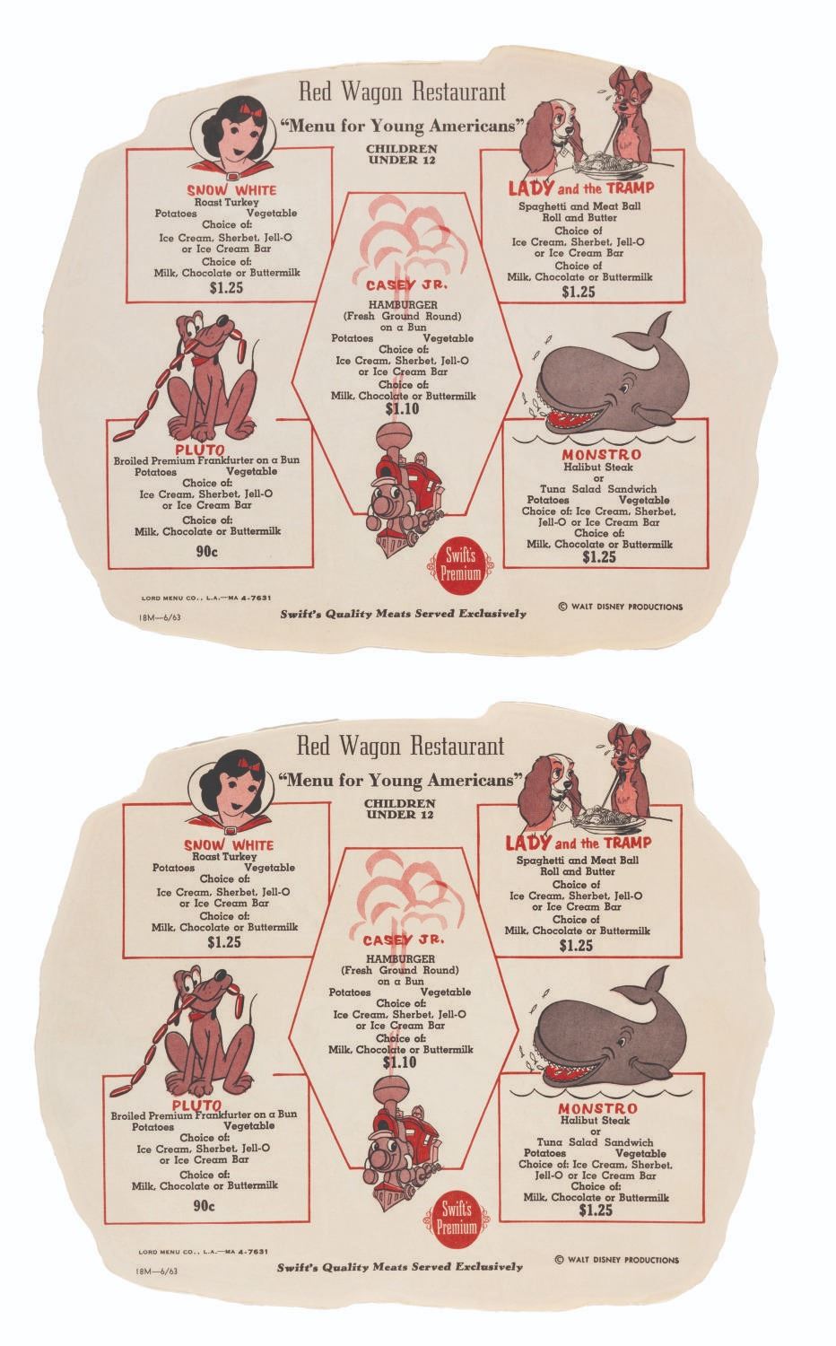 (Disneyland, 1960s) A collection of four children's menus from Disneyland's Red Wagon Inn on Main Street. These stylish menus measure 9.5" x 8" and are in very good condition with light wear to some.