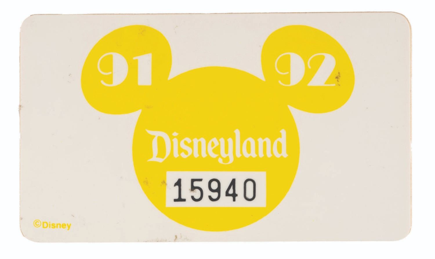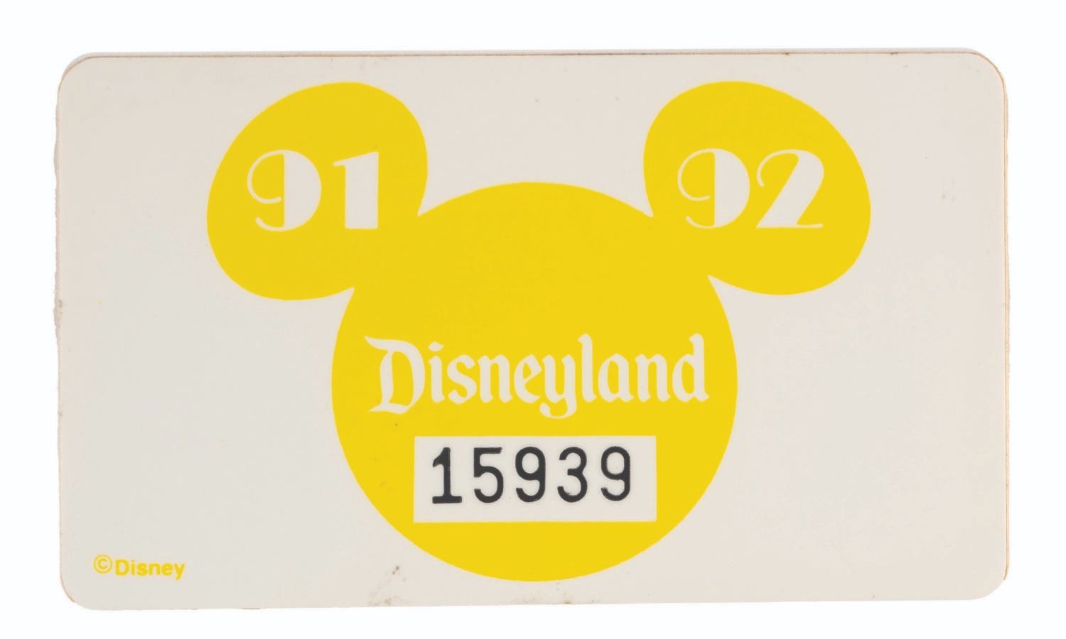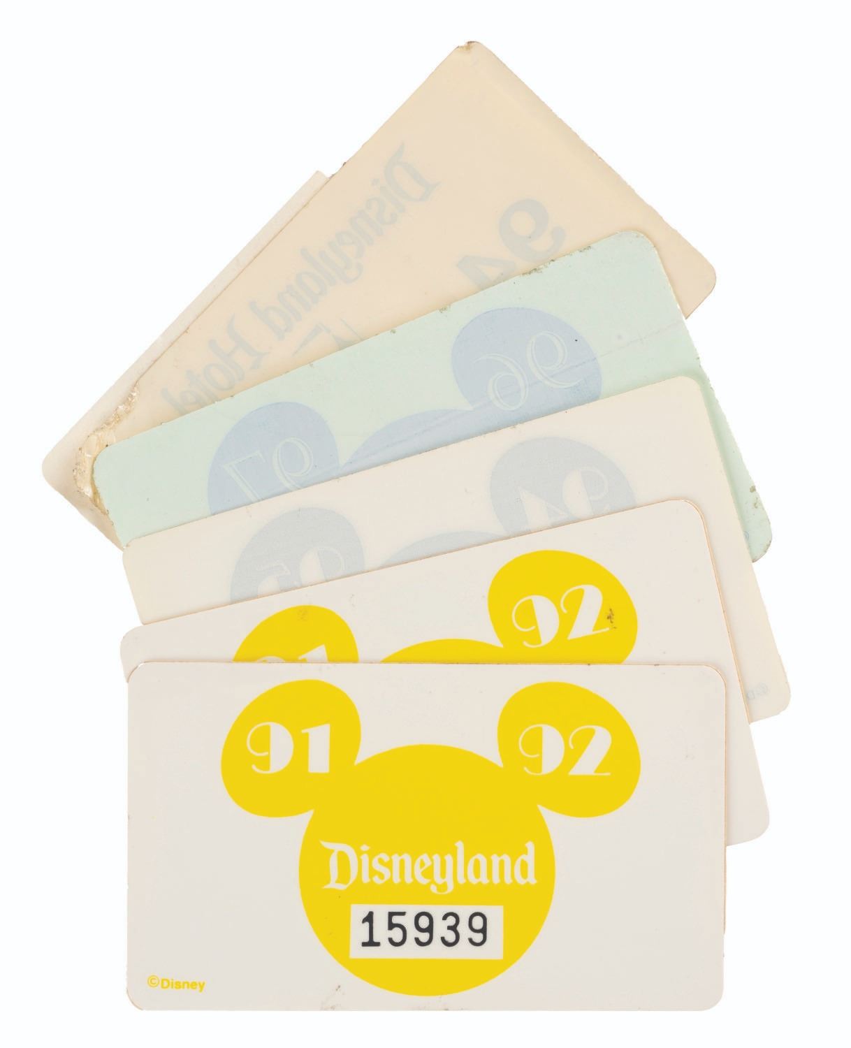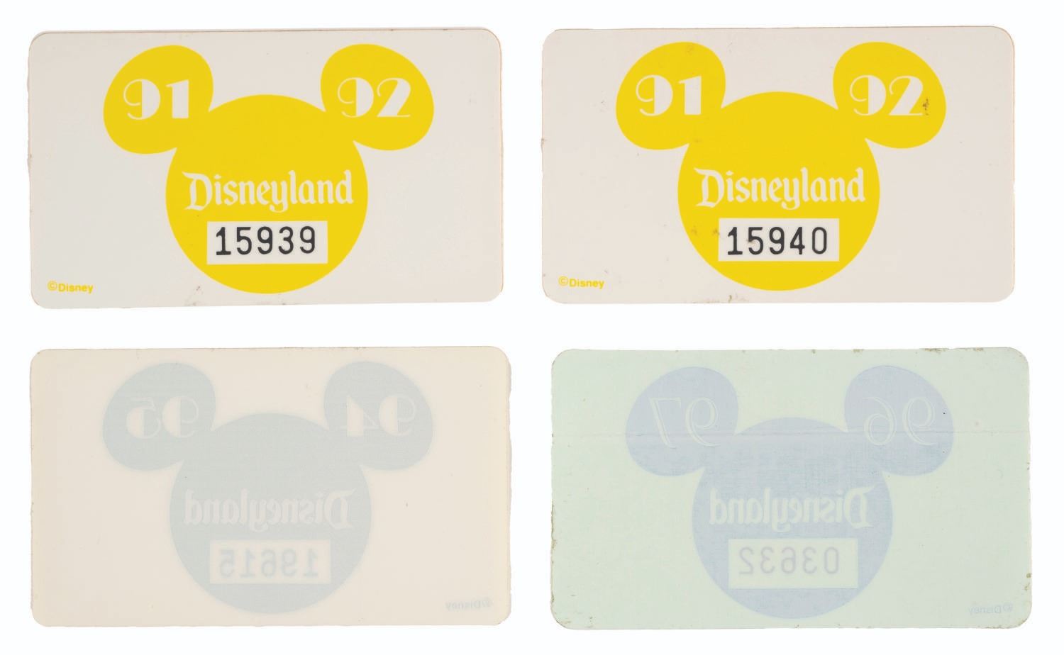 (Disneyland, 1991-1997) A collection of five parking decals, four for Disneyland and one for the Disneyland Hotel. The Disneyland decals include two for 1991-1992, one for 1994-1995, and one for 1996-1997, while the Disneyland Hotel decal is for 1994-1995. Measuring 1.75" x 3" each, the parking decals are in good to very good condition with scratches, wear, stains, and heavy soiling on the reverse of the Disneyland Hotel decal.