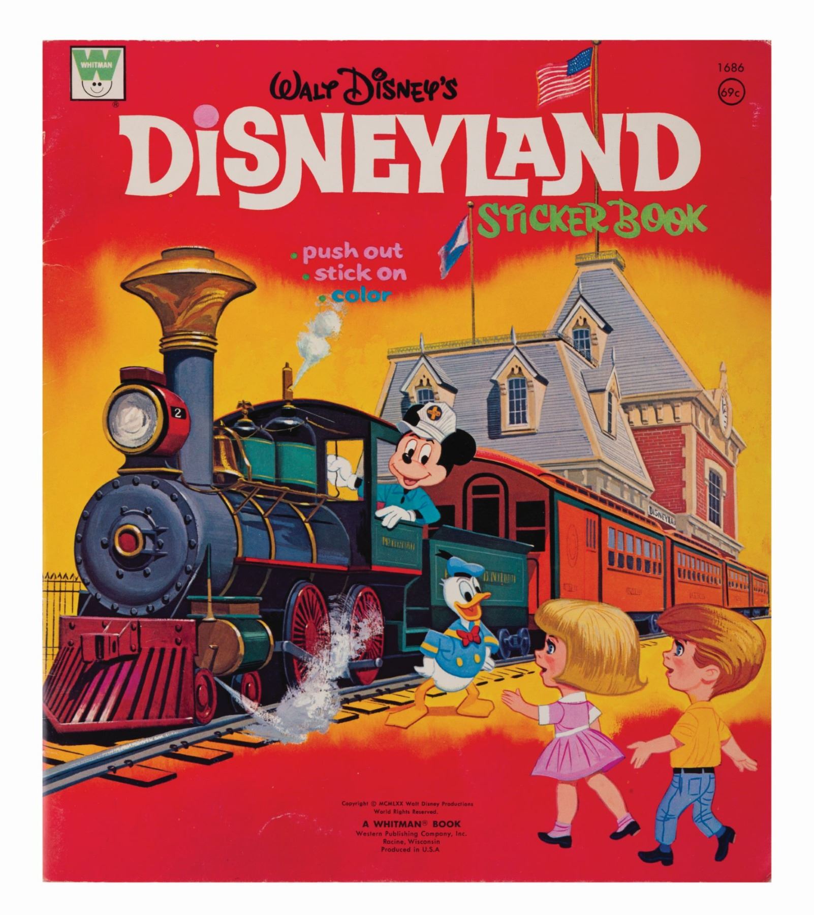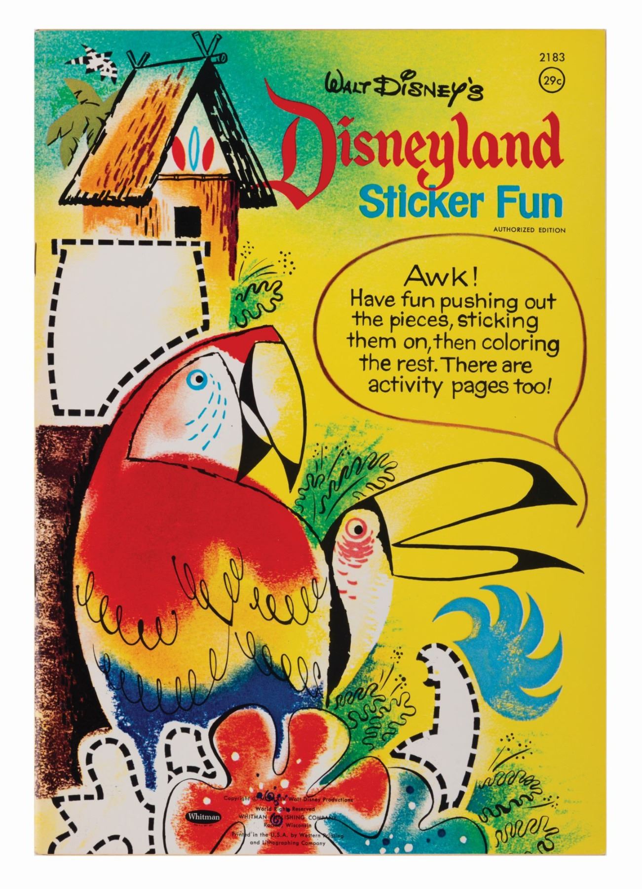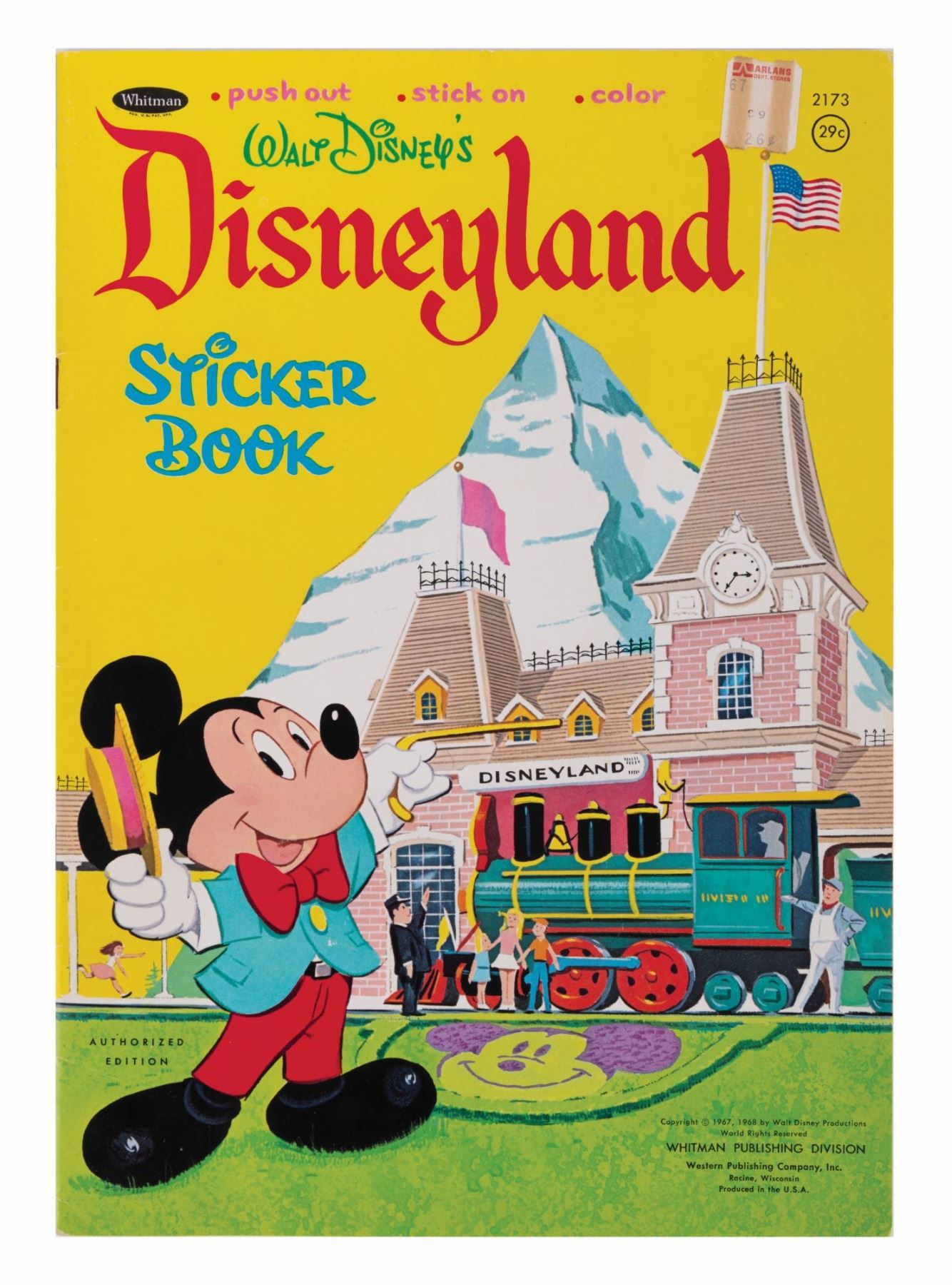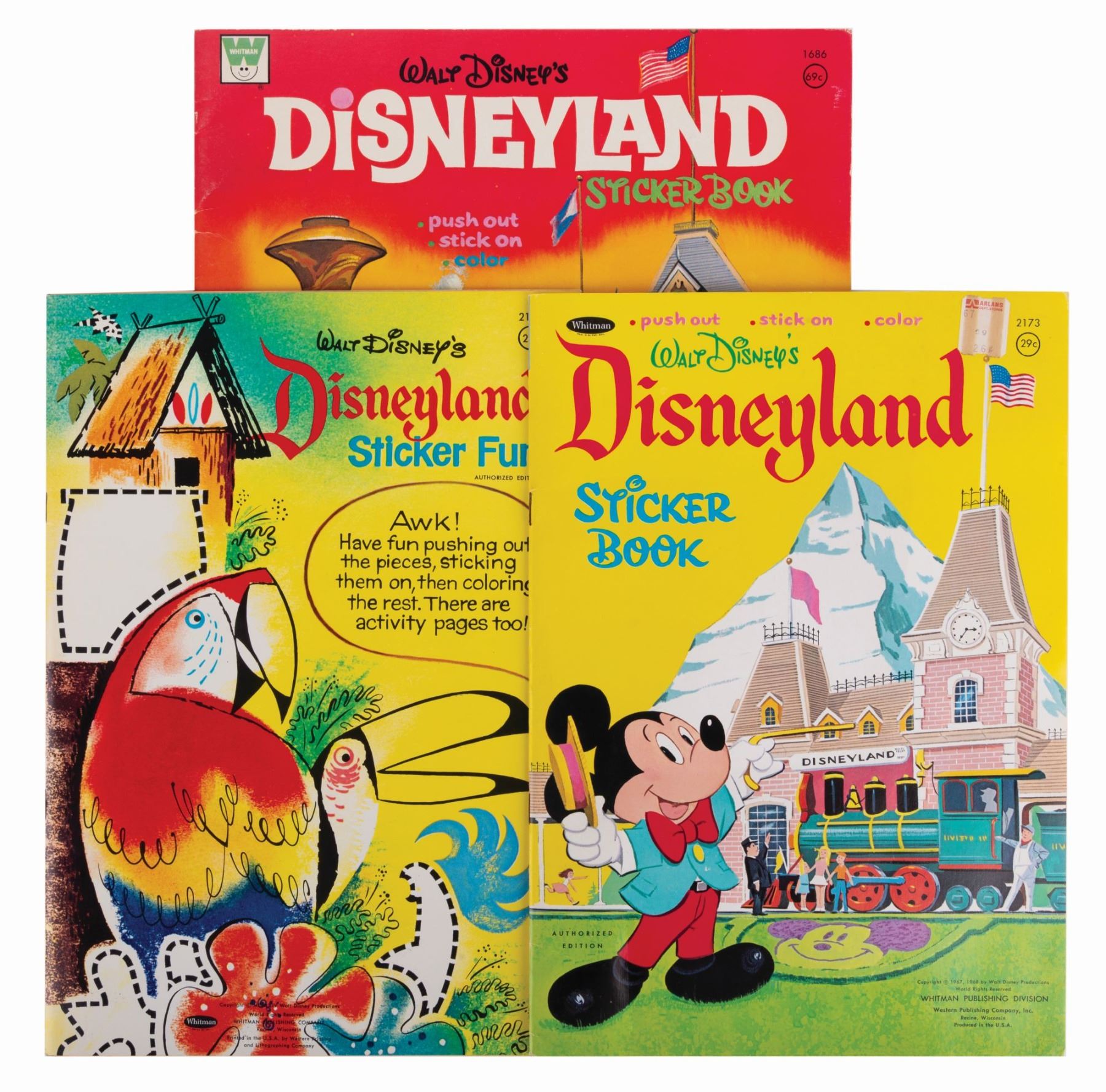 (Whitman, 1964-1970) A collection of three Disneyland sticker books featuring newly-opened attractions like the Tiki Room (calling it the "Tiki Hut") and The Haunted Mansion. The books all measure 12"x8.5" to 12"x10.25". Two books are in very good to fine condition, unused and complete, with slight edge wear. The 1968 book is in fair condition, with water damage, waviness, oxidation to staples, and some of the pages adhered together.