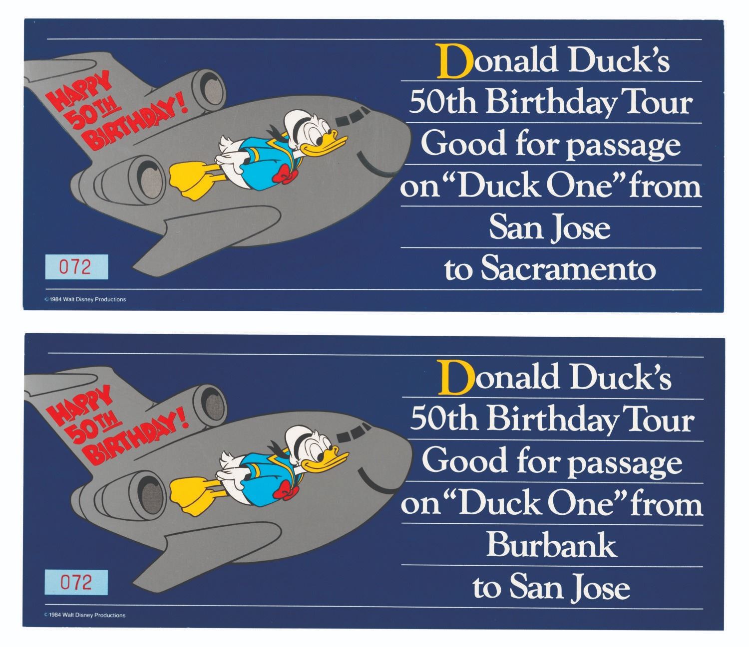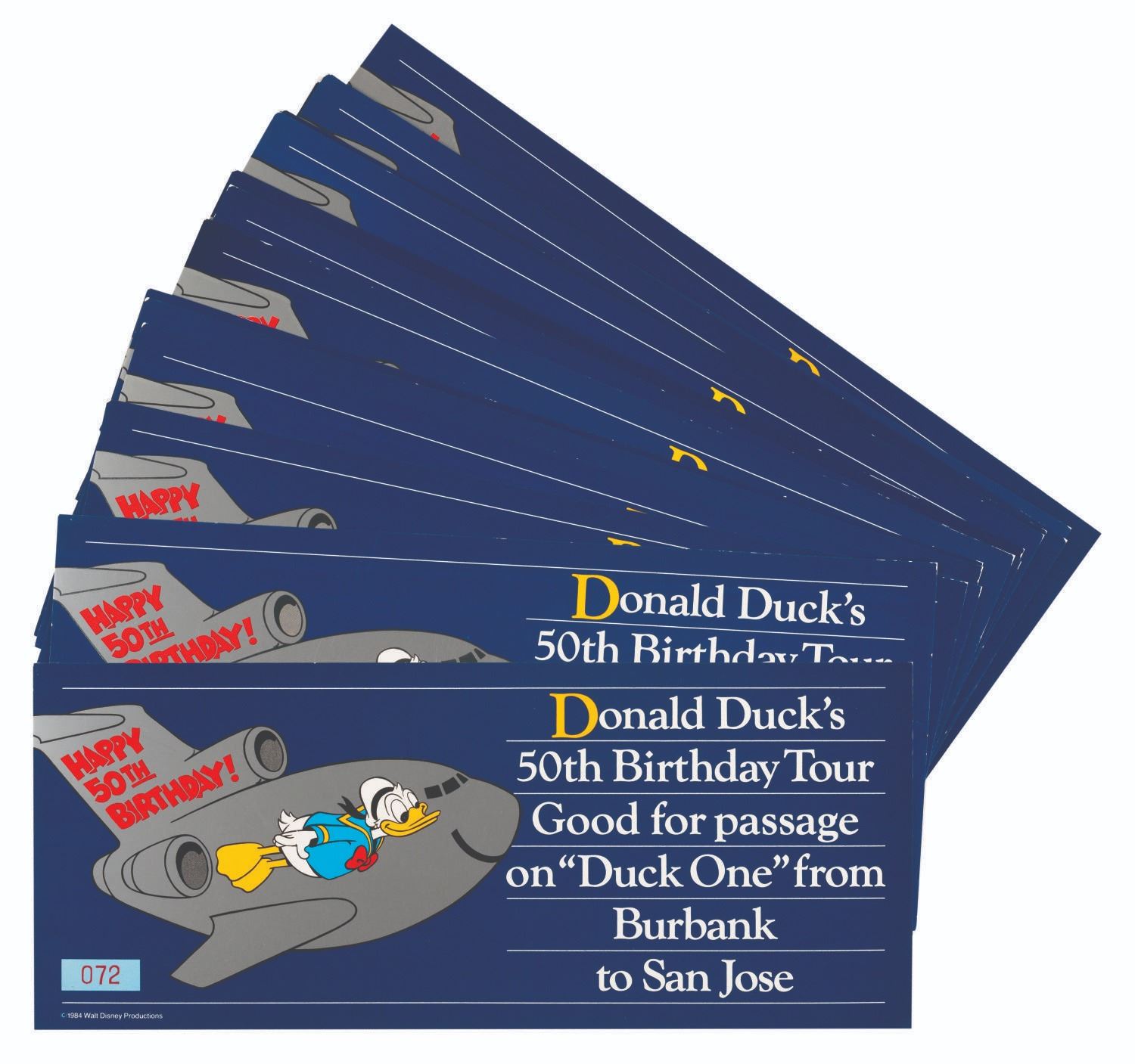 (Disney, 1984) A complete collection of 14 vouchers for passage aboard the "Duck One” plane during Donald Duck’s 50th Birthday Tour. The tour traveled to 15 cities across the nation, starting with a flight from Burbank to San Jose and ending with a trip from Dallas to Orange County, home of Disneyland. Every ticket is numbered 072 and is specific to each leg of the trip. Measuring 3.5" x 8.5" each, the vouchers are in good condition with light handling wear, including small scuffs to some edges.