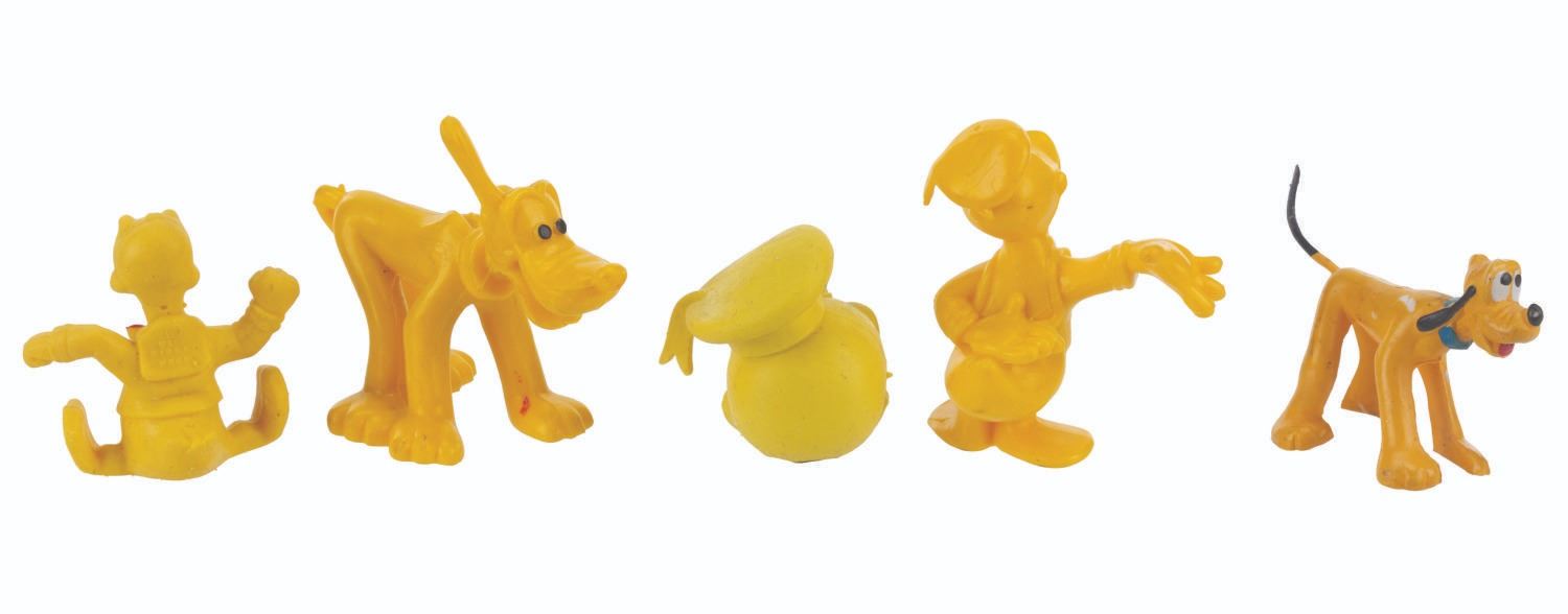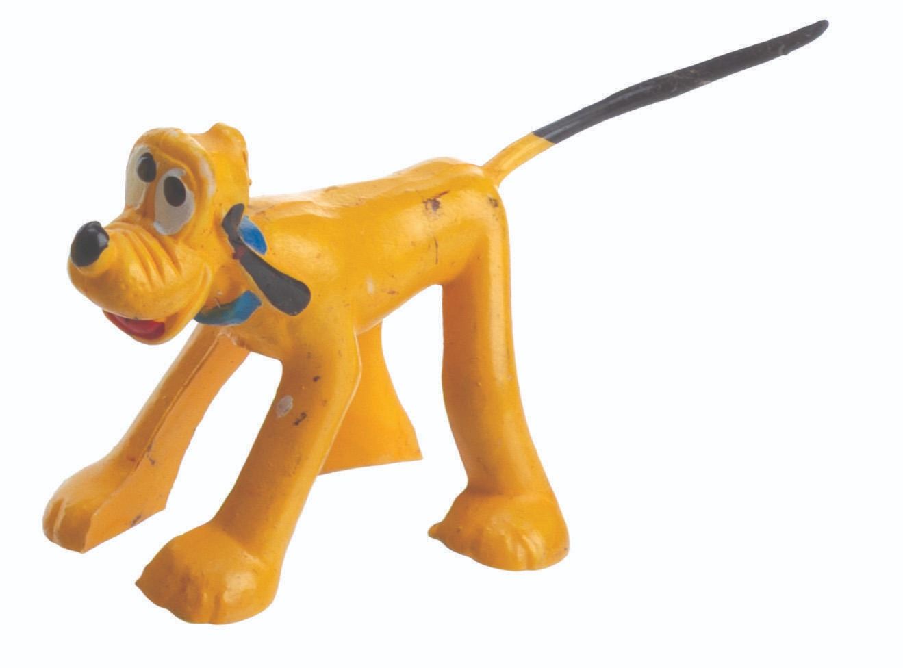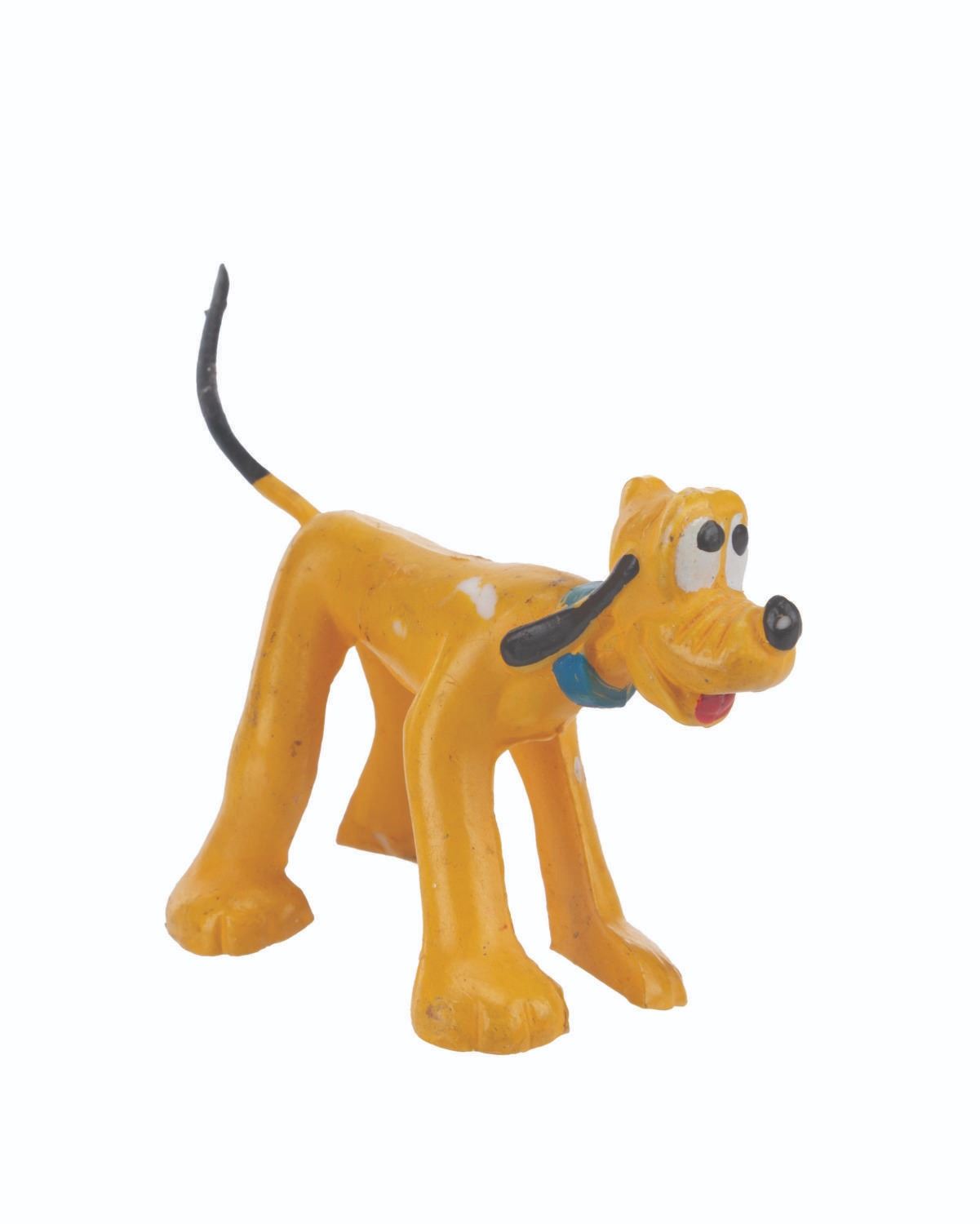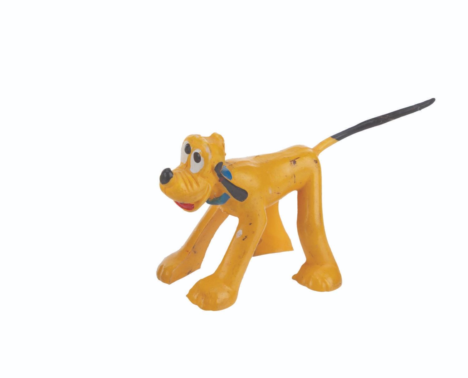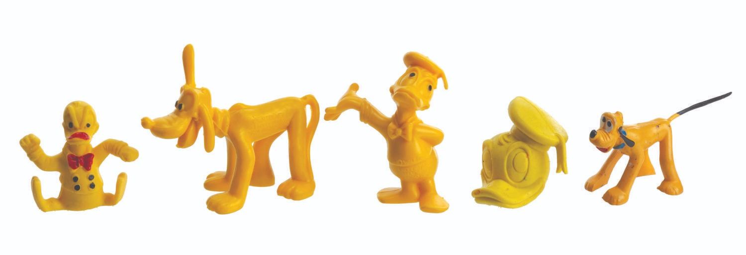 (Disney, 1960s-80s) A collection of three Donald Duck and two Pluto toys, including a Donald’s head pencil topper. The toys are in good condition with light wear from handling and age.