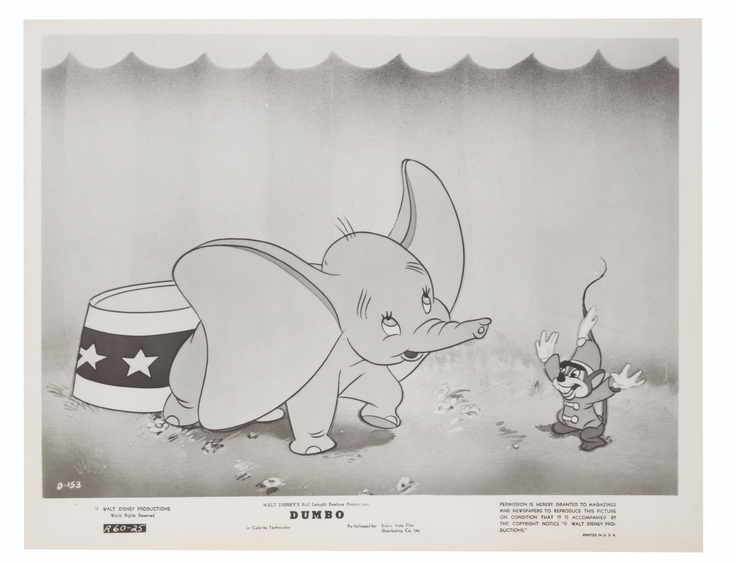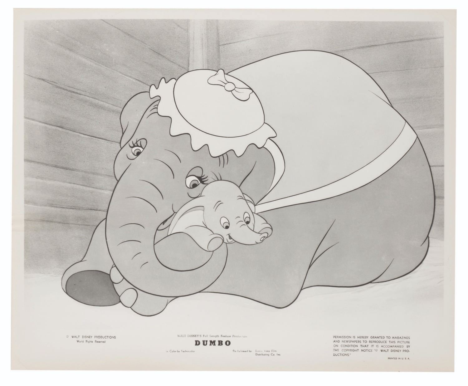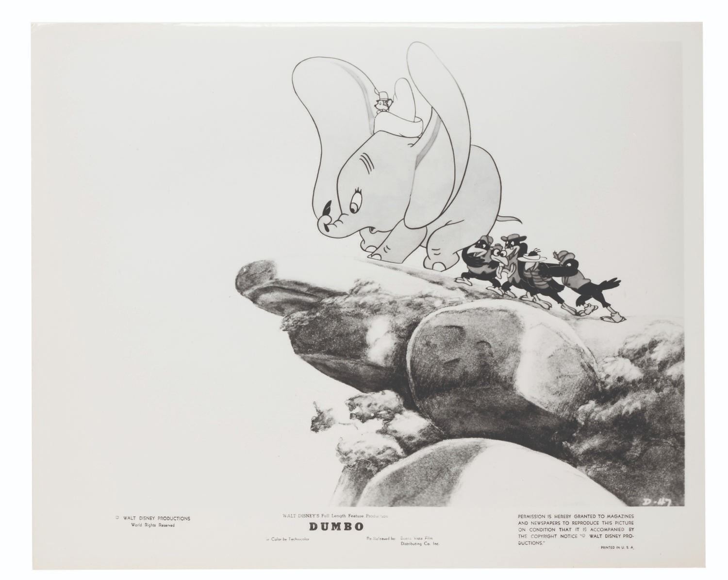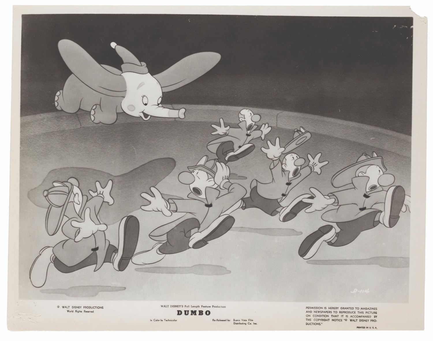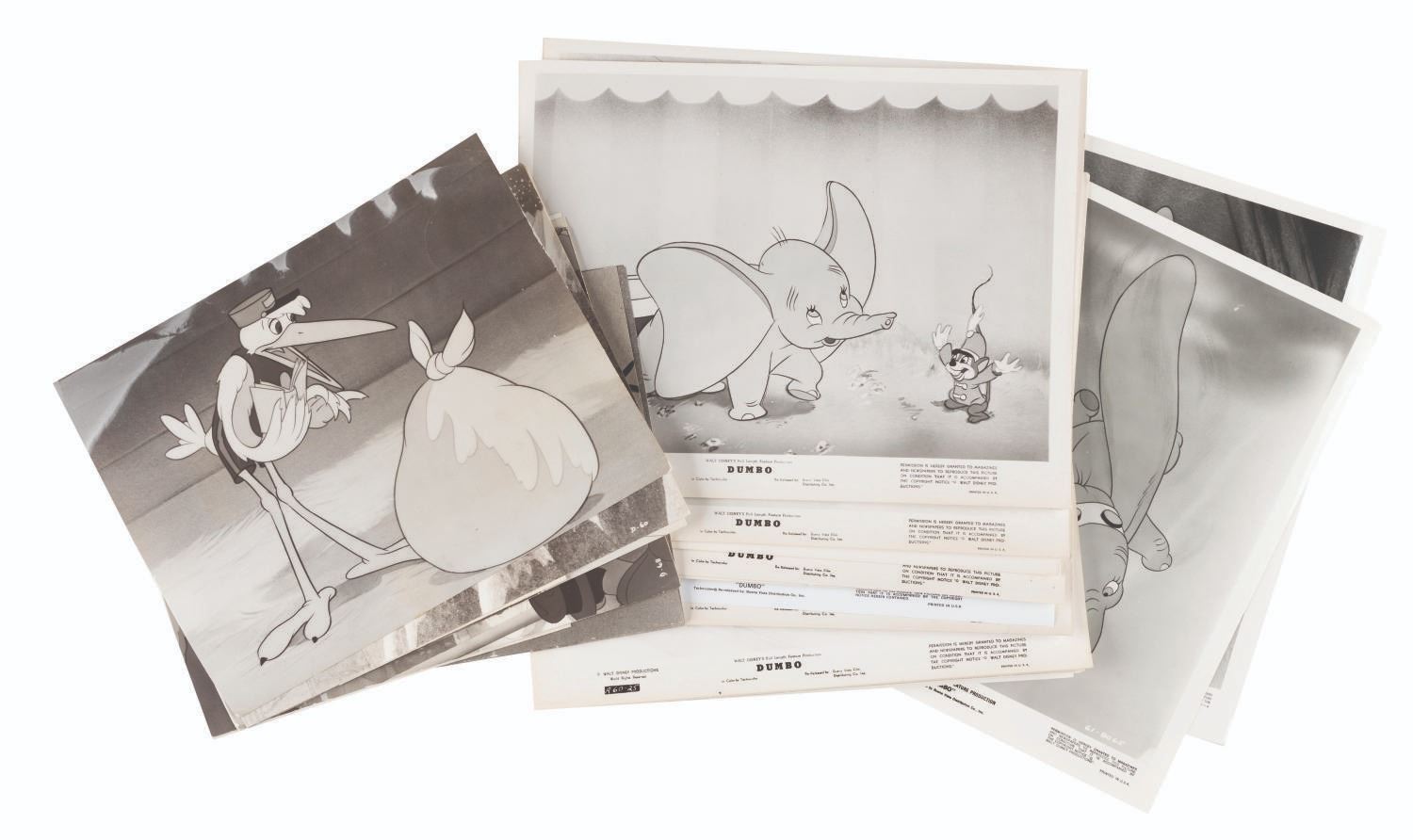 (Disney, 1941-80s) A collection of 26 black and white publicity stills from the animated feature "Dumbo." Eleven stills date to the original 1941 and 1949 releases through RKO Pictures, with the rest from later re-releases. The six earliest prints are stamped on the back from the files of a newspaper, with clipped examples of when they ran in the paper. Measuring from 6.25" x 9.25" to 8" x 10", the photos are in good to very good condition, many with wear from production use including edge wear and waviness.
