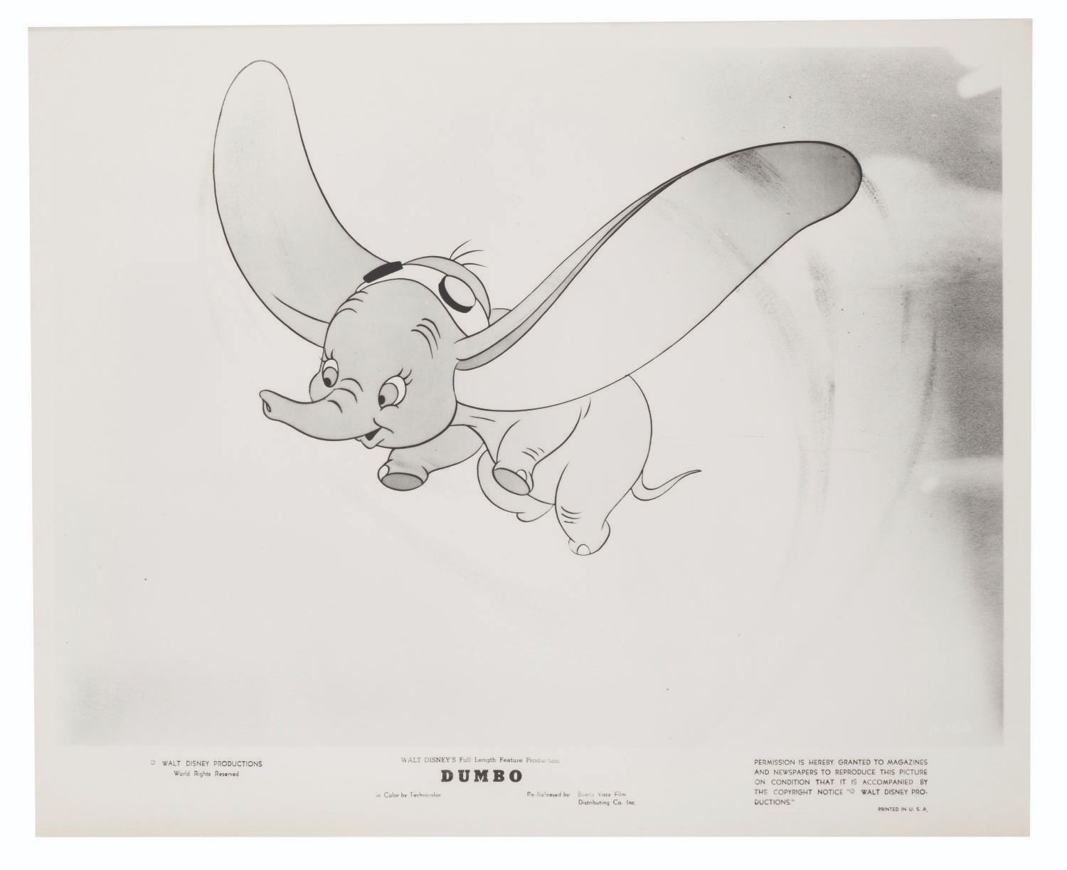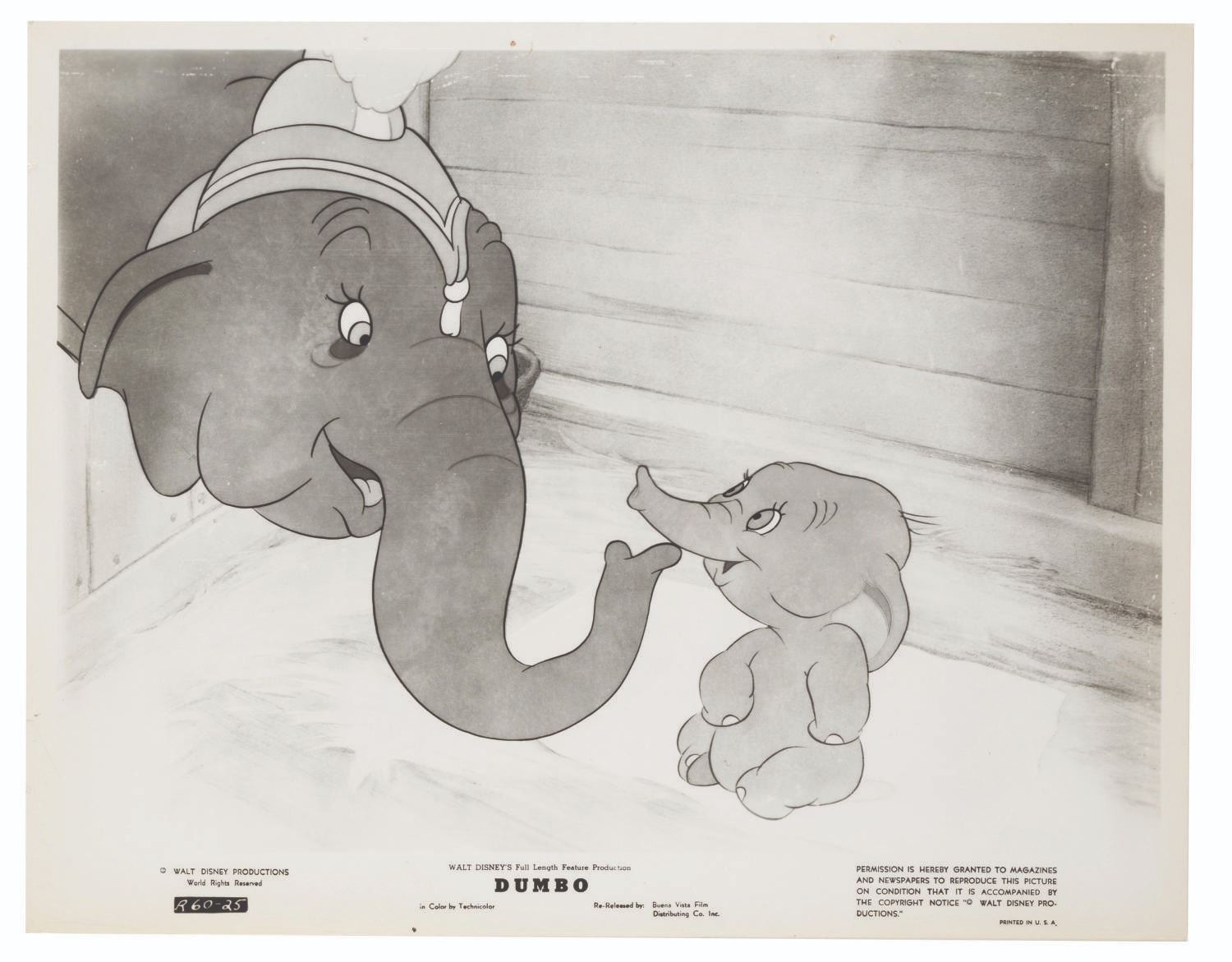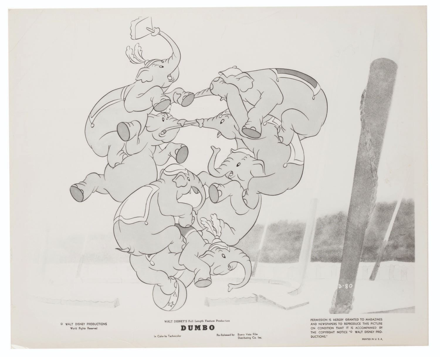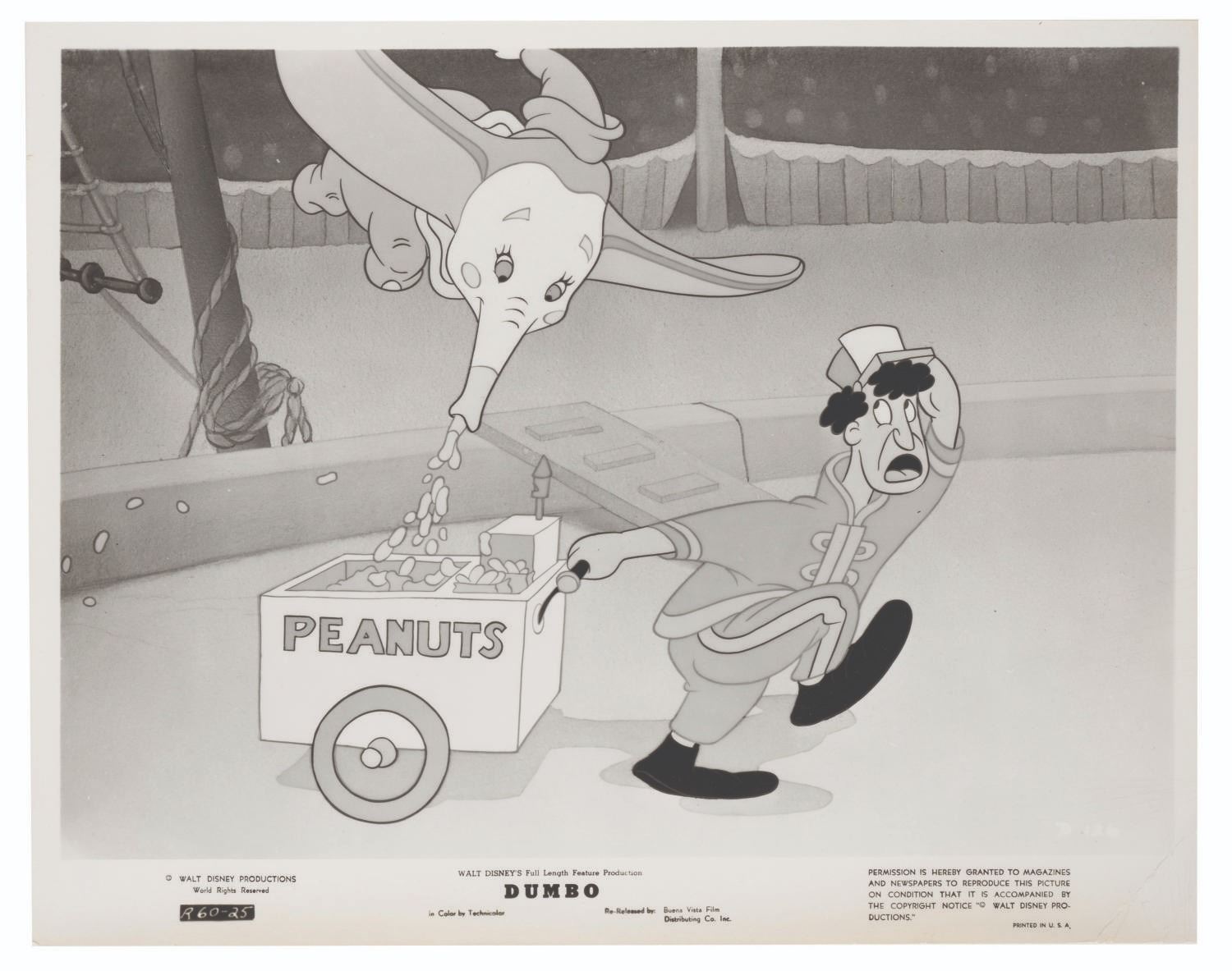 (Disney, 1941-80s) A collection of 26 black and white publicity stills from the animated feature "Dumbo." Eleven stills date to the original 1941 and 1949 releases through RKO Pictures, with the rest from later re-releases. The six earliest prints are stamped on the back from the files of a newspaper, with clipped examples of when they ran in the paper. Measuring from 6.25" x 9.25" to 8" x 10", the photos are in good to very good condition, many with wear from production use including edge wear and waviness.