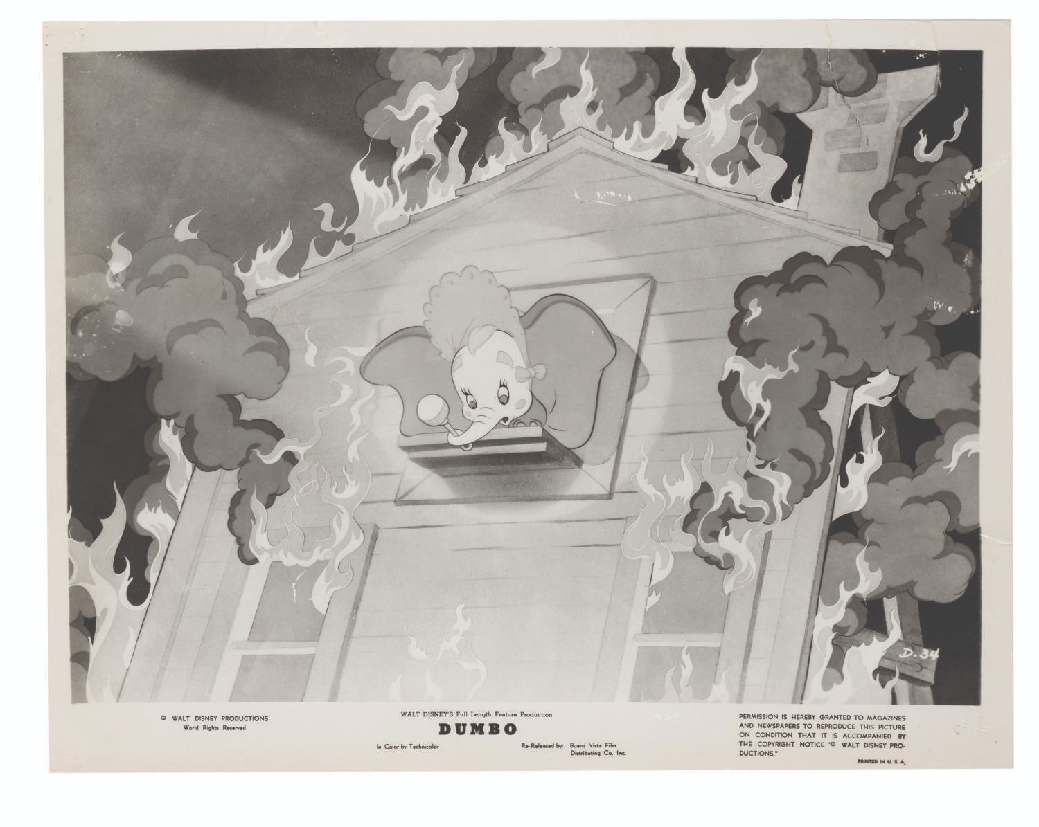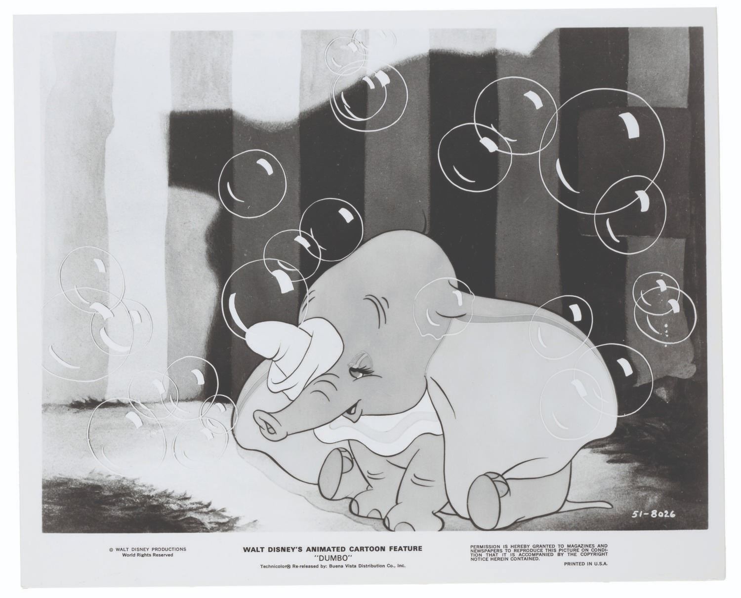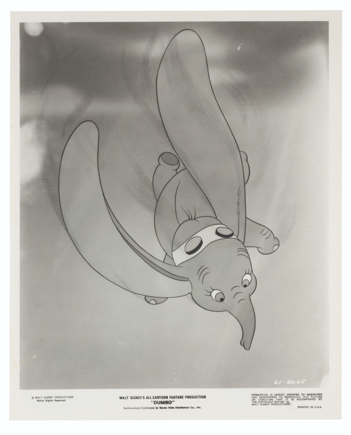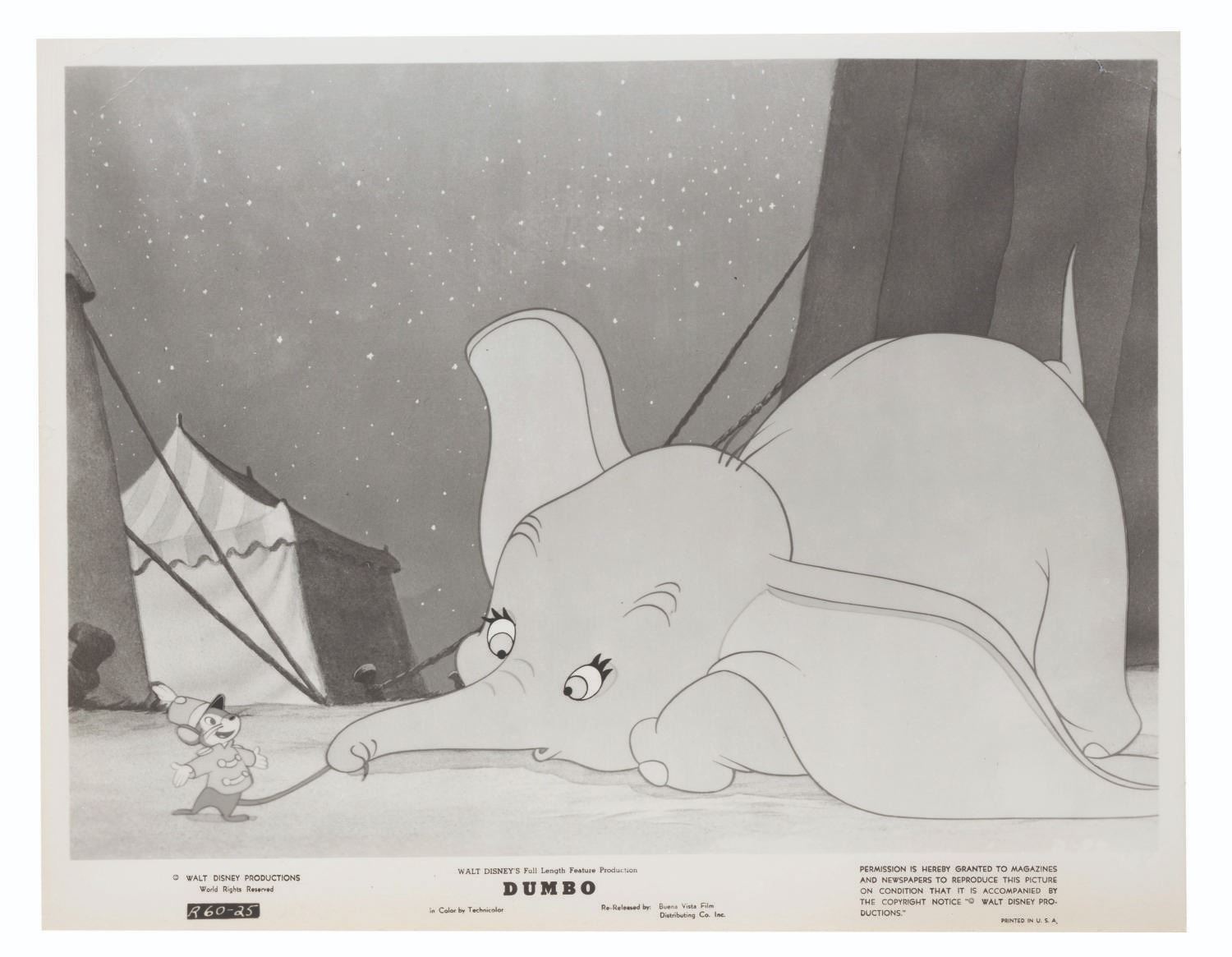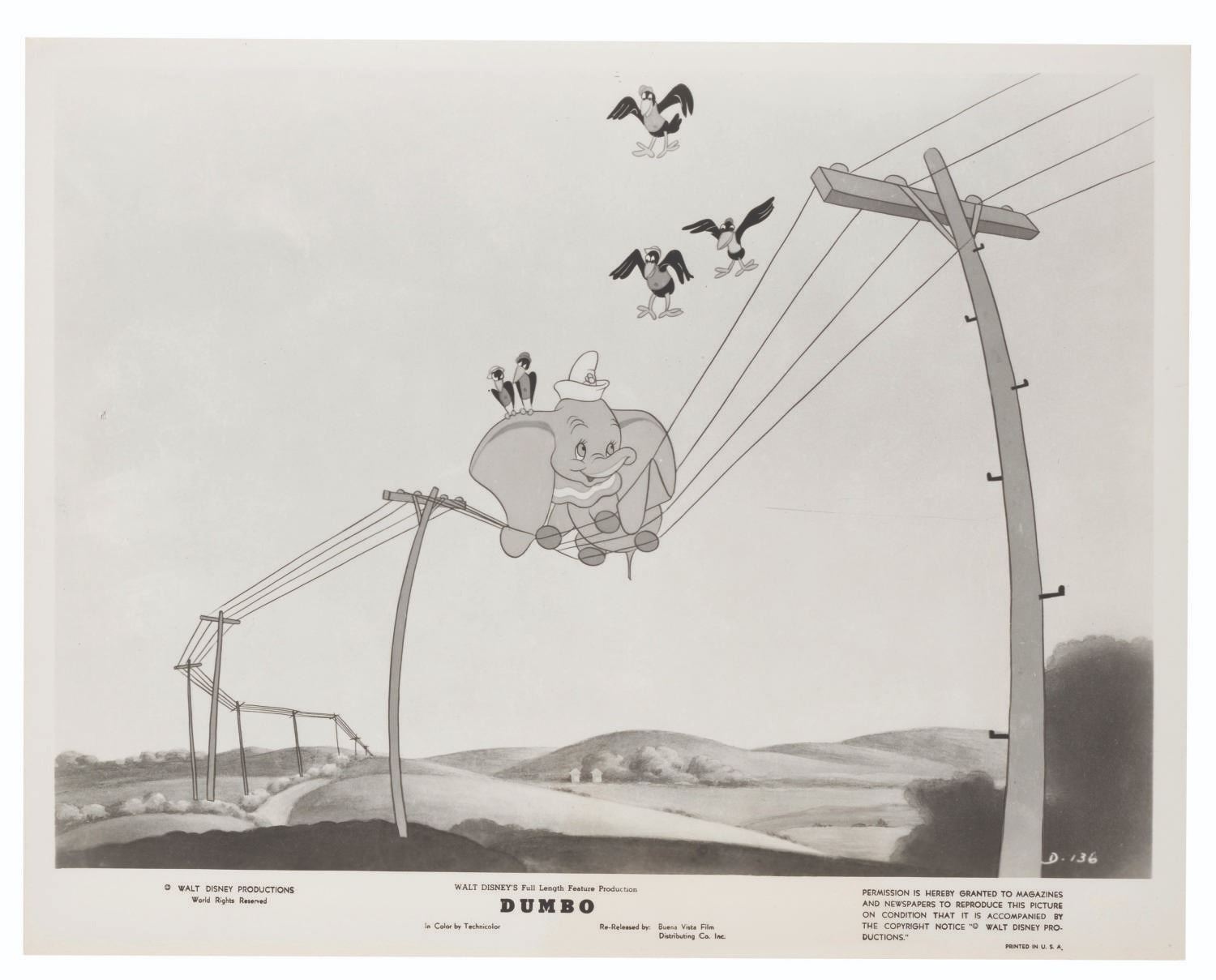 (Disney, 1941-80s) A collection of 26 black and white publicity stills from the animated feature "Dumbo." Eleven stills date to the original 1941 and 1949 releases through RKO Pictures, with the rest from later re-releases. The six earliest prints are stamped on the back from the files of a newspaper, with clipped examples of when they ran in the paper. Measuring from 6.25" x 9.25" to 8" x 10", the photos are in good to very good condition, many with wear from production use including edge wear and waviness.