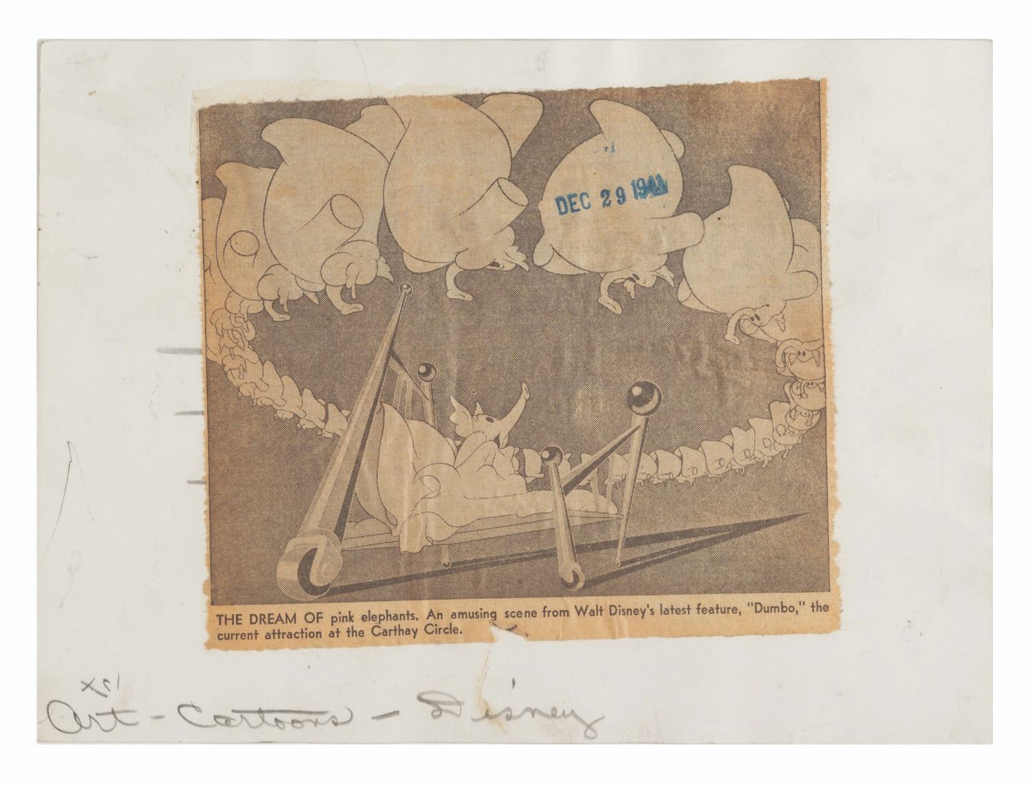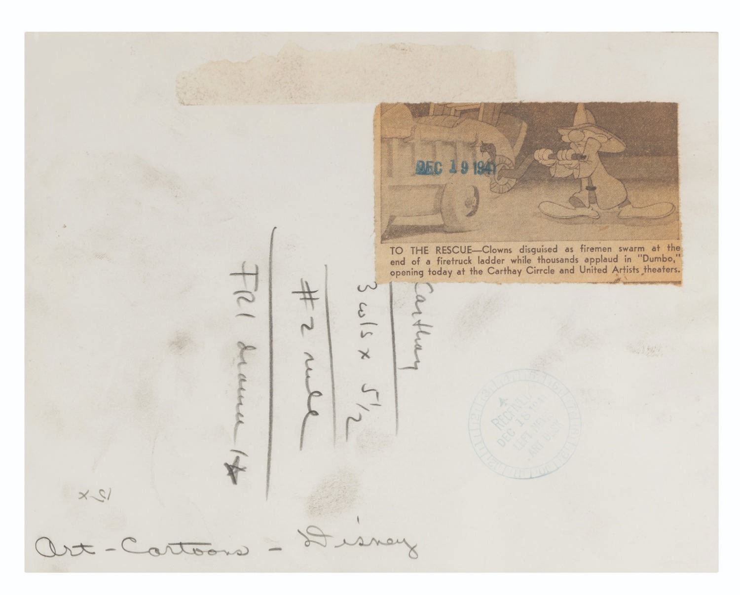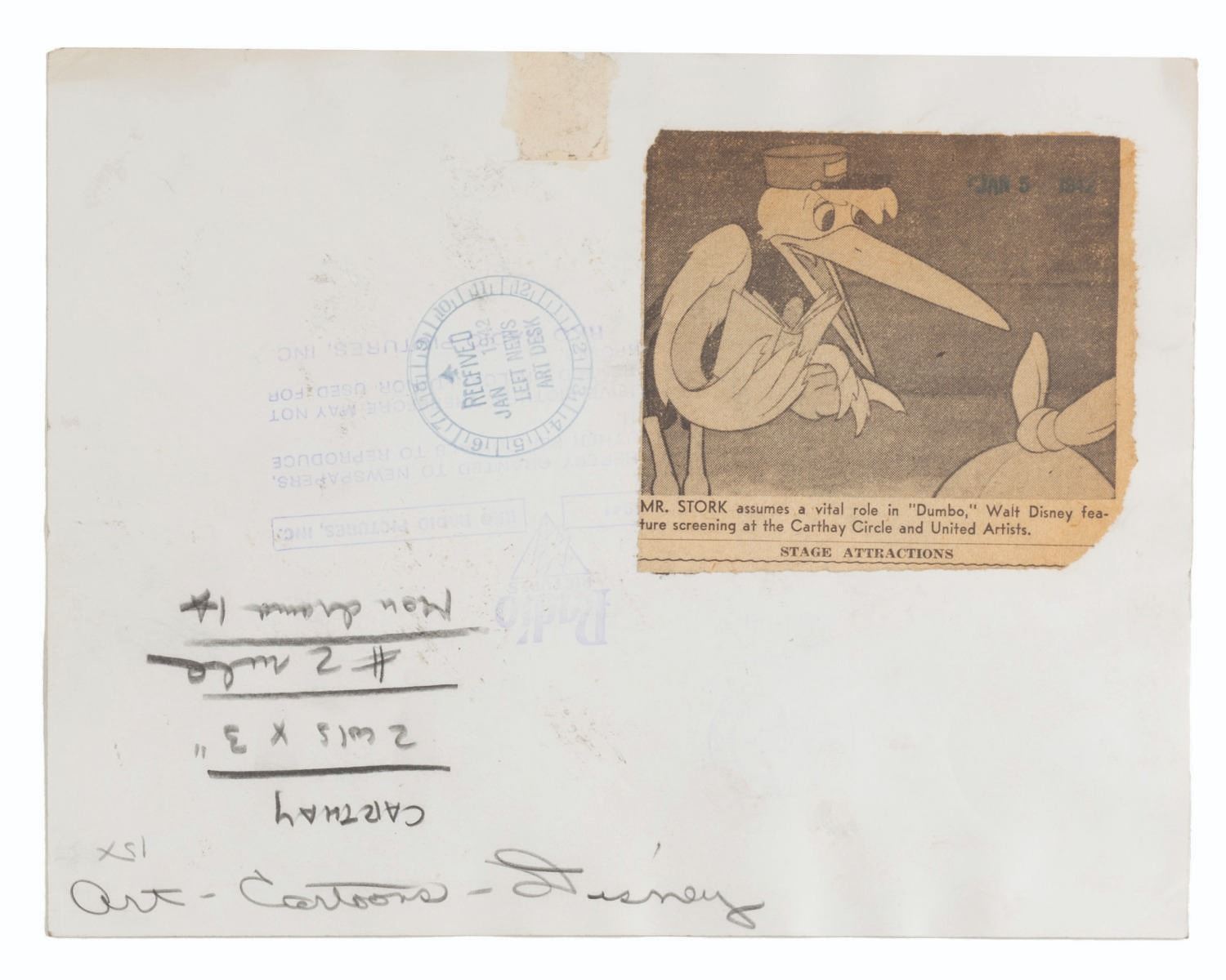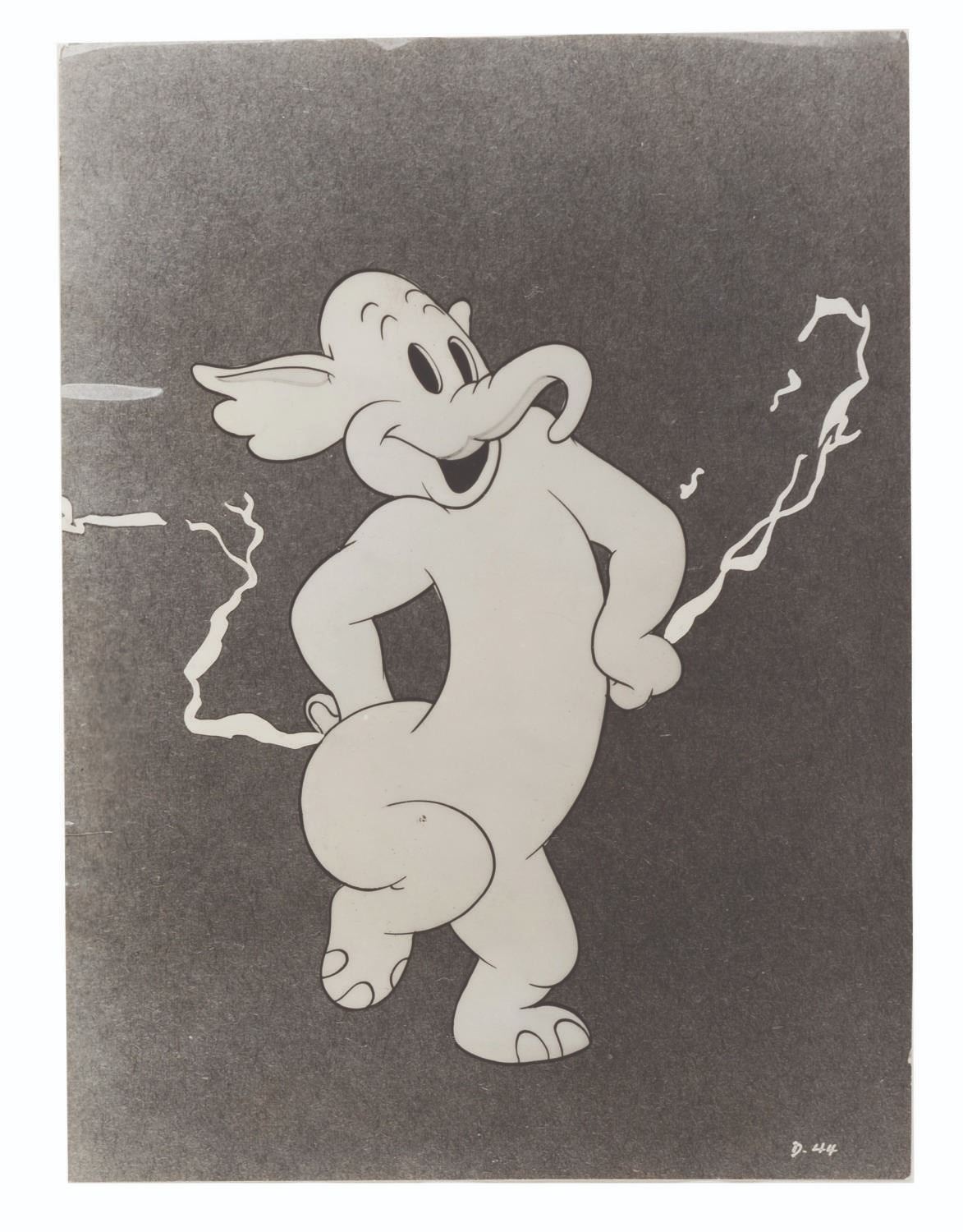 (Disney, 1941-80s) A collection of 26 black and white publicity stills from the animated feature "Dumbo." Eleven stills date to the original 1941 and 1949 releases through RKO Pictures, with the rest from later re-releases. The six earliest prints are stamped on the back from the files of a newspaper, with clipped examples of when they ran in the paper. Measuring from 6.25" x 9.25" to 8" x 10", the photos are in good to very good condition, many with wear from production use including edge wear and waviness.