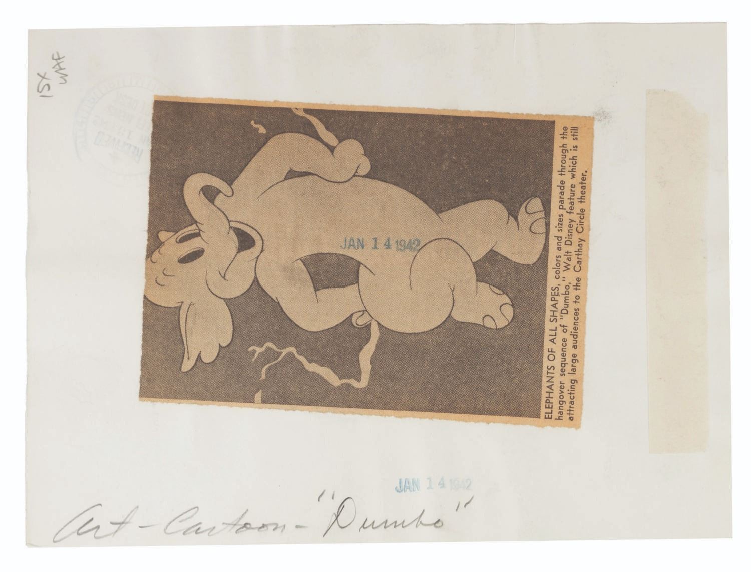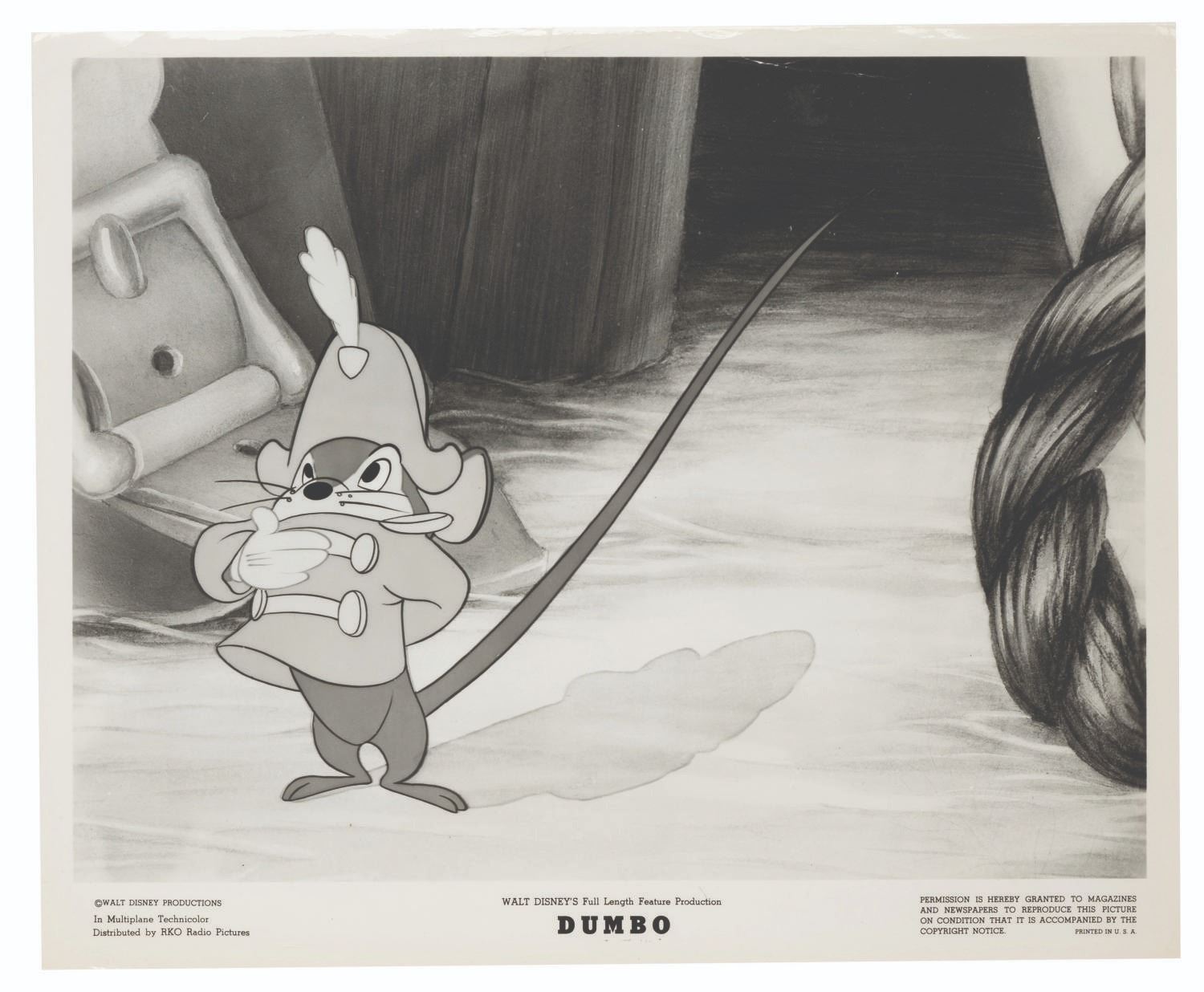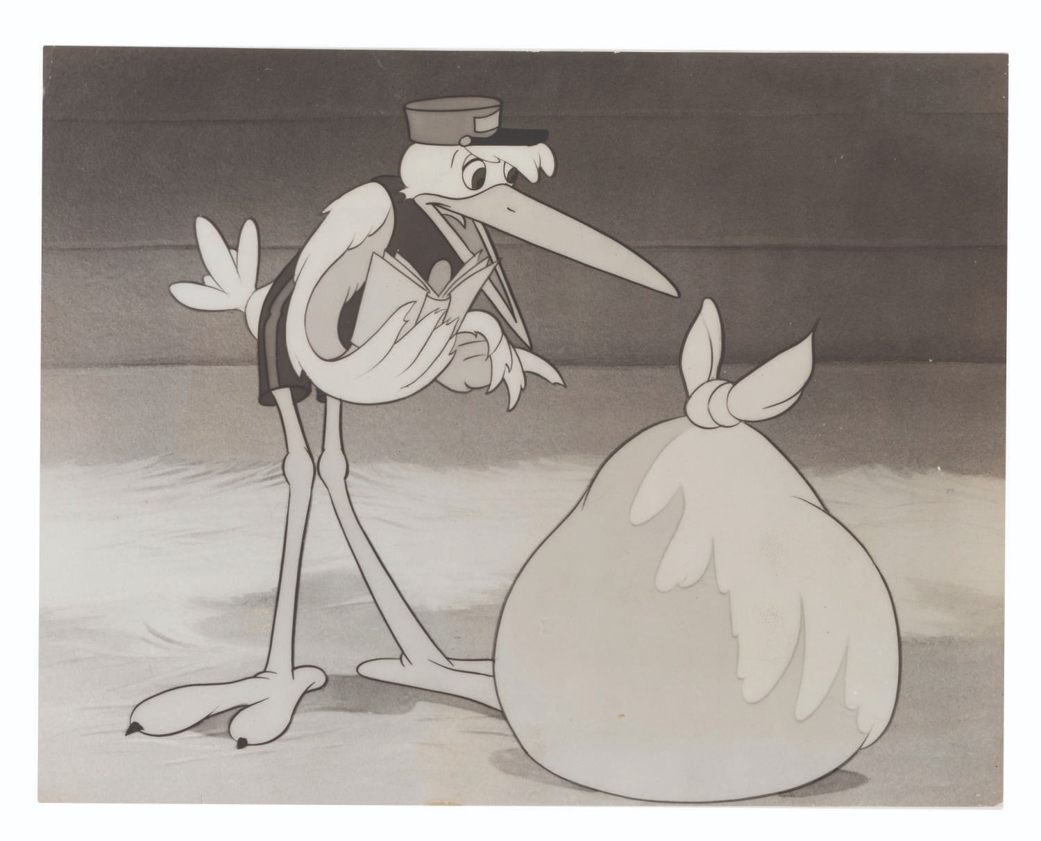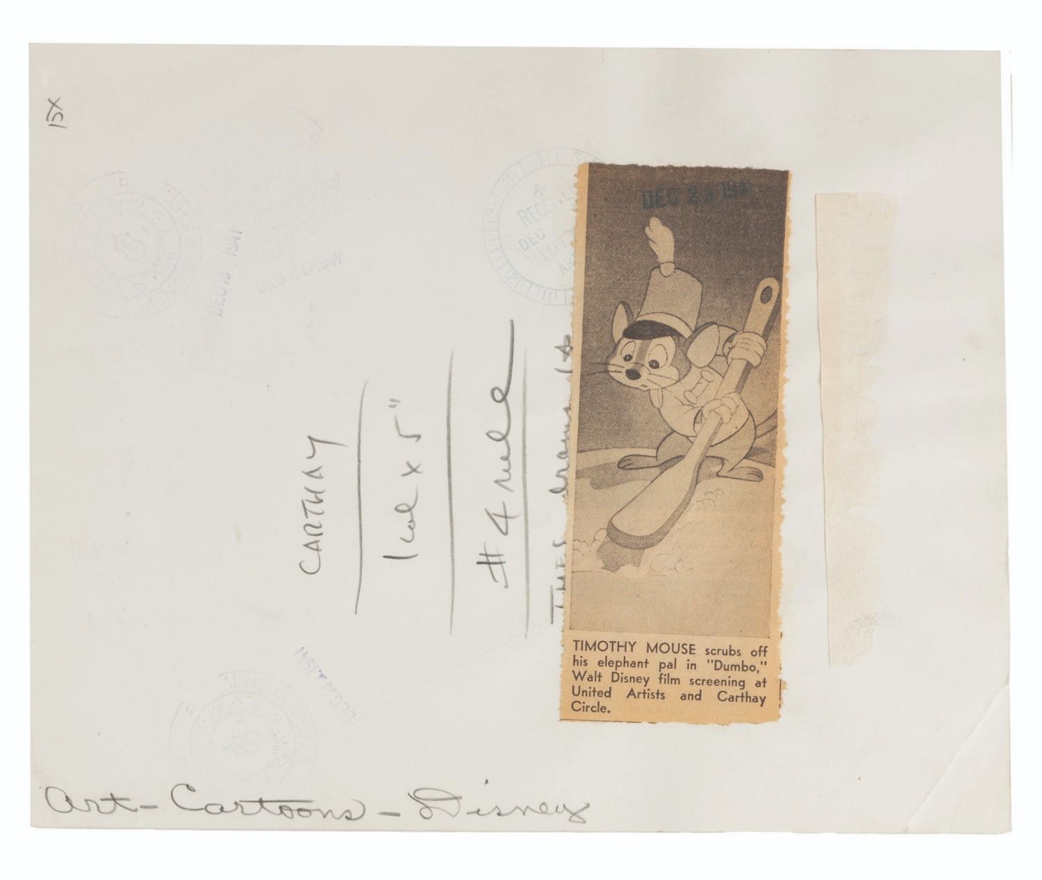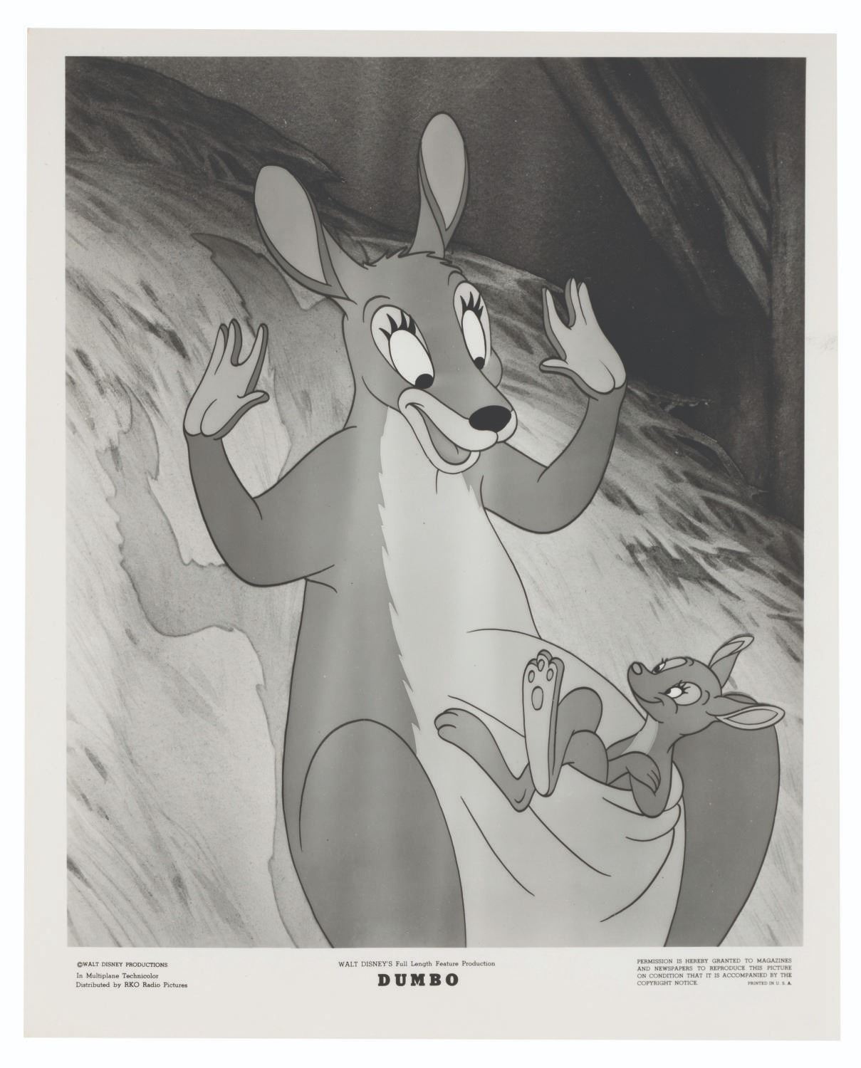 (Disney, 1941-80s) A collection of 26 black and white publicity stills from the animated feature "Dumbo." Eleven stills date to the original 1941 and 1949 releases through RKO Pictures, with the rest from later re-releases. The six earliest prints are stamped on the back from the files of a newspaper, with clipped examples of when they ran in the paper. Measuring from 6.25" x 9.25" to 8" x 10", the photos are in good to very good condition, many with wear from production use including edge wear and waviness.
