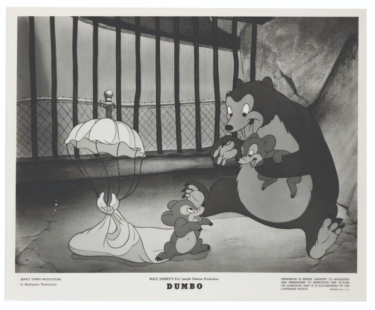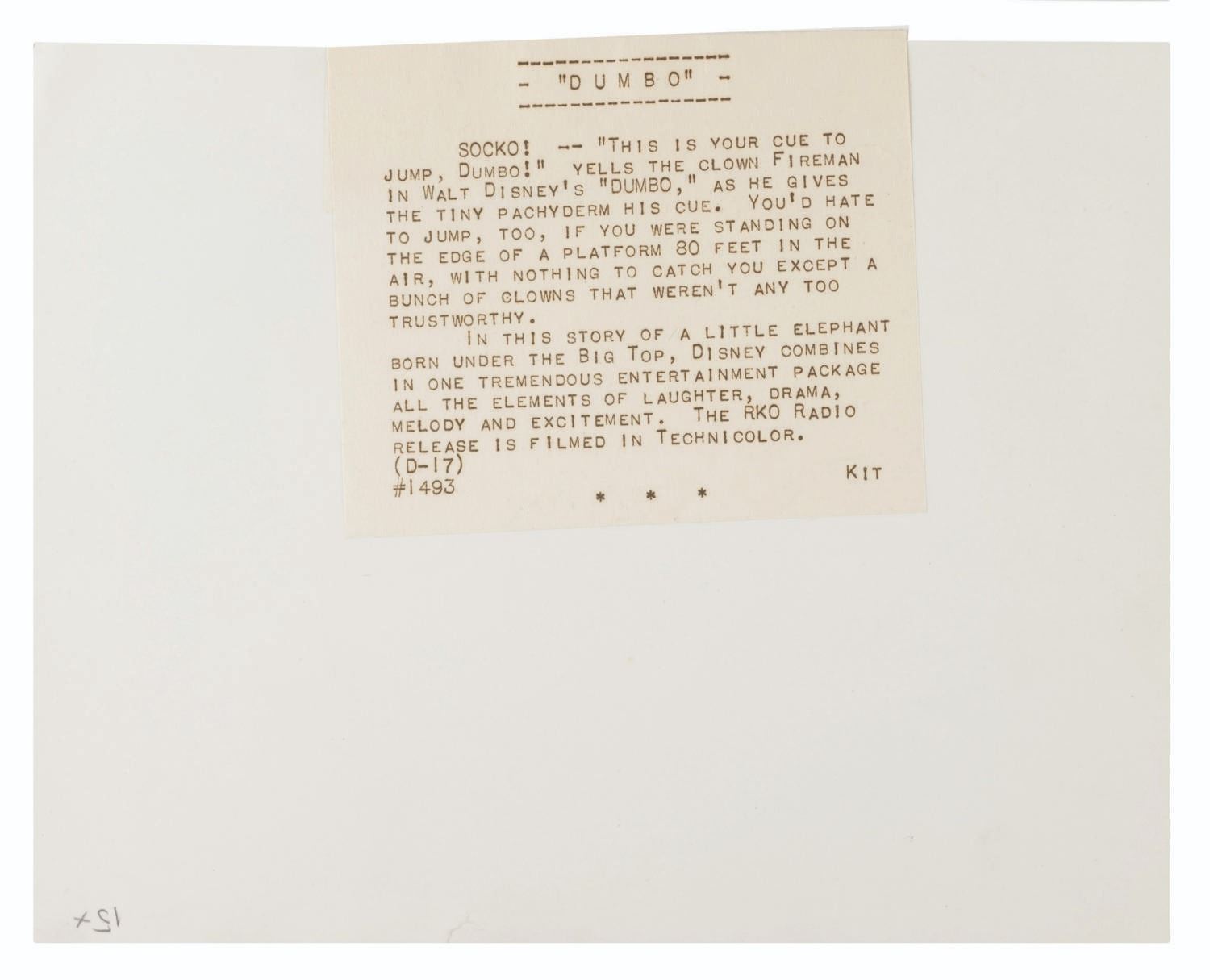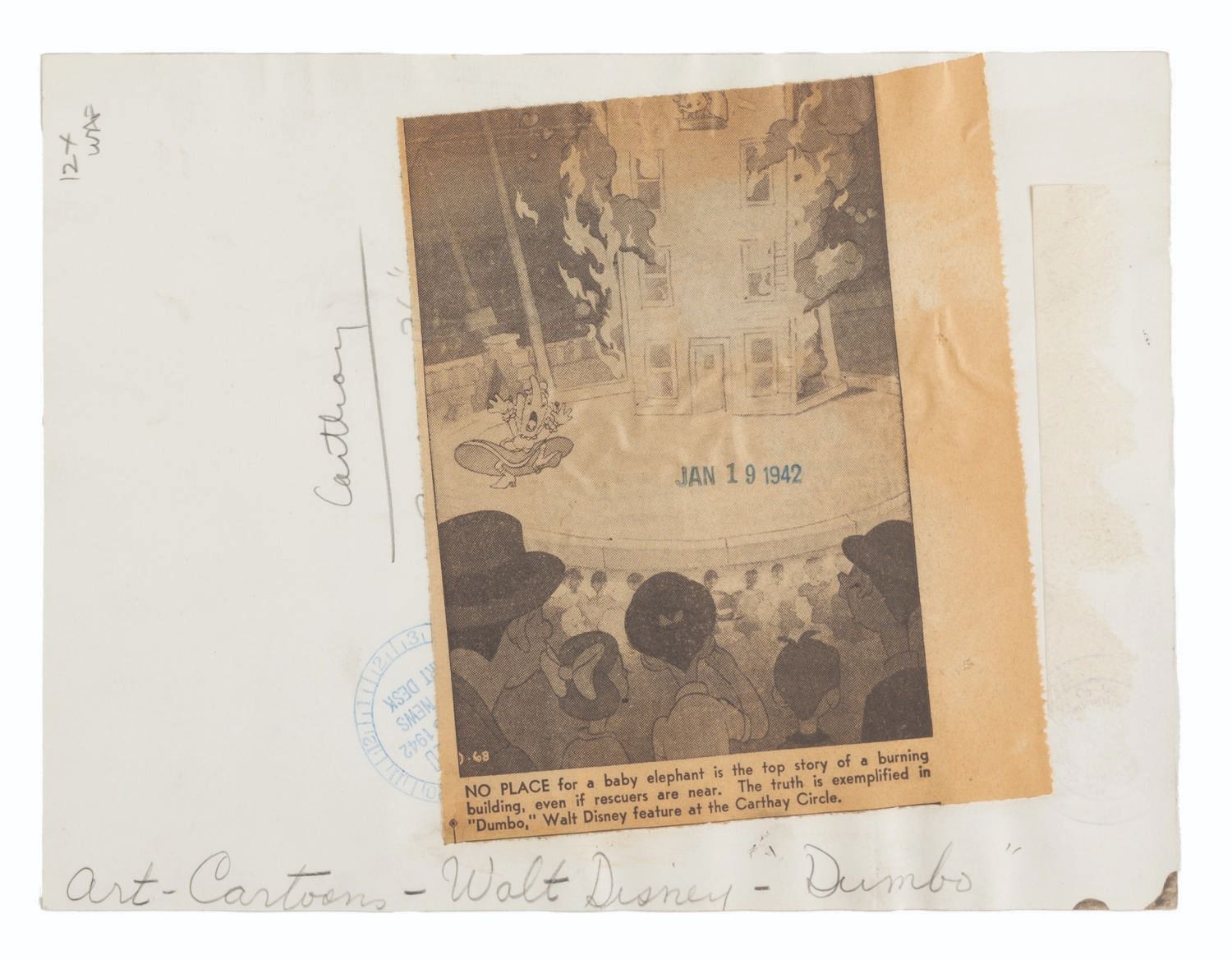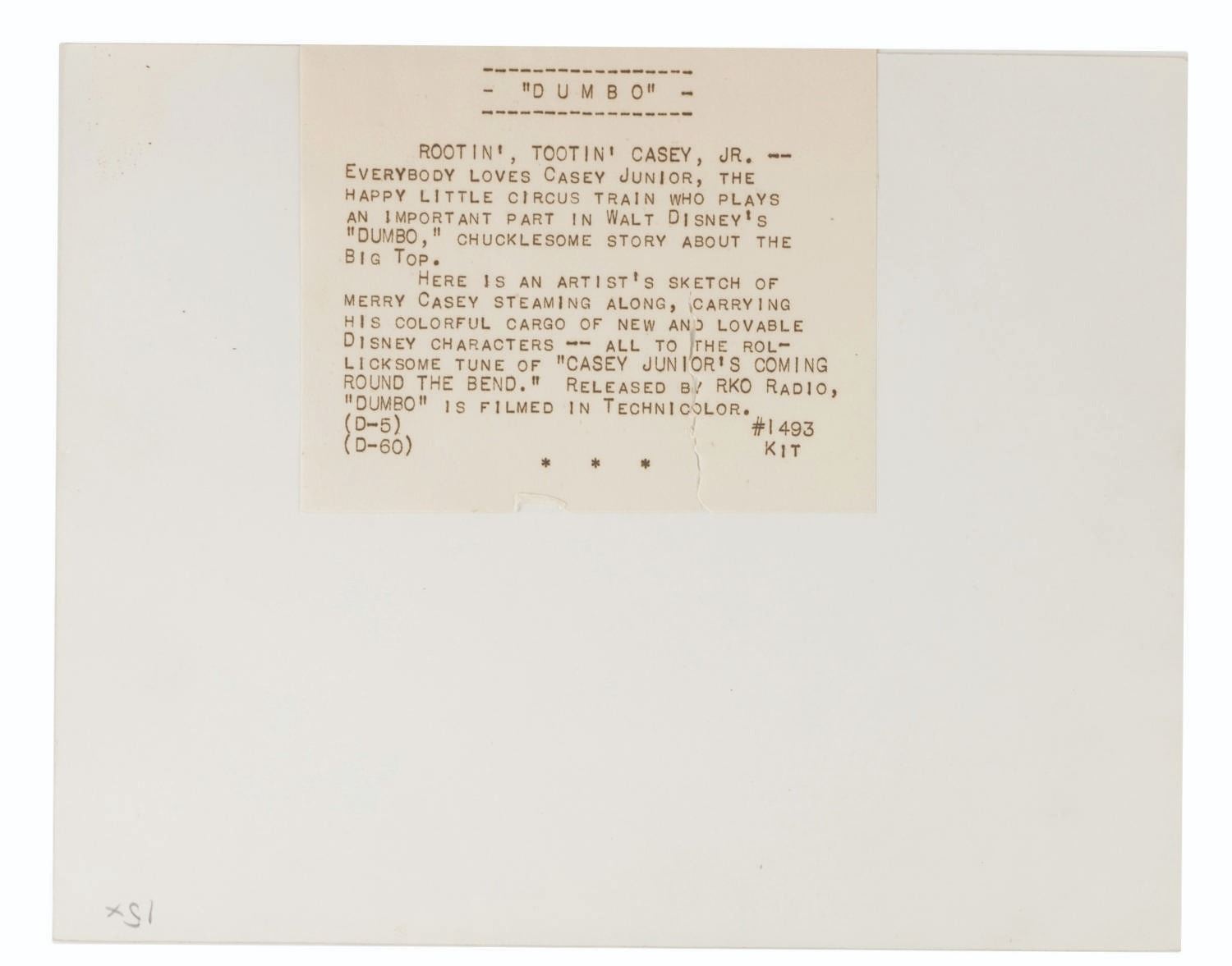 (Disney, 1941-80s) A collection of 26 black and white publicity stills from the animated feature "Dumbo." Eleven stills date to the original 1941 and 1949 releases through RKO Pictures, with the rest from later re-releases. The six earliest prints are stamped on the back from the files of a newspaper, with clipped examples of when they ran in the paper. Measuring from 6.25" x 9.25" to 8" x 10", the photos are in good to very good condition, many with wear from production use including edge wear and waviness.