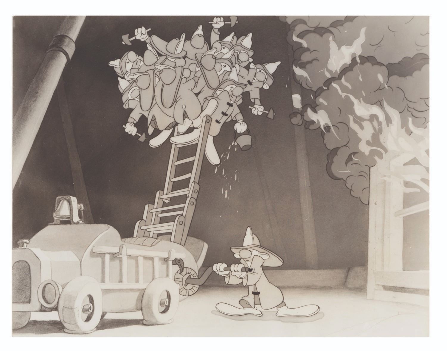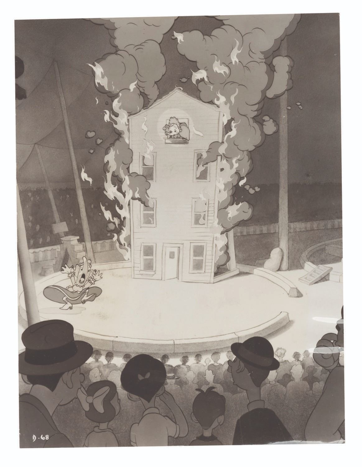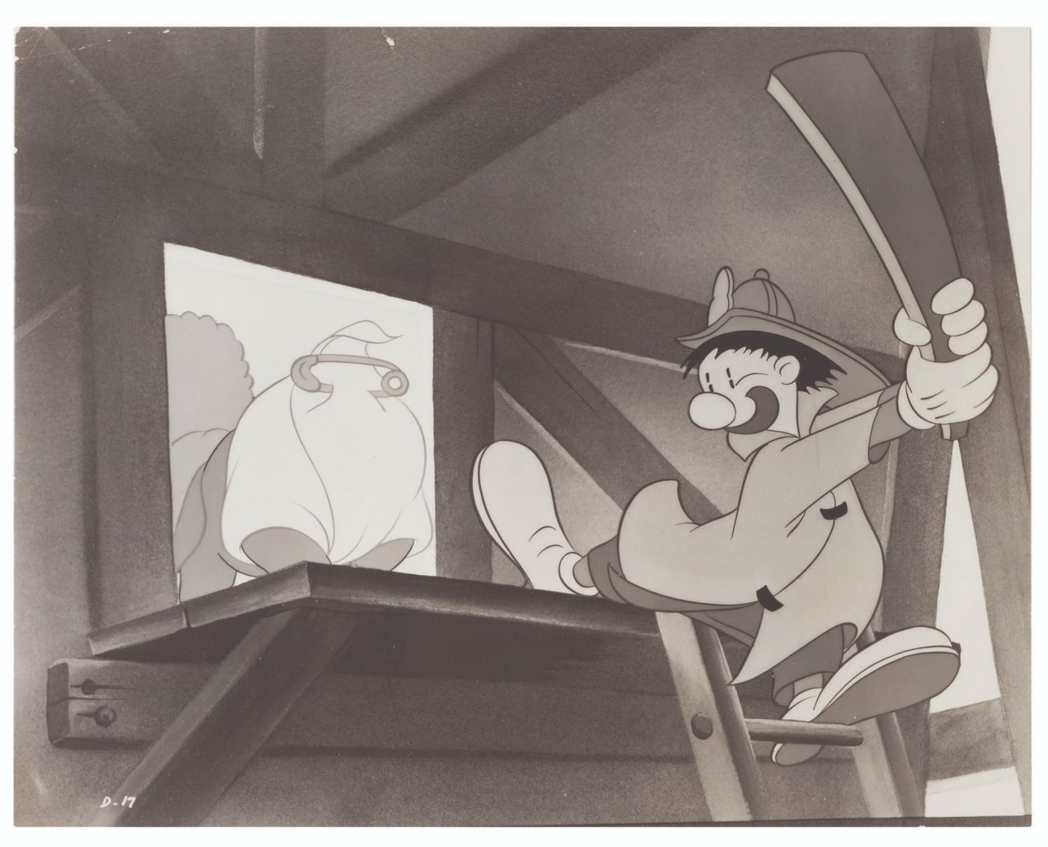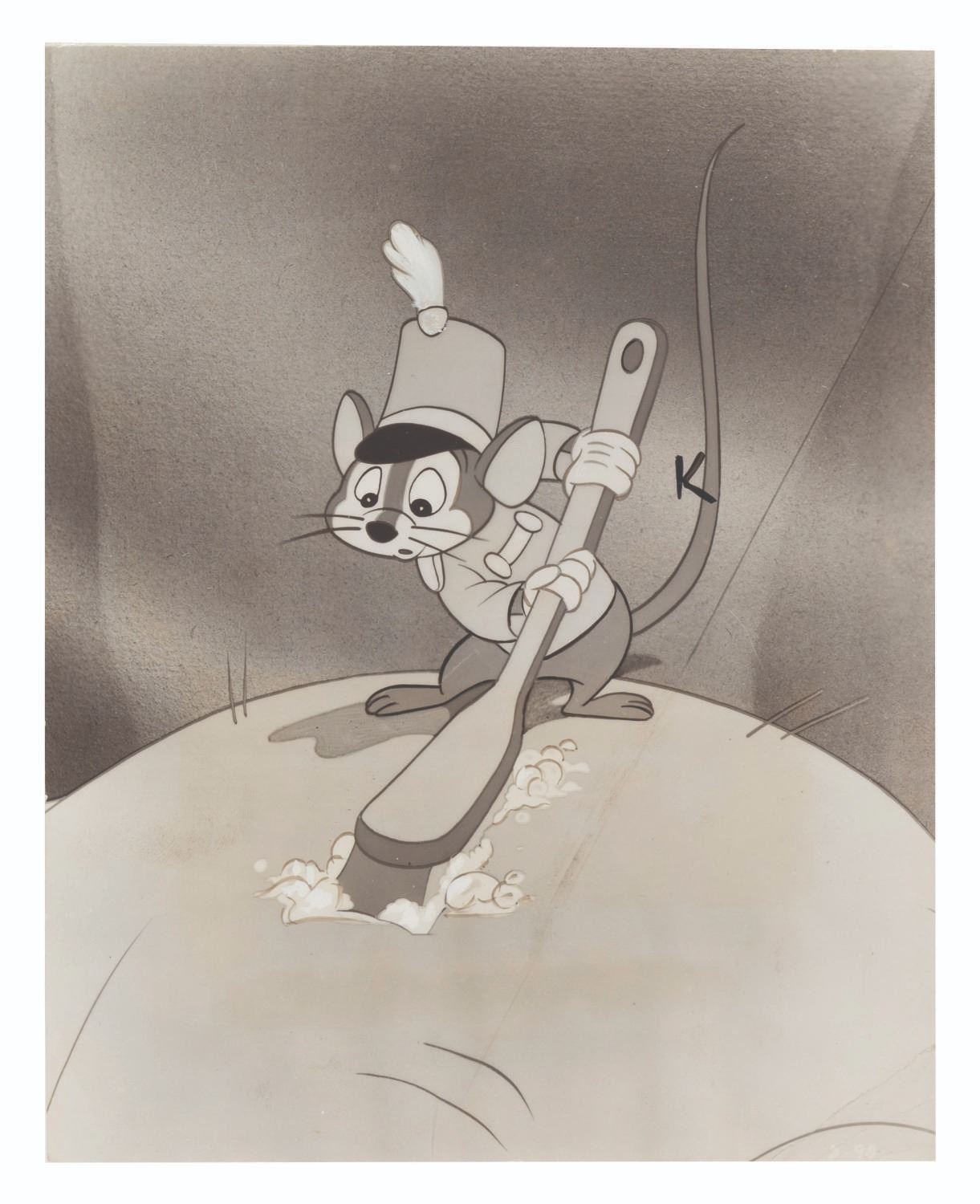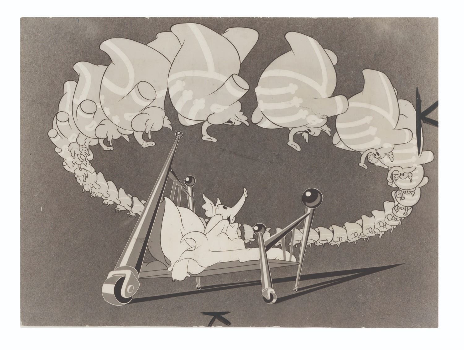 (Disney, 1941-80s) A collection of 26 black and white publicity stills from the animated feature "Dumbo." Eleven stills date to the original 1941 and 1949 releases through RKO Pictures, with the rest from later re-releases. The six earliest prints are stamped on the back from the files of a newspaper, with clipped examples of when they ran in the paper. Measuring from 6.25" x 9.25" to 8" x 10", the photos are in good to very good condition, many with wear from production use including edge wear and waviness.