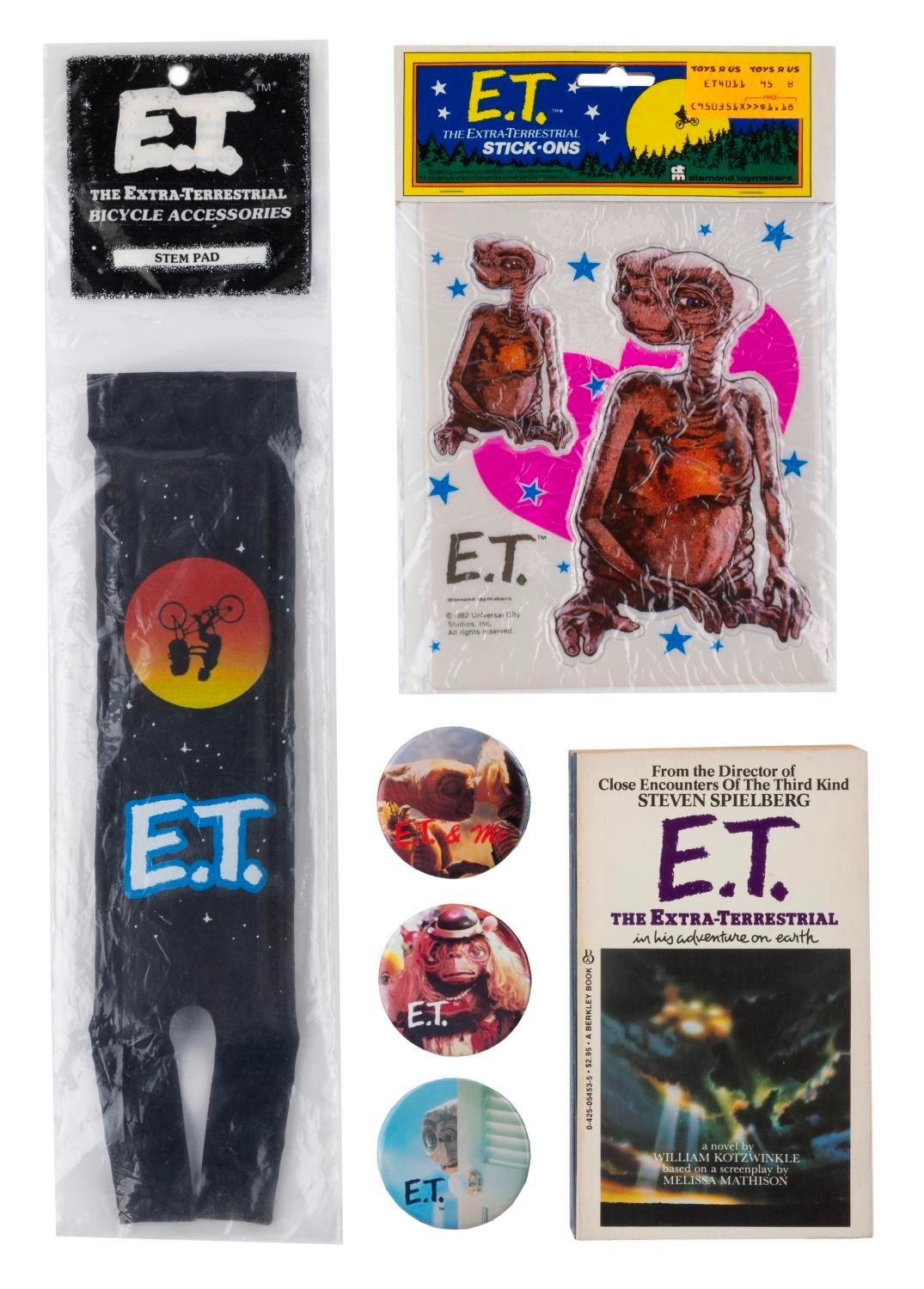 (Universal, 1982) A collection of “E.T.” merchandise including three photo buttons, a bicycle stem pad, large puffy “stick-ons,” and the novelization of the film in paperback. Measuring from the 2.25” diameter buttons to the 2.75” x 12” stem pad, the collection is in very good condition with light edge wear to the book, and wear to the packaging of the bike accessory.