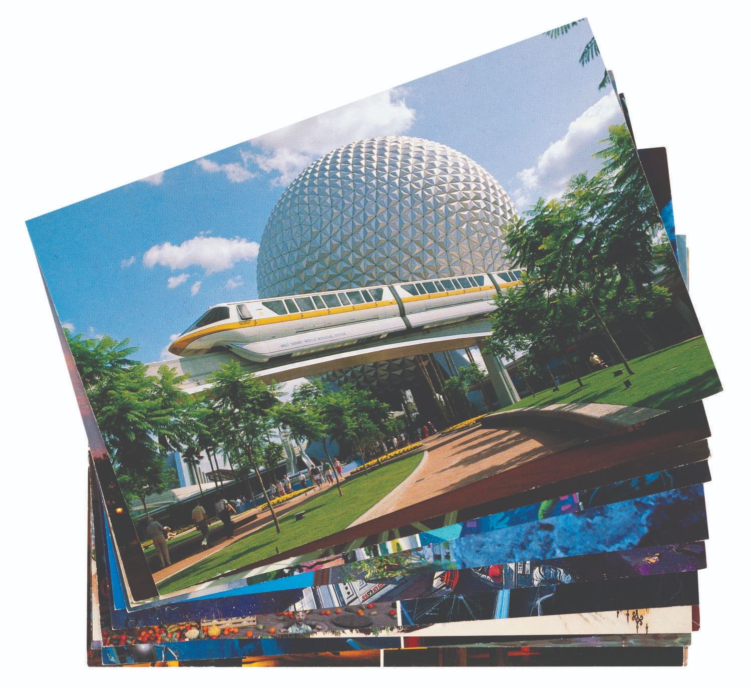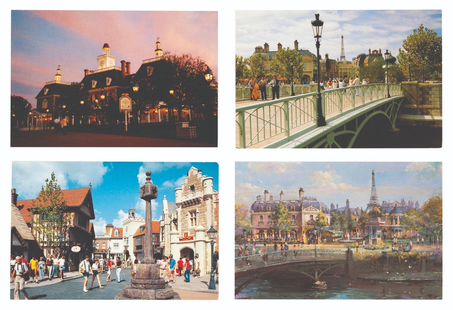 (EPCOT, 1980s) A collection of 12 EPCOT Center postcards, featuring images of The Living Seas, Future World, Spaceship Earth, World of Motion, the Monorail, American Adventure, the UK, France, and China Pavilions, and concept art for the Mexico and France Pavilions. Measuring 4" x 6", the collection is in fine condition.