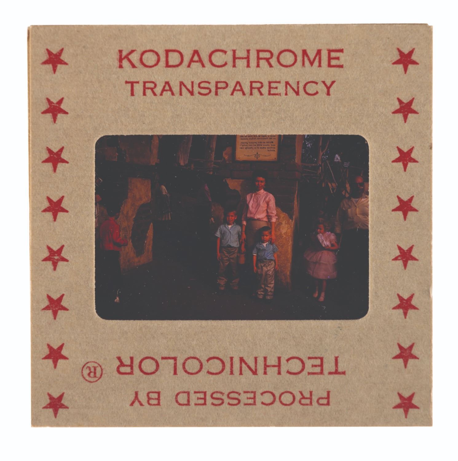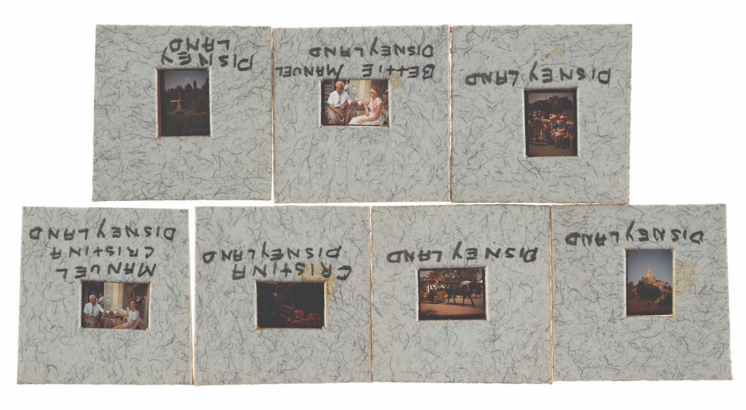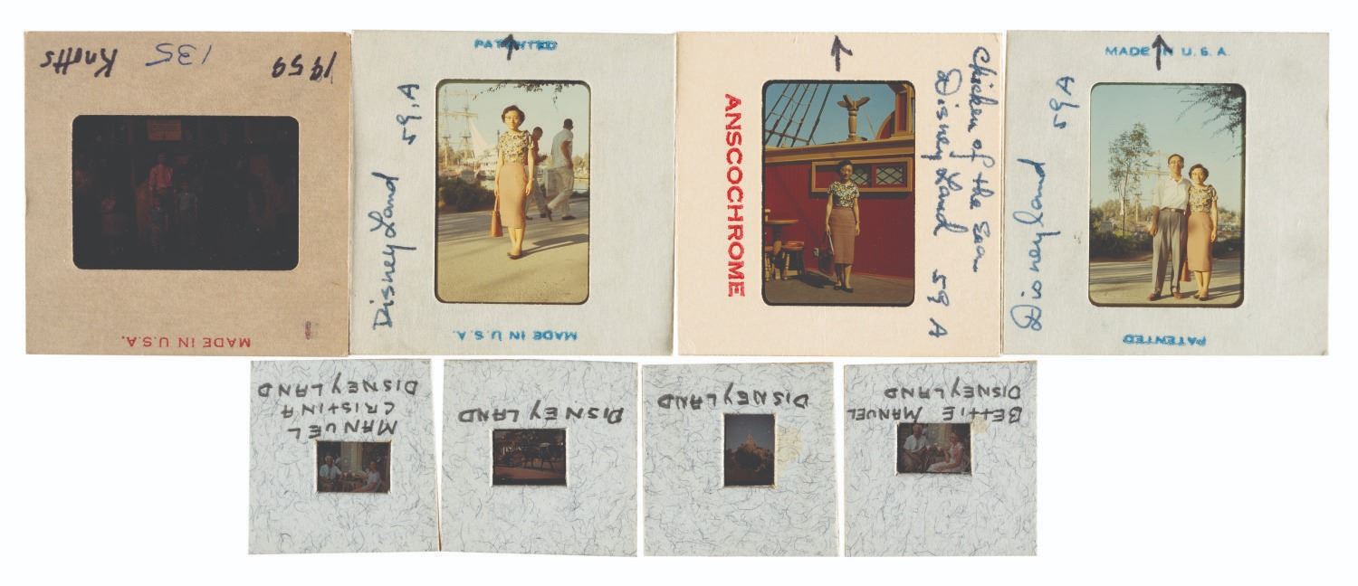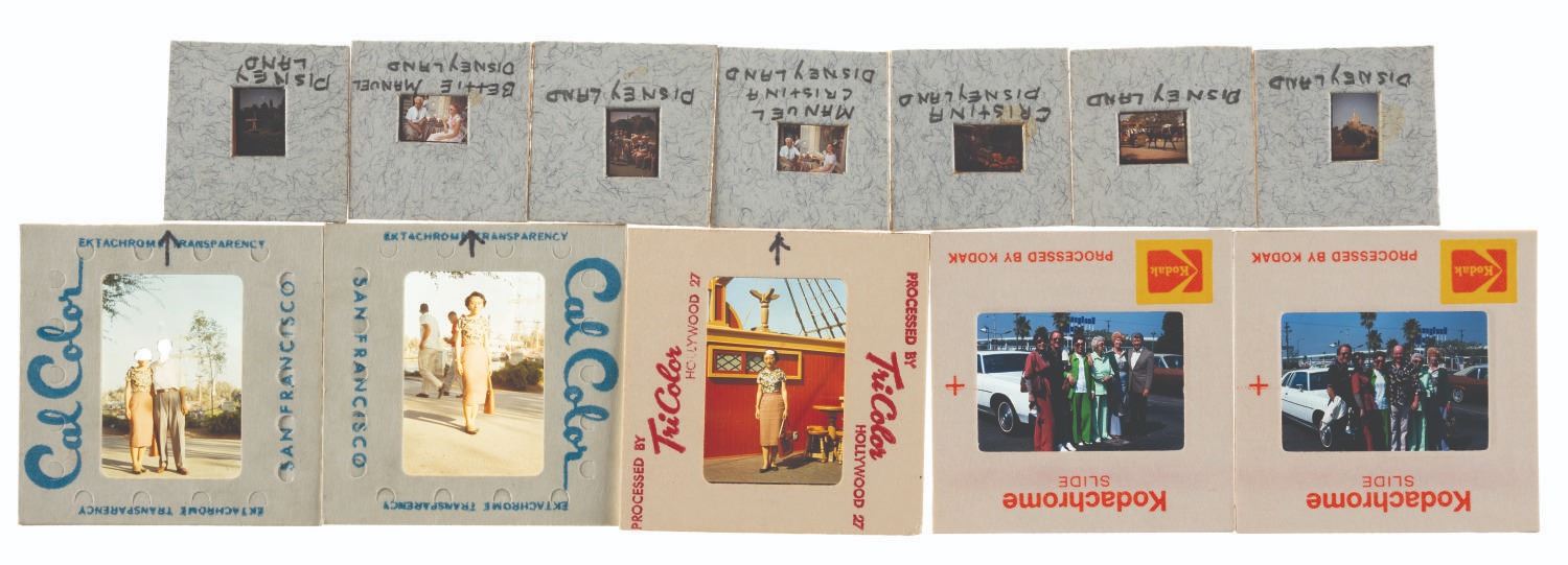 (Disneyland, 1950s-70s) A collection of thirteen slides of Guests at Disneyland, including on the deck of the Chicken of the Sea restaurant and a rare view of a Main Street window mannequin display and one image from Knott's Berry Farm. Included are seven 110-format slides and six 35mm slides. Measuring 1"x1" and 2"x2", each slide is in very good-to-good condition exhibiting minor wear from age, and the 110 slides requiring cleaning.