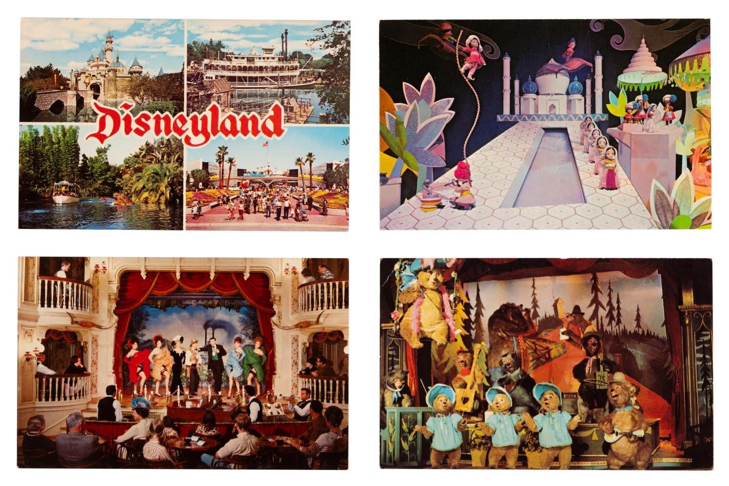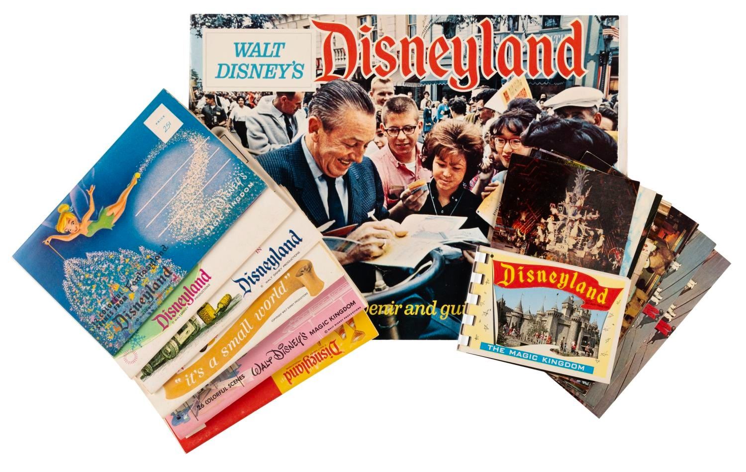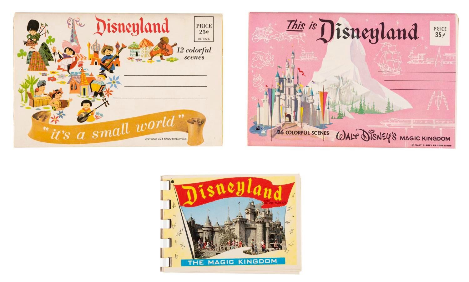 (Disneyland, 1955-1970s) A collection of Disneyland photo books and mailers. Included are a 1955 Mirro-Krome "Disneyland The Magic Kingdom" book; a "Walt Disney's Disneyland" 1968 pictorial guide; five Colorful Scenes accordion mailers with 12 postcard-sized images each for Fantasyland, Frontierland, Tomorrowland, Adventureland, It's A Small World, and Pirates of the Caribbean; one "This is Disneyland" mailer with 26 images; and eight postcards, including one duplicate image. The 3" x 4" Mirro-Krome booklet is in very good condition with slight edge wear to the cover. The 8.75" x 11.75" pictorial guide and 4" x 6" postcards are in good condition with light creasing, handling wear, and discoloration from age. The accordion mailers measure 6"x4" when closed and are in very good to fair condition with creasing and edge and handling wear, and the It's A Small World with the flap panel torn in half at the perforation, and Frontierland with a 1.5" tear at one side of the perforation.