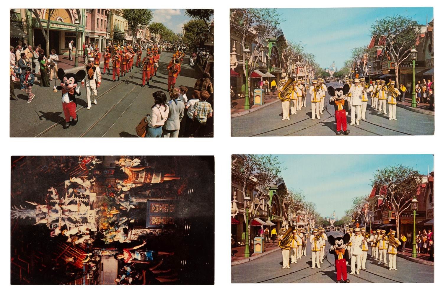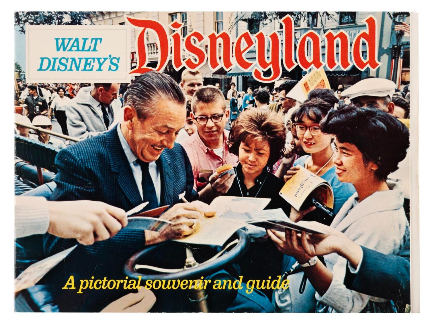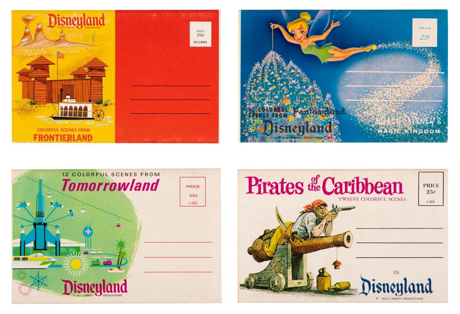 (Disneyland, 1955-1970s) A collection of Disneyland photo books and mailers. Included are a 1955 Mirro-Krome "Disneyland The Magic Kingdom" book; a "Walt Disney's Disneyland" 1968 pictorial guide; five Colorful Scenes accordion mailers with 12 postcard-sized images each for Fantasyland, Frontierland, Tomorrowland, Adventureland, It's A Small World, and Pirates of the Caribbean; one "This is Disneyland" mailer with 26 images; and eight postcards, including one duplicate image. The 3" x 4" Mirro-Krome booklet is in very good condition with slight edge wear to the cover. The 8.75" x 11.75" pictorial guide and 4" x 6" postcards are in good condition with light creasing, handling wear, and discoloration from age. The accordion mailers measure 6"x4" when closed and are in very good to fair condition with creasing and edge and handling wear, and the It's A Small World with the flap panel torn in half at the perforation, and Frontierland with a 1.5" tear at one side of the perforation.
