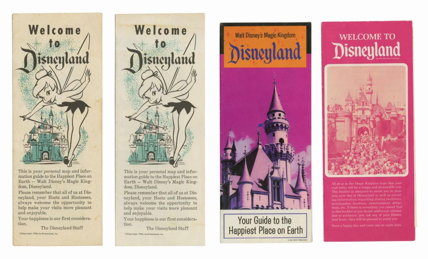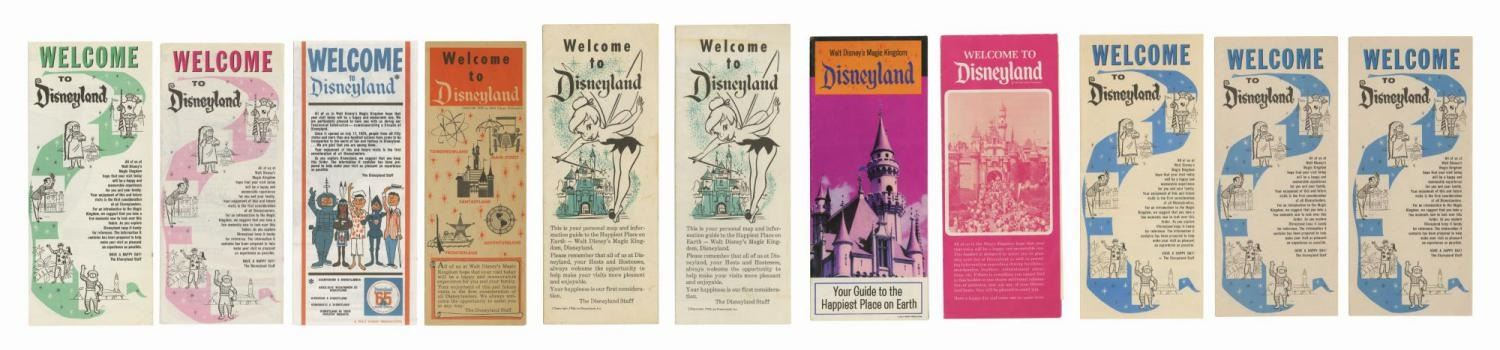 (Disneyland, 1956-68) A collection of eleven early Welcome to Disneyland Guest fold-out brochures. Each features a stylized map and a list of Park attractions and amenities. Editions of the brochure included are two 1956, 1958, 1960, two 1961, 1963, 1964, 1965, 1968, and one undated from after Pirates of the Caribbean opened in 1967 but before the Haunted Mansion in 1969. Ranging from 8.5" x 3.5" to 9" x 3.5", the brochures are in very good condition with some pen notation, edge browning, tears, staple holes, creases from use, and handling wear.