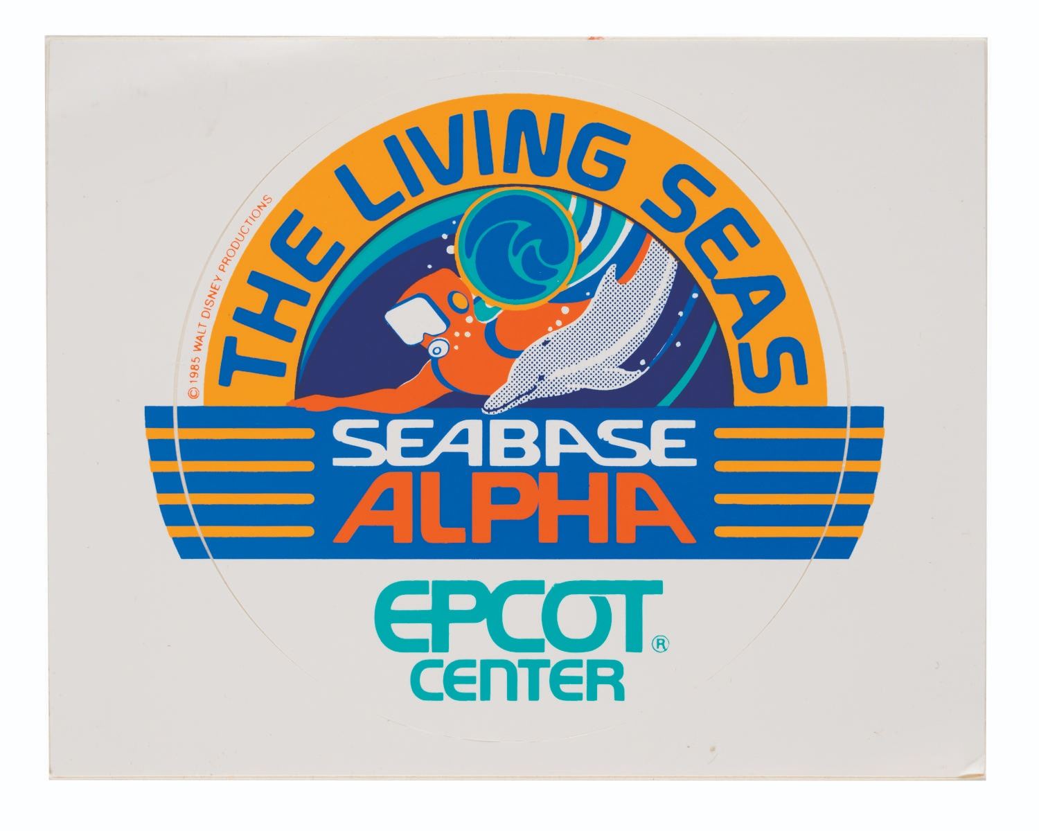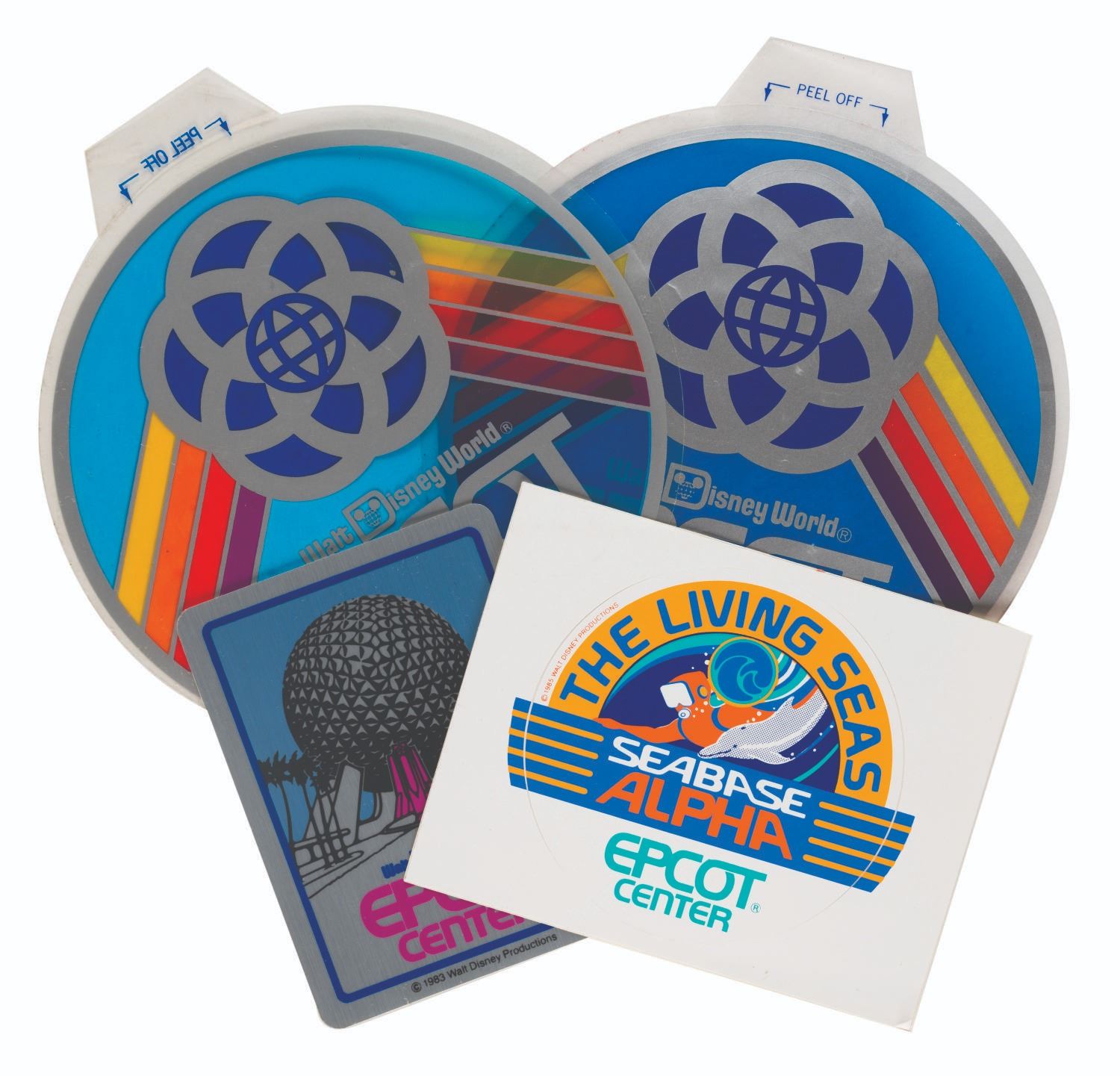 (EPCOT, 1980s) A collection of three unused EPCOT stickers including a Seabase Alpha logo. Also included is a second large transparent sticker that has been used. Measuring up to 5.75" in diameter the stickers are in very good condition.