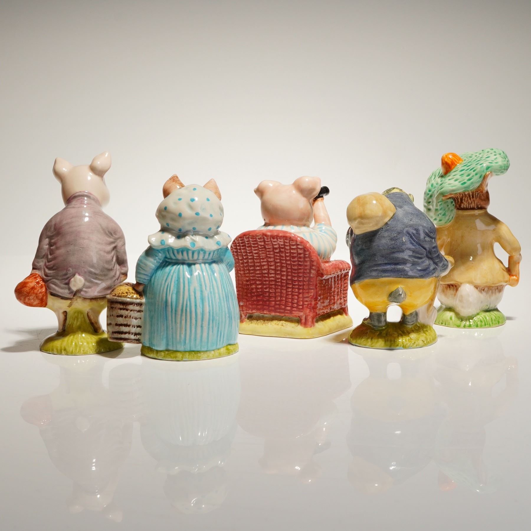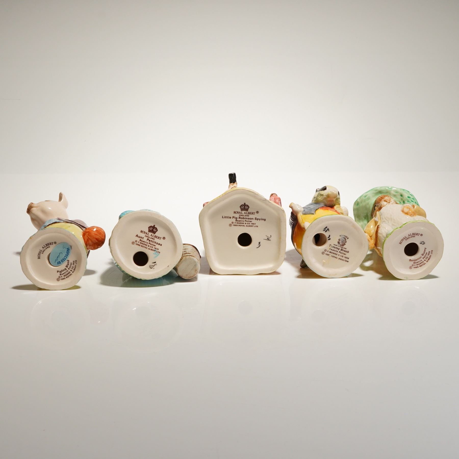 A collection of five hand-painted ceramic figurines depicting anthropomorphic animal characters from the Beatrix Potter stories. The figures are modeled in standing or sitting poses on small green bases representing grass, finished with glossy polychrome enamels. The collection includes characters such as Aunt Pettitoes and Little Pig Robinson Crying. Other figures include a pig in a purple jacket, a badger, and a rabbit wearing a green hat. The underside of the bases feature manufacturer markings including the Royal Albert crown emblem, "ROYAL ALBERT ", and copyright information such as "F. Warne & Co 1981 / Made in England."