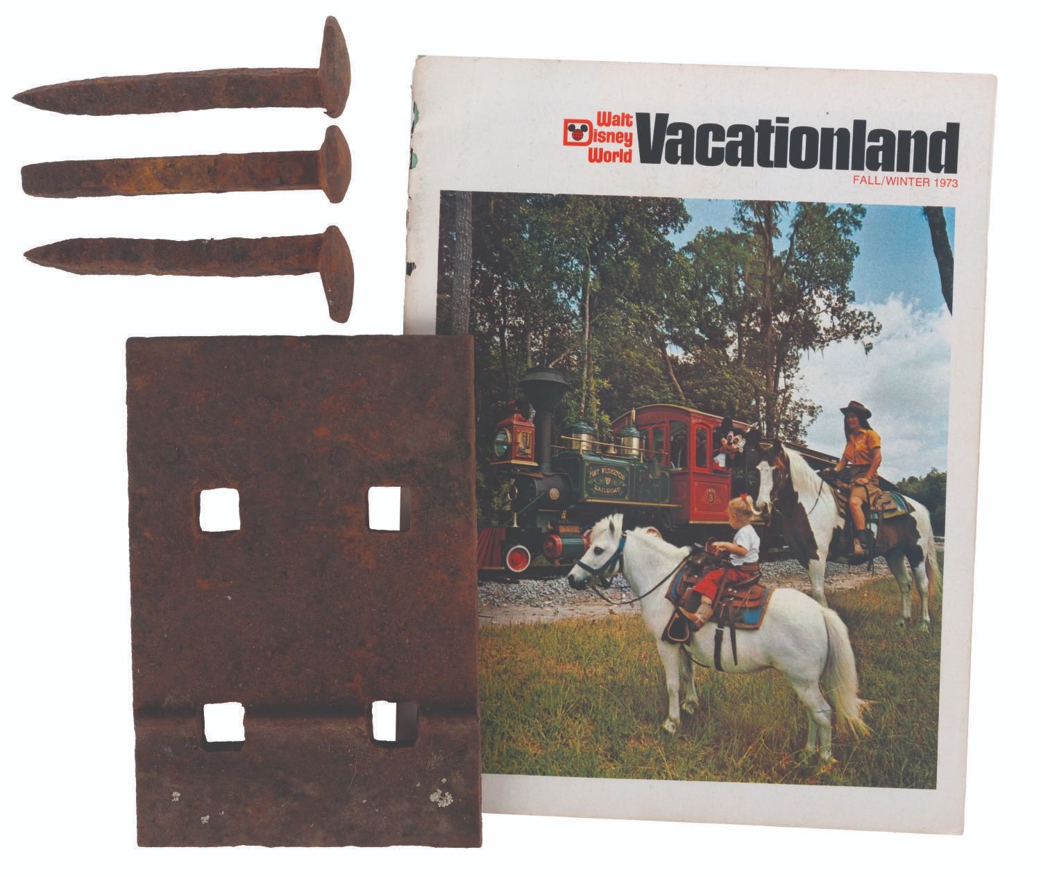 (Walt Disney World, 1970s) A collection of three railroad spikes and a track piece from the Fort Wilderness Railroad at Disney’s Fort Wilderness Resort & Campground. Fort Wilderness Railroad opened on January 1, 1974, to give Guests an in-theme way to get around the campsites. Due to maintenance issues, noise, and low fuel capacity, it closed in 1980. Considering Walt’s love of trains and how iconic the Parks’ trains are, original spikes and tracks are highly sought-after pieces for collectors. The spikes measure 5” each and the track 5.25” x 7.5”, all in good condition with expected oxidation from age and wear from use. Included in the lot are two 8” x 10” glossy photos of the train, in very good condition, and an 8.5” x 11.25” Walt Disney World Vacationland Fall/Winter 1973 issue featuring the railroad on the cover, which is in good condition with spine tears and wear from use.