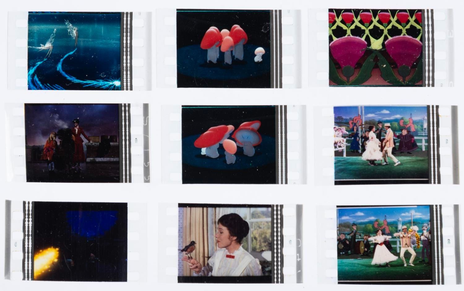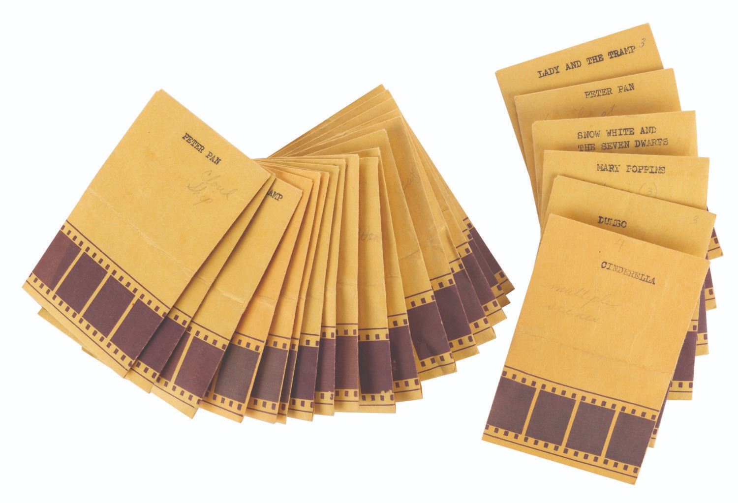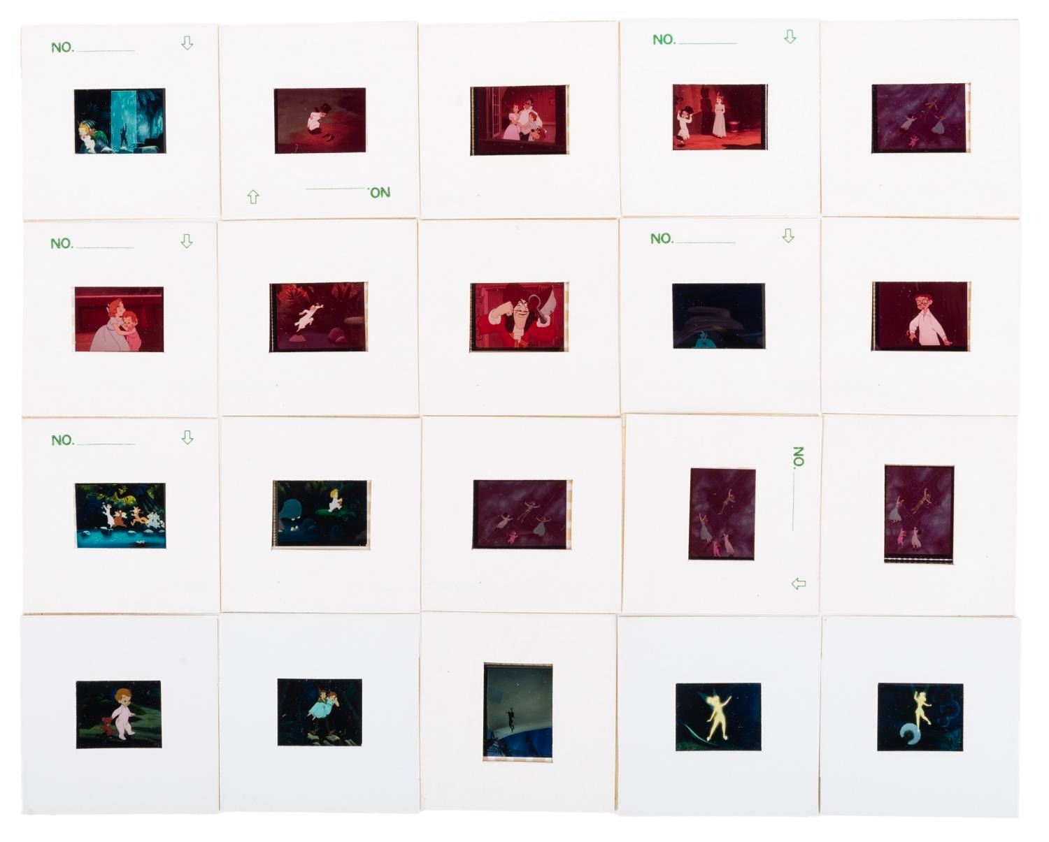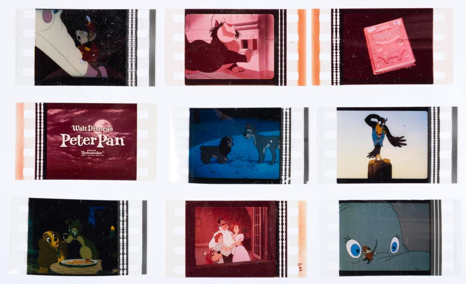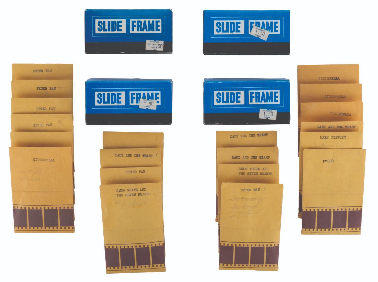(Disney) A collection of several hundred 35mm film frames clipped directly from prints of Disney classic animated films. Included are frames from "Snow White and the Seven Dwarfs," "Dumbo," "Cinderella," "Peter Pan," "Lady and the Tramp," and "Mary Poppins," each sorted into envelopes, with approximately 200 select images in slide mounts. Measuring 20mm x 35mm, the frames appear to be in very good condition with few signs of scratching or wear.