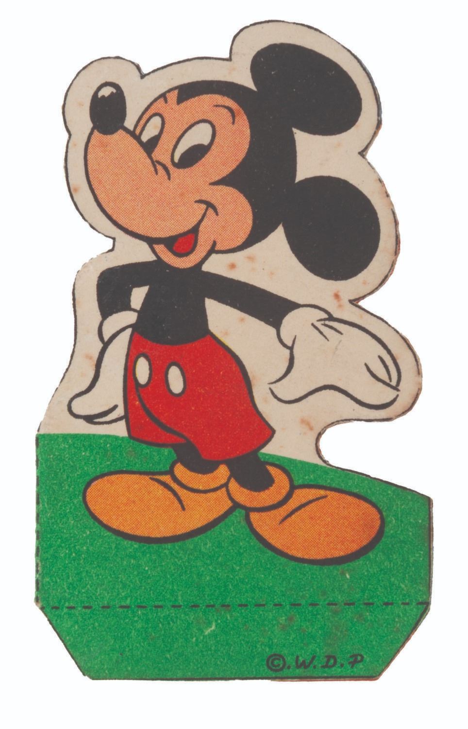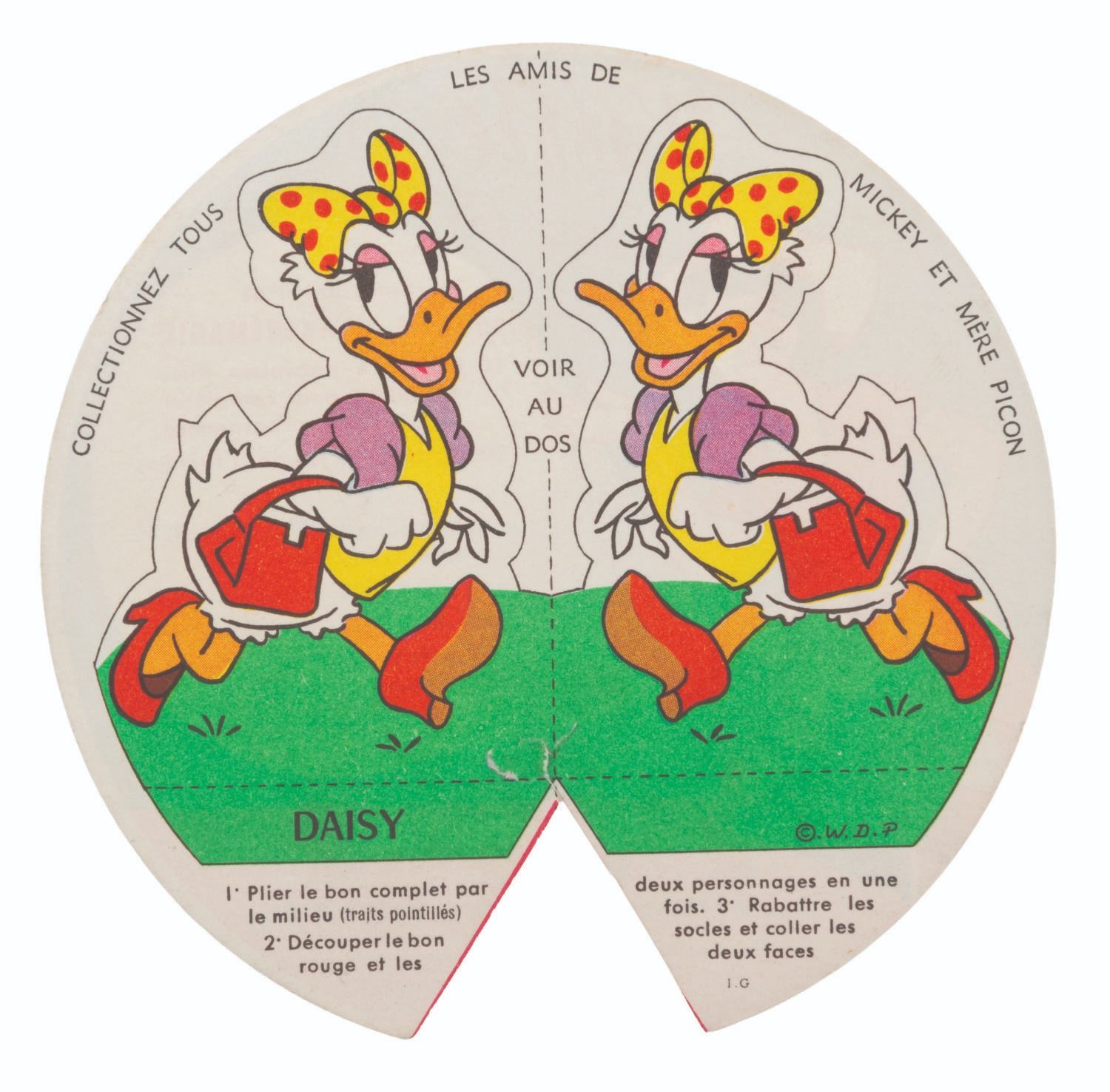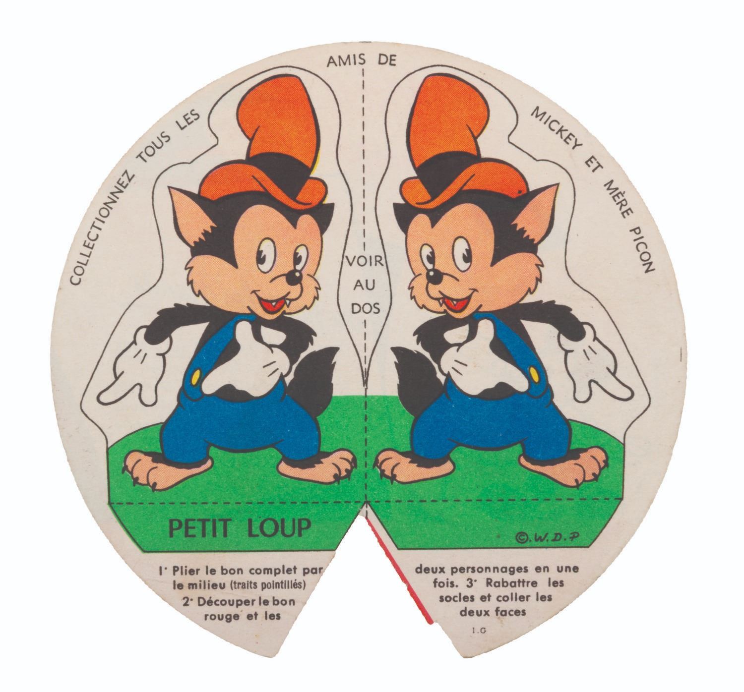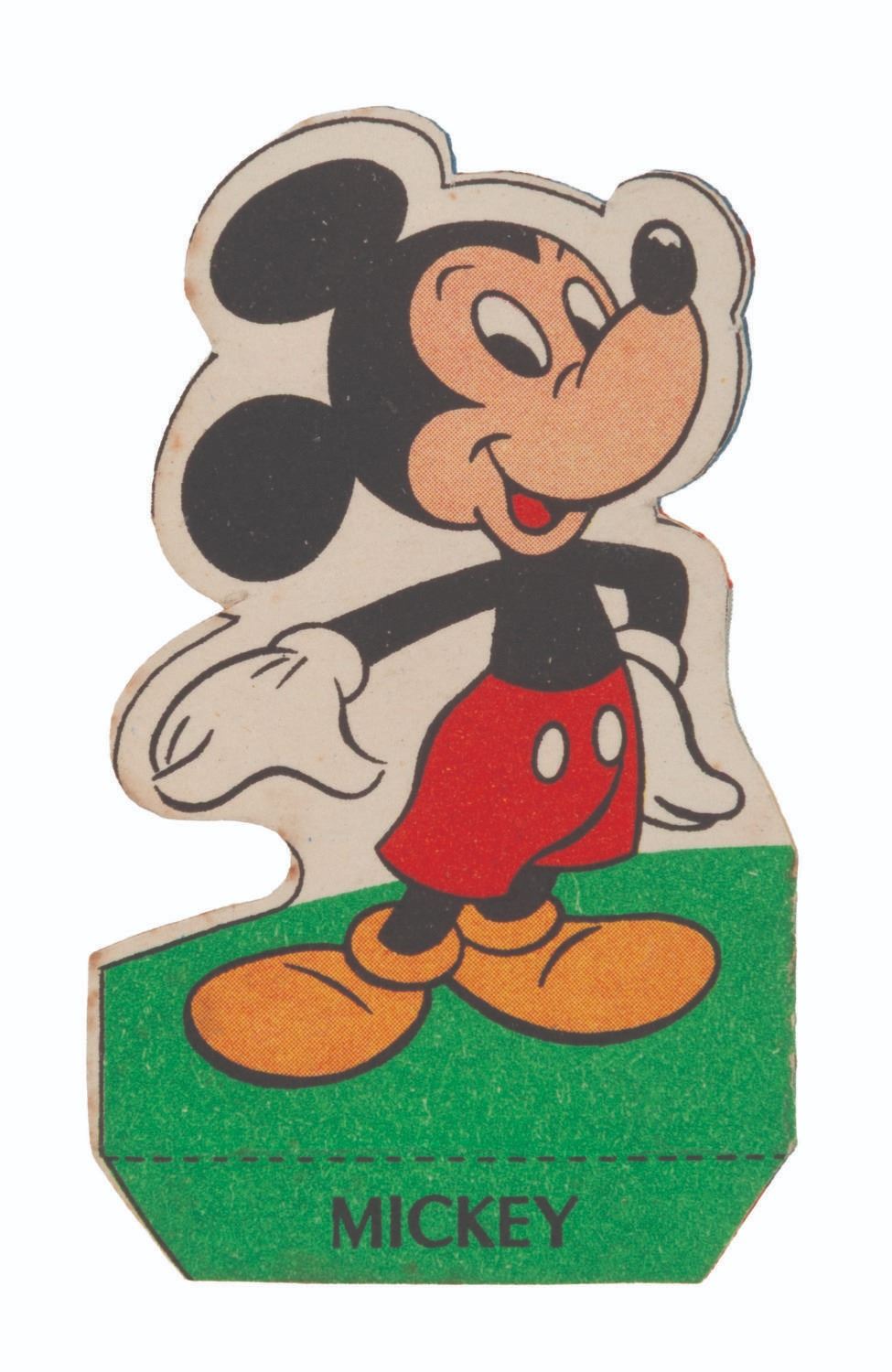 (La Fromagerie Picon, 1960s) A collection of 39 French Disney character two-part coupons that were included with La Fromagerie brand cheeses. One part of the coupon is for redeeming prizes, while the other is for folding into paper models of Mickey Mouse and friends. Included are 18 coupons with the redeemable section removed but not folded, and 21 that have been folded into character models. Measuring 1" in diameter, unfolded and 1.5" x 2.75" folded, the coupons are in good condition with light soiling, discoloration, and edge wear.