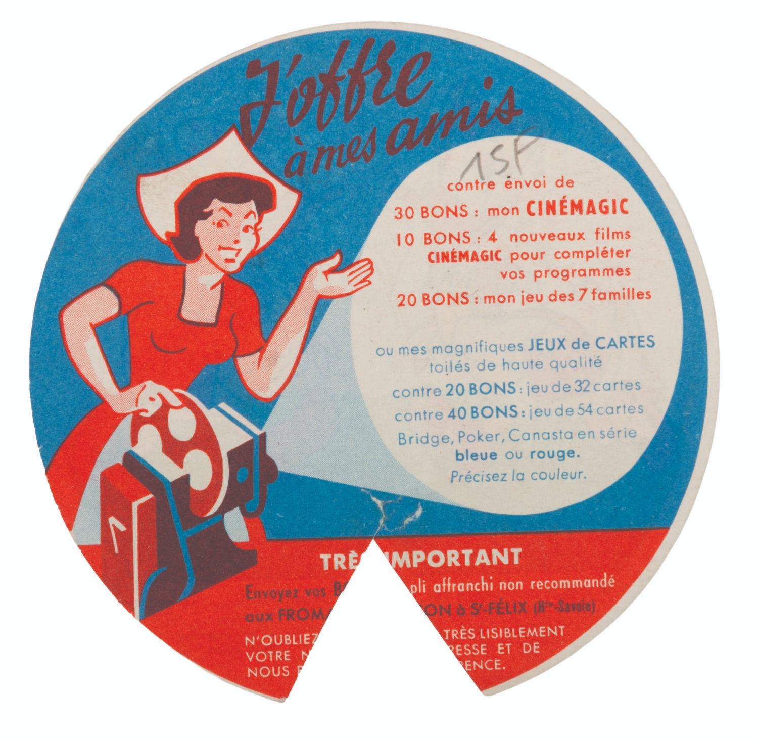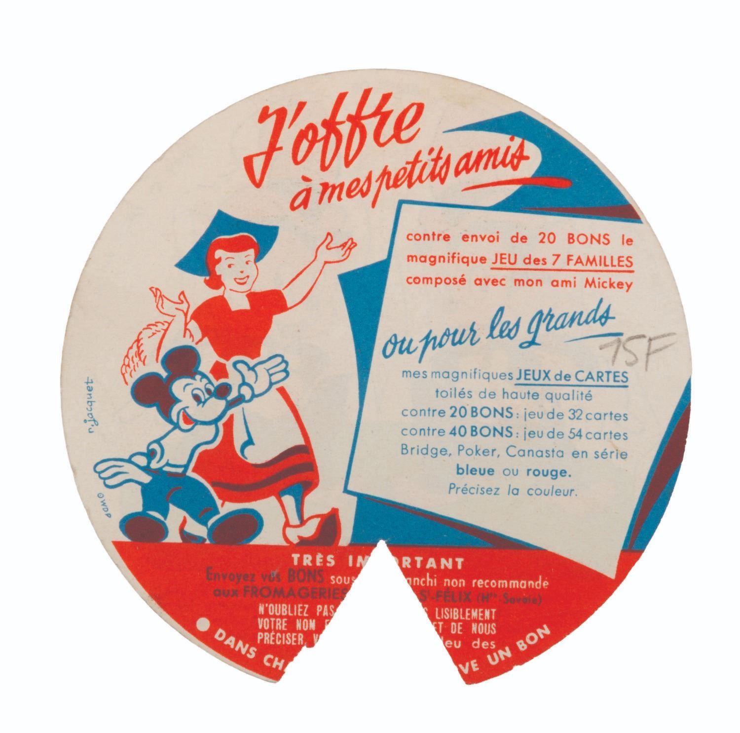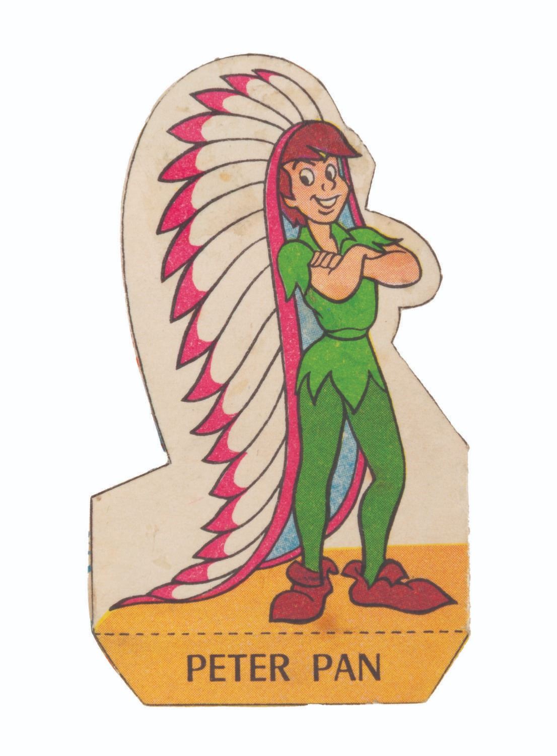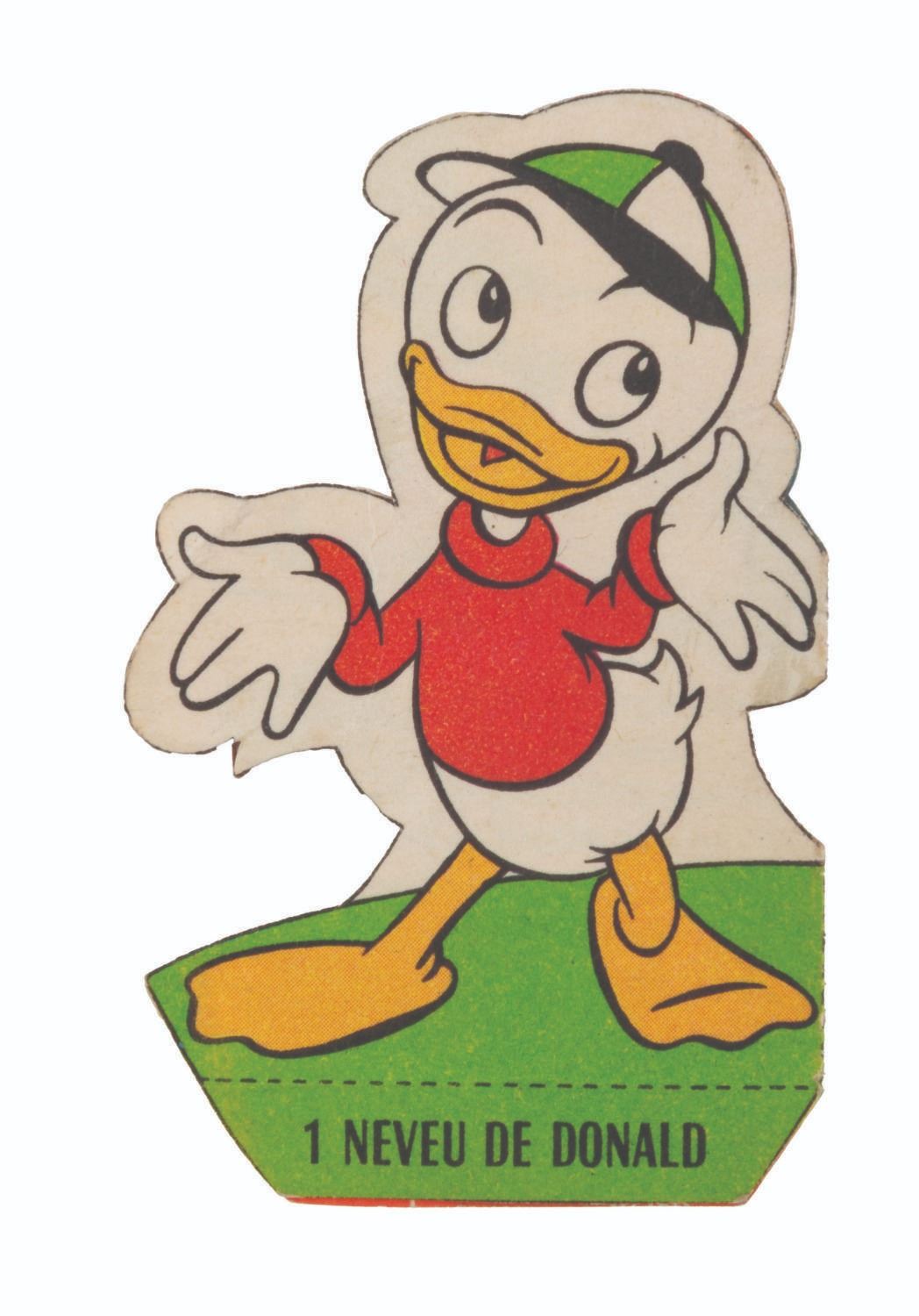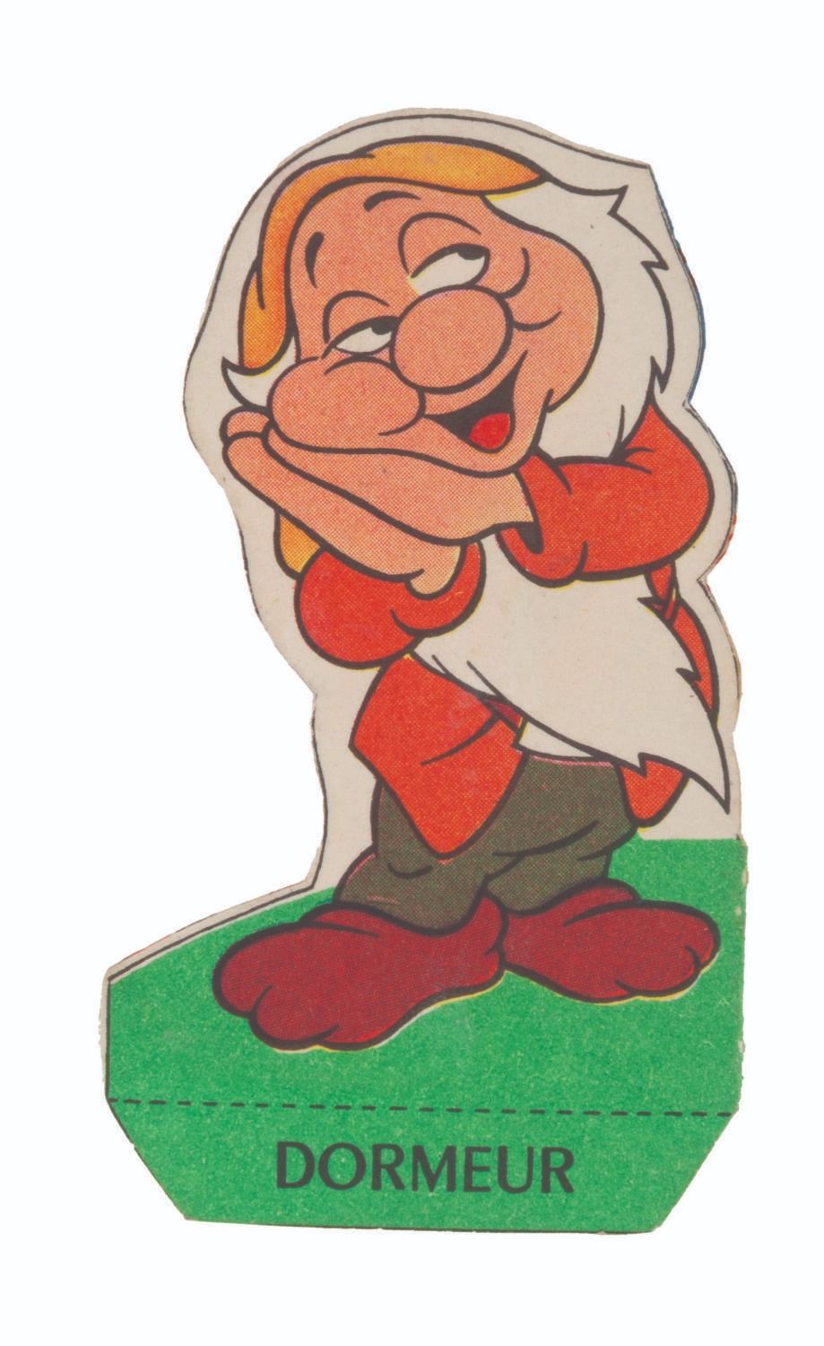 (La Fromagerie Picon, 1960s) A collection of 39 French Disney character two-part coupons that were included with La Fromagerie brand cheeses. One part of the coupon is for redeeming prizes, while the other is for folding into paper models of Mickey Mouse and friends. Included are 18 coupons with the redeemable section removed but not folded, and 21 that have been folded into character models. Measuring 1" in diameter, unfolded and 1.5" x 2.75" folded, the coupons are in good condition with light soiling, discoloration, and edge wear.