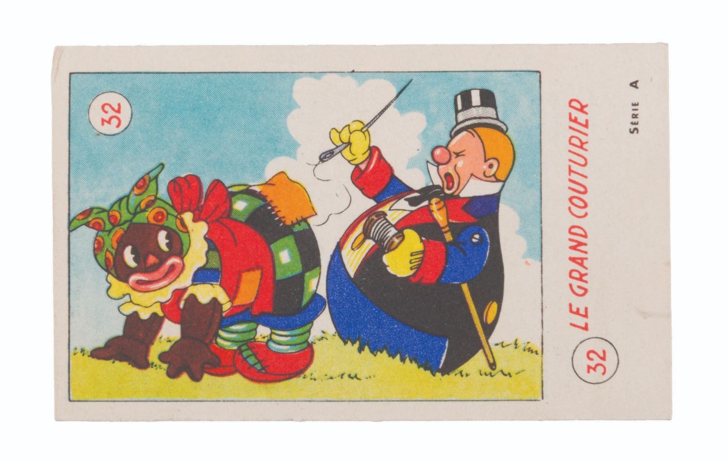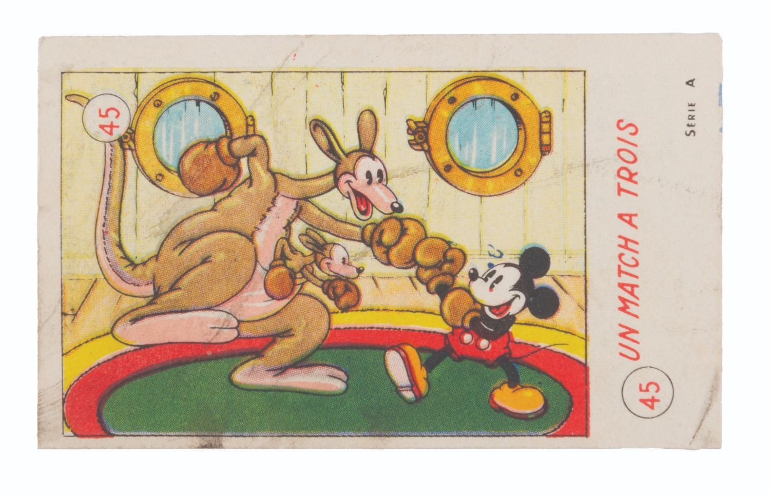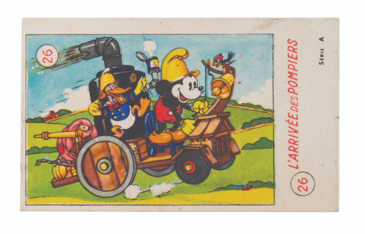 (Max Courteau, 1936) A collection of 14 French, Serie A, Mickey and Friends coupon cards that could be redeemed for prizes. Included with purchase of products manufactured by companies affiliated with the Consortium Publicitaire Des Grandes Maisons, the cards feature images of Mickey, Minnie, Goofy, Tortoise and the Hare, Three Little Pigs and others. Measuring 1.5" x 2.5," the cards are in good condition with light soiling and discoloration.