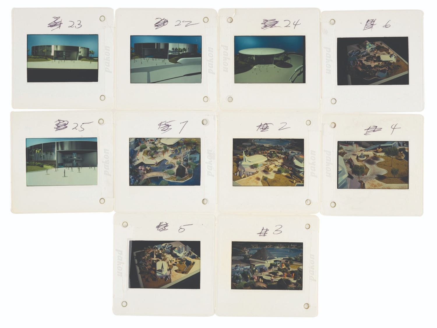 (EPCOT, 1970s) A collection of ten 35mm slides featuring WED Imagineering models of areas of Future World. These slides show stunningly detailed models, including the Journey into Imagination building, the World of Motion building, and the surrounding area. Each slide measures approximately 2" x 2" with all in very good condition.