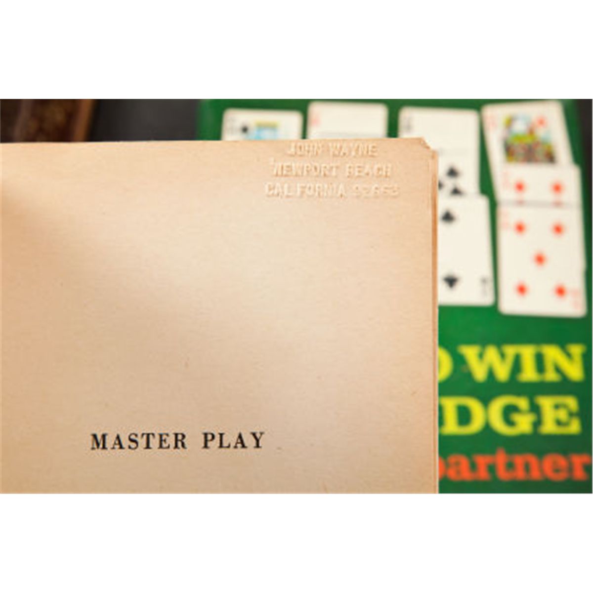 A Collection of Games, 1960s-1970s. Including a Backgammon board (probably from the 1950s), a Japanese chess board, a 'Computer Football' electronic game, a Cribbage board, a poker chip carousel, a bag and a box of poker chips, five decks of cards, two ping pong paddles, three books ['How to Win at Bridge,' How to Win at Backgammon,' and 'Master Play'], and two Bridge score books, both with the front covers reading "Make Check / Payable to / John Wayne;" some with JW inventory stickers.20" x 26" x 3" and smaller