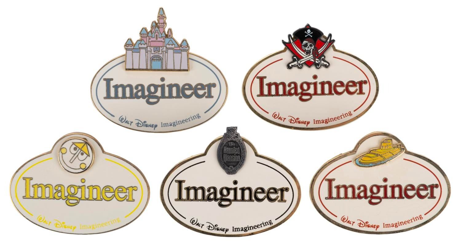 (Walt Disney Imagineering, 2007-2008) A collection of Imagineering exclusive name badge pins themed for Sleeping Beauty Castle, Finding Nemo Submarine Voyage, the Haunted Mansion, Pirates of the Caribbean, and It’s a Small World. Each 1.5” x 2” pin is part of a limited edition of 300, and is in very good condition with light surface scratches.