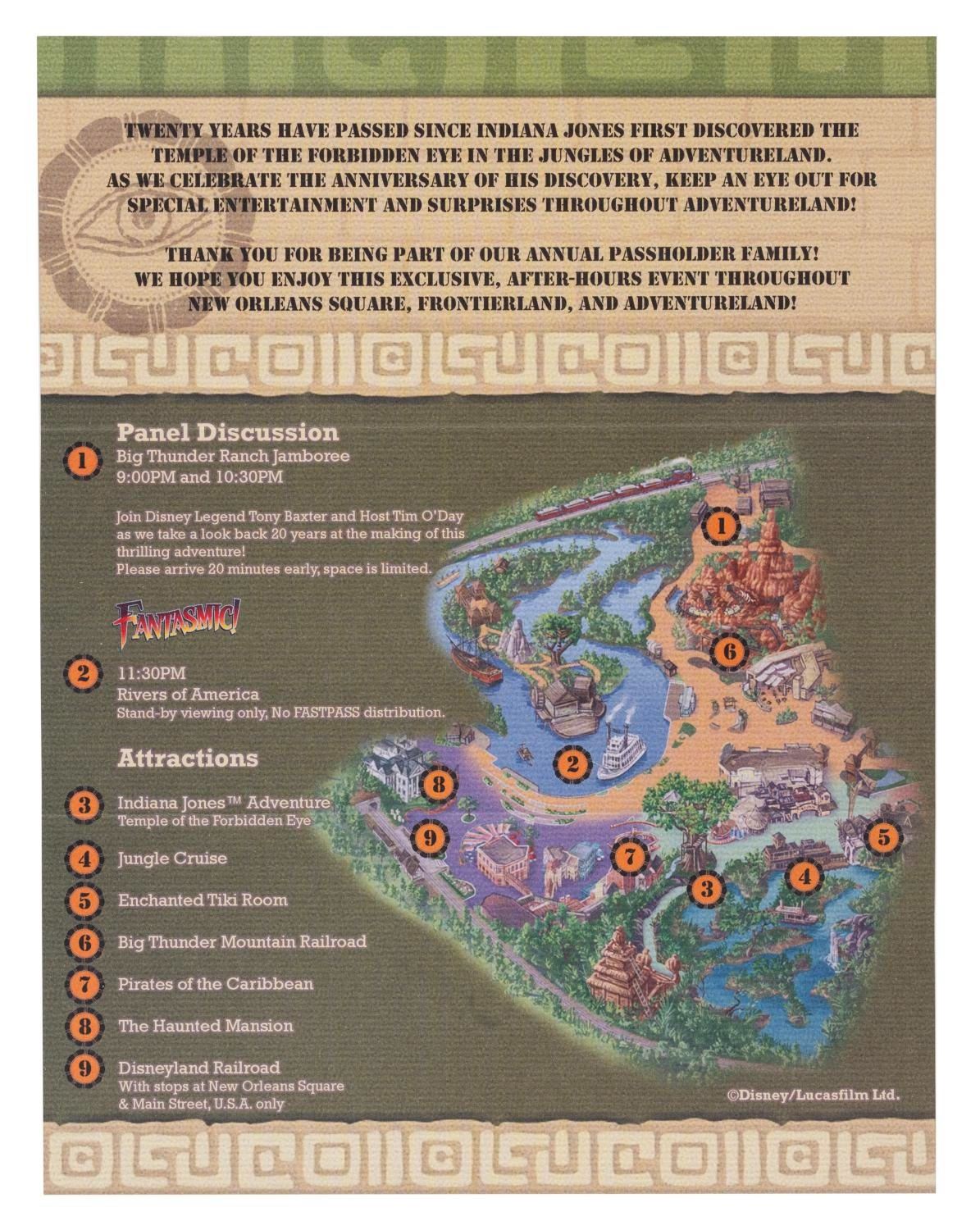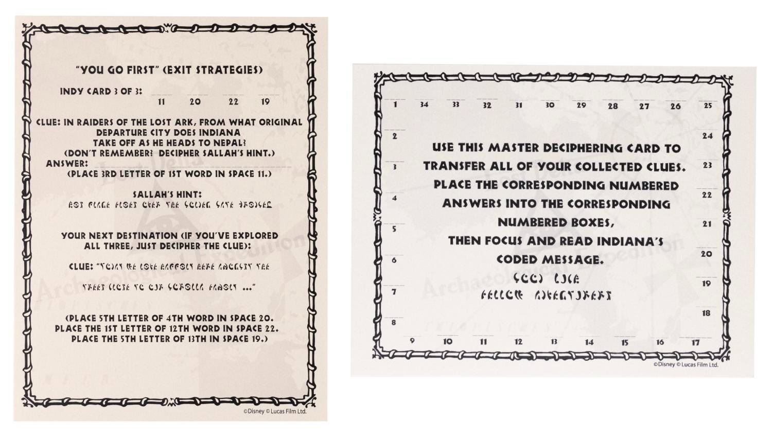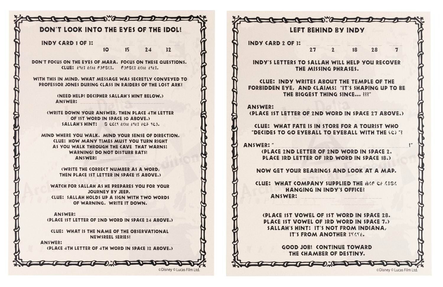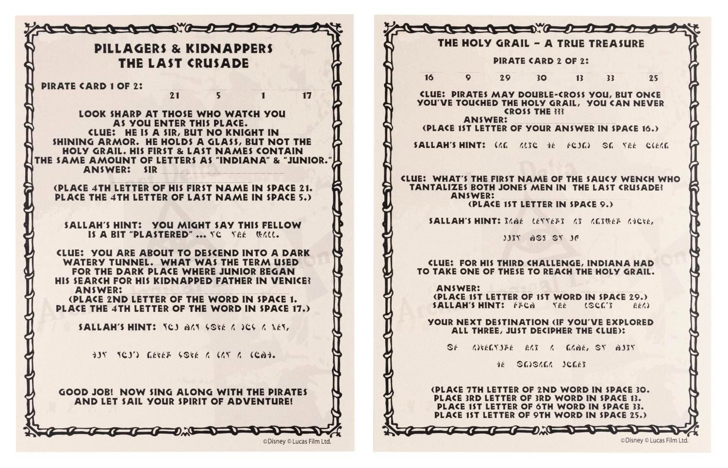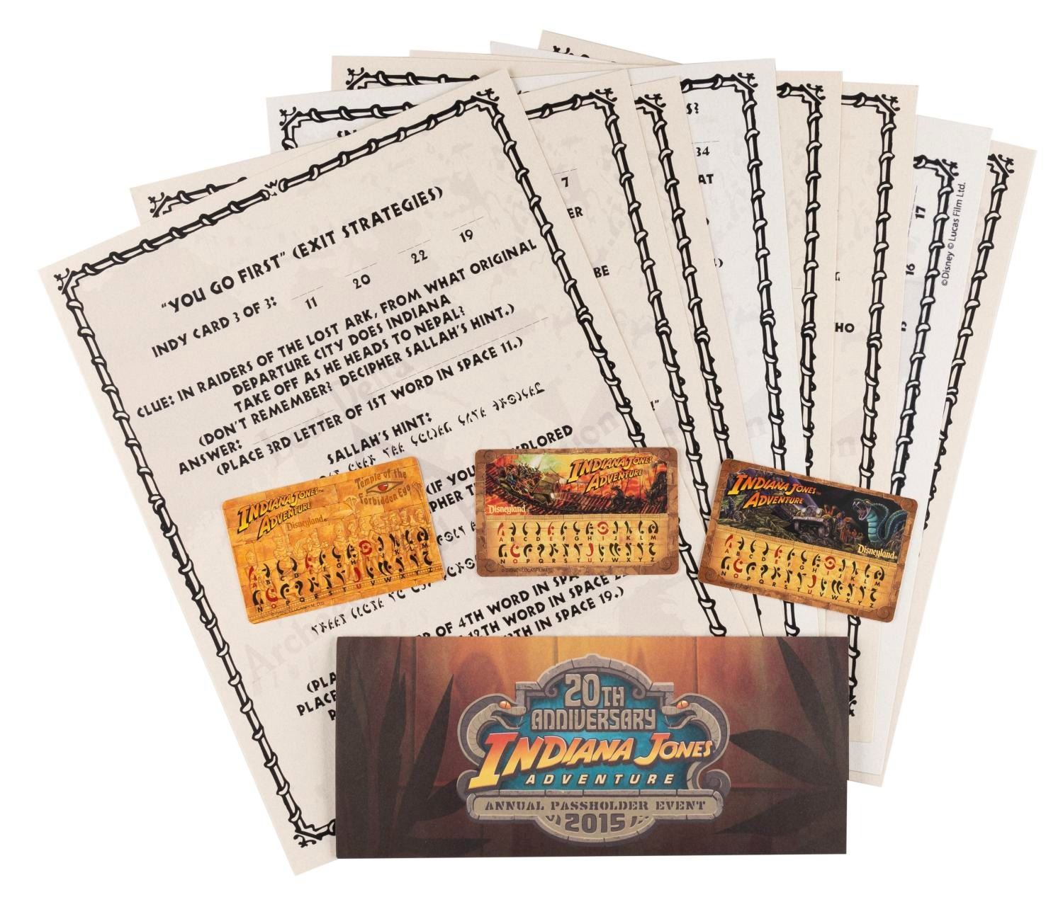 (Disneyland, 1995-2005) A collection of Indiana Jones Adventure souvenirs including three original Mara-glyph decoder cards, a program for the 20th Anniversary event with a reprint decoder, and eight game cards from the event. Measuring up to 8.5" x 11", the pieces are in very good to fine condition.