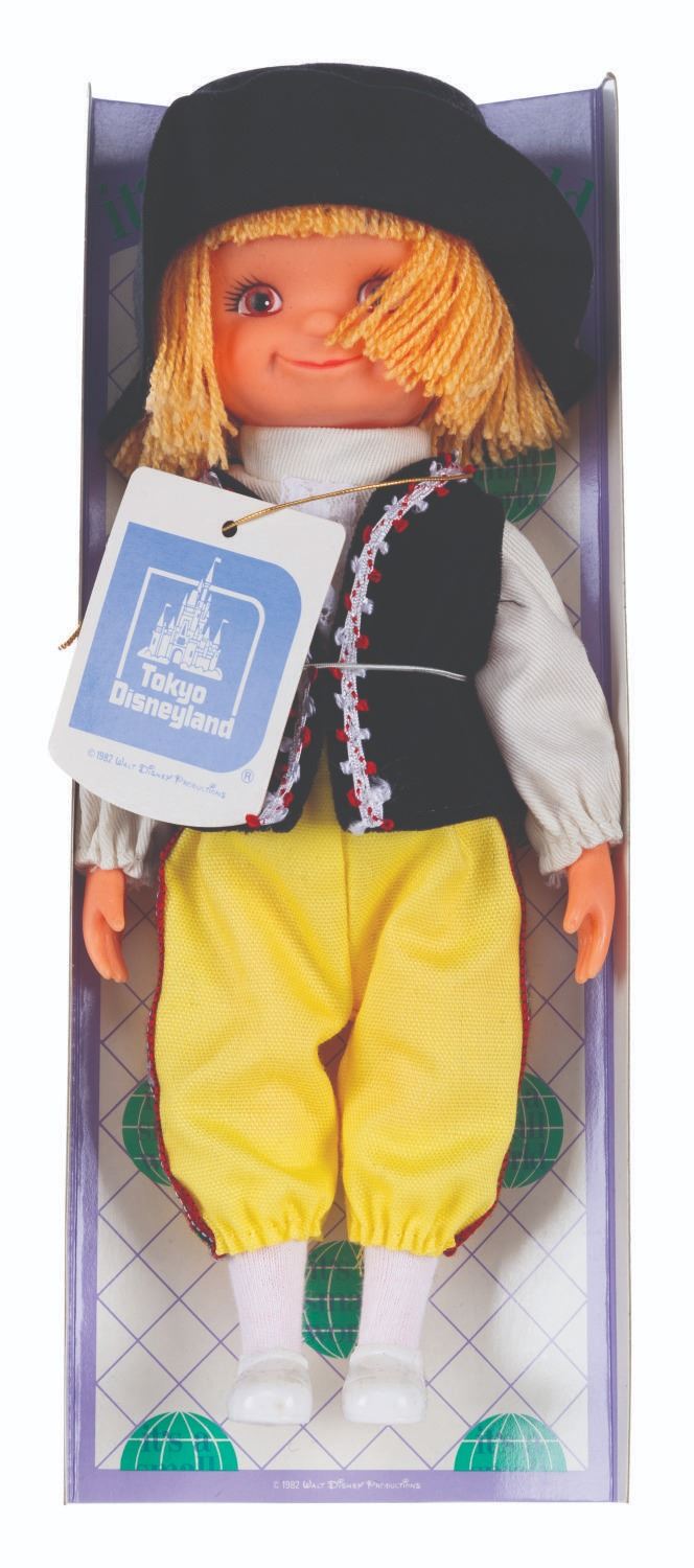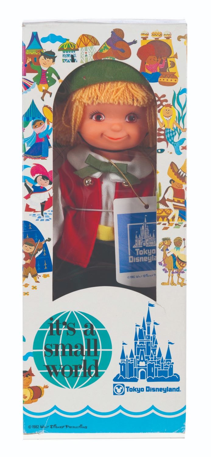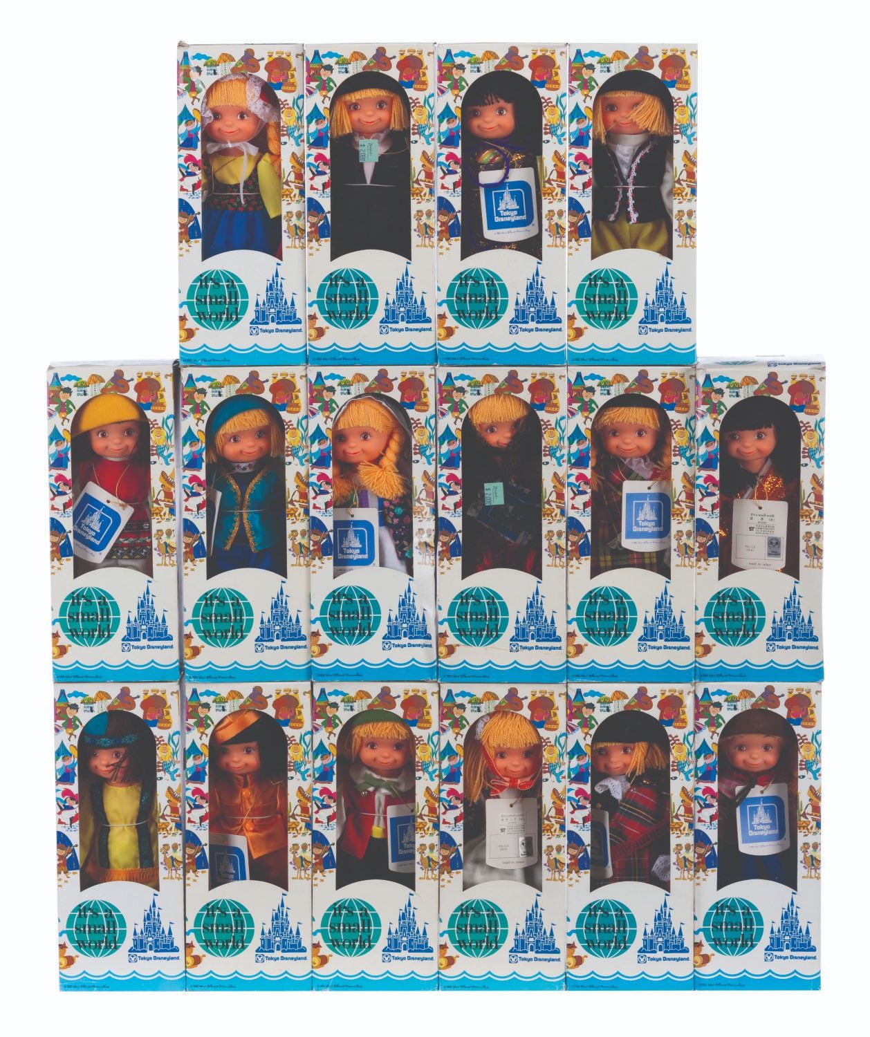 (Tokyo Disneyland, 1982-83) A collection of 16 souvenir dolls from It's A Small World at Tokyo Disneyland. Each doll features unique international clothing inspired by the popular attraction and was manufactured exclusively for Tokyo Disneyland. Measuring approximately 10" tall, each doll is in fine condition in its very good condition box with minor wear to the edges and corners, and retaining their original "price seal" tags.