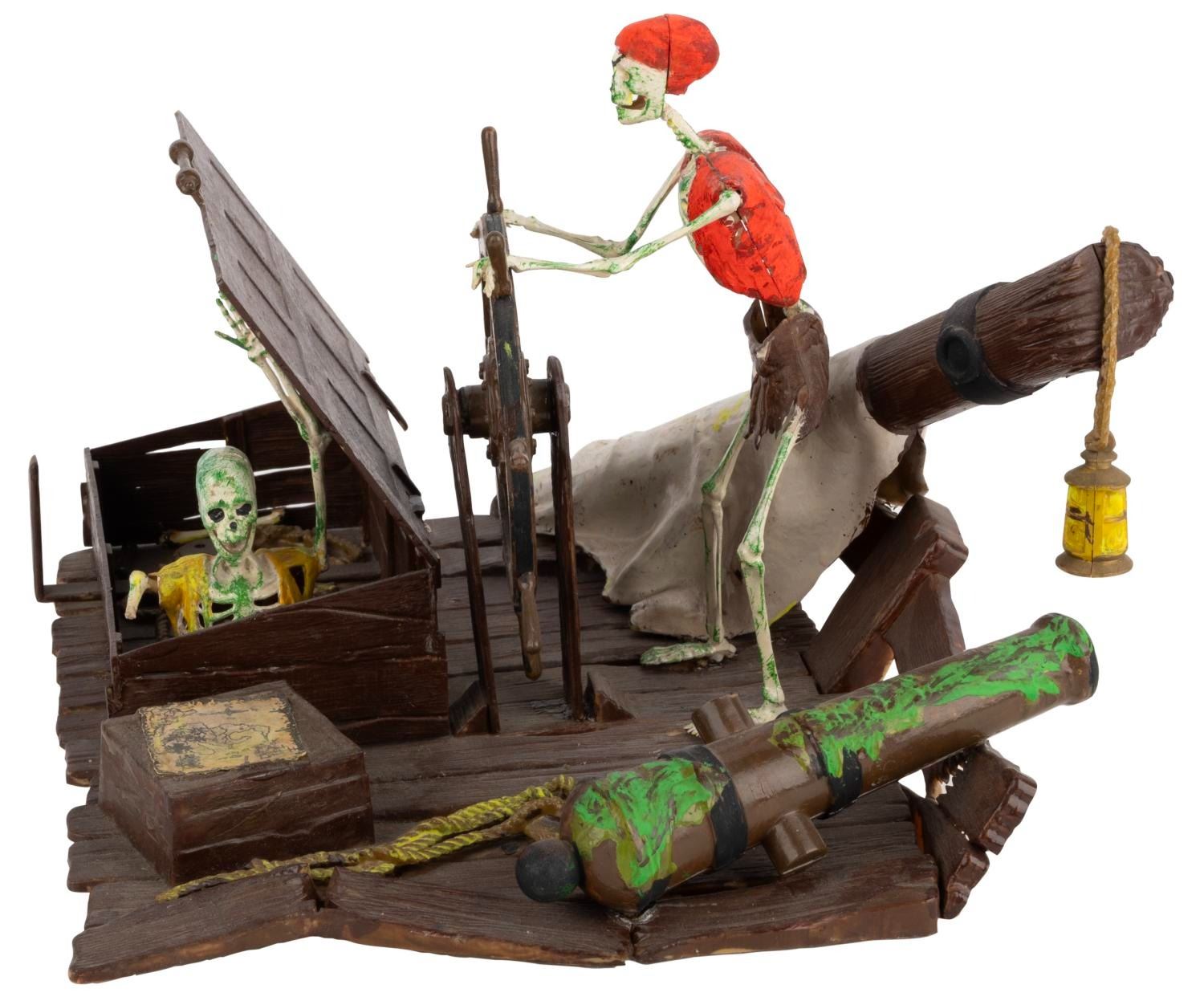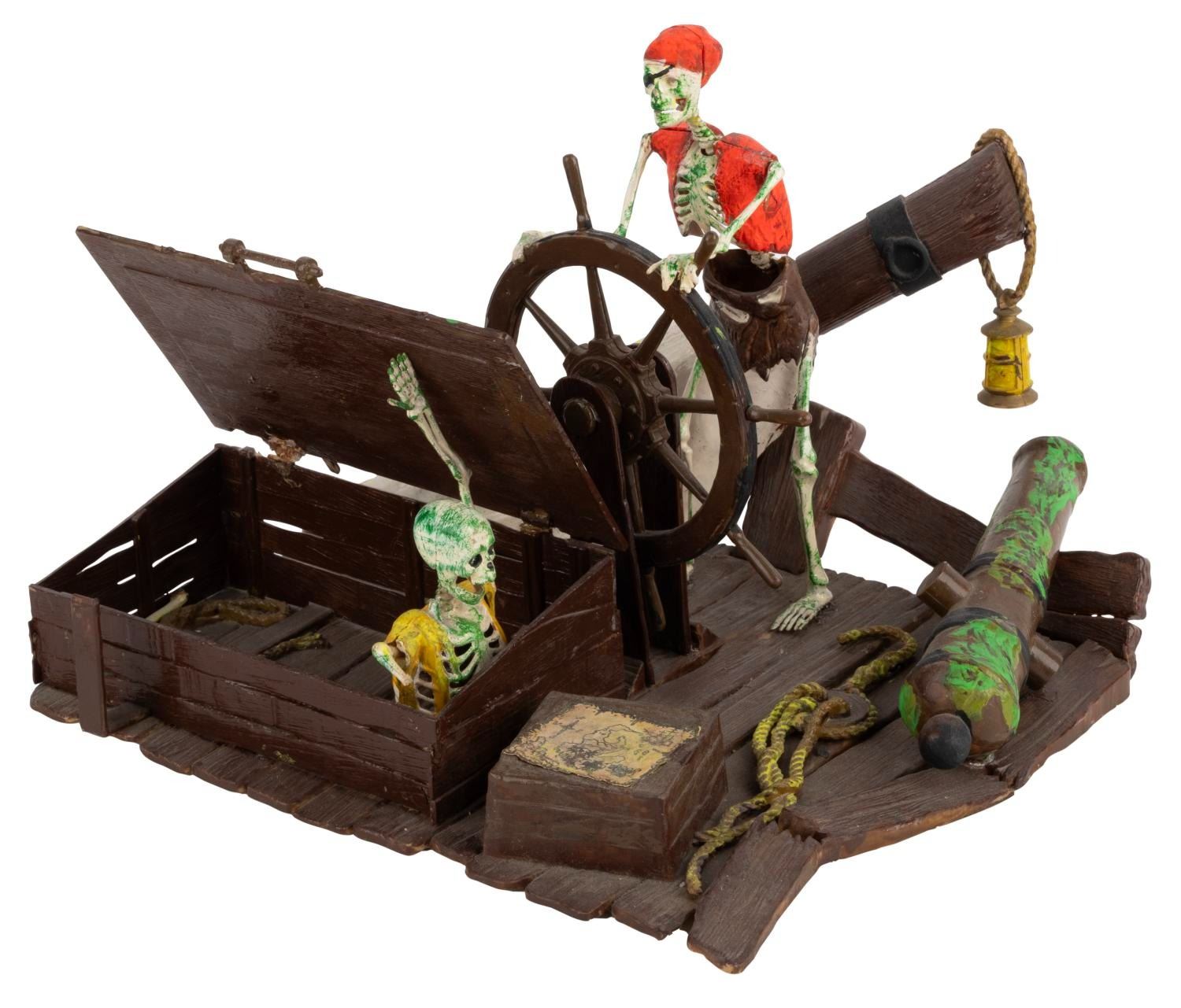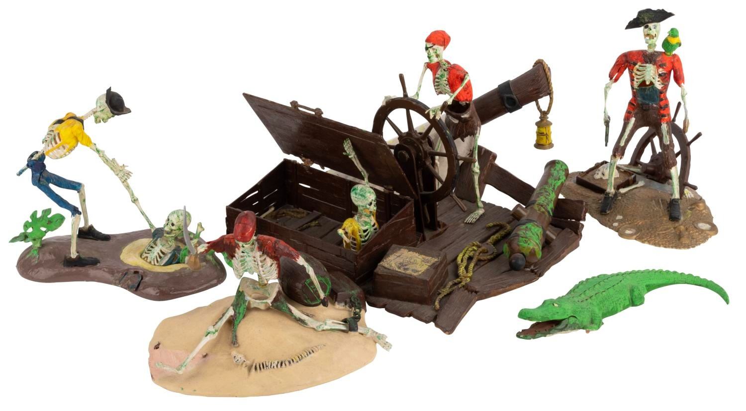 (MPC, 1972) A collection of four assembled MPC Pirates of the Caribbean models. Included are"Dead Men Tell No Tales,""Fate of the Mutineers,""Dead Man’s Raft," and"Condemned to Chains Forever." These kits are partially and aggressively painted, and glued such that the"zap/action" features will not work. The kits are in fair to good condition, likely missing pieces.