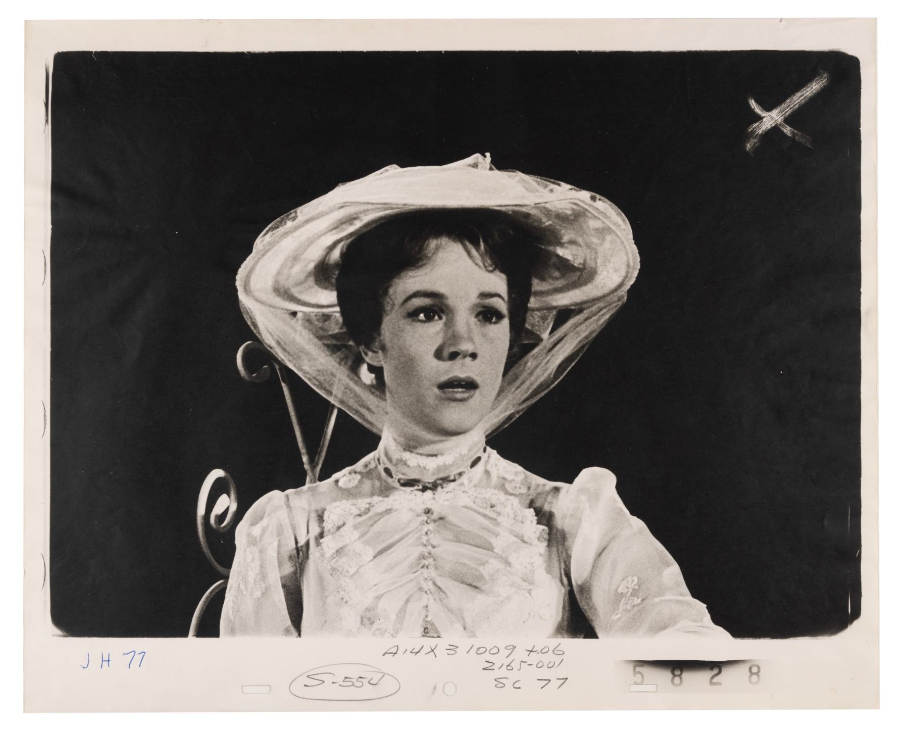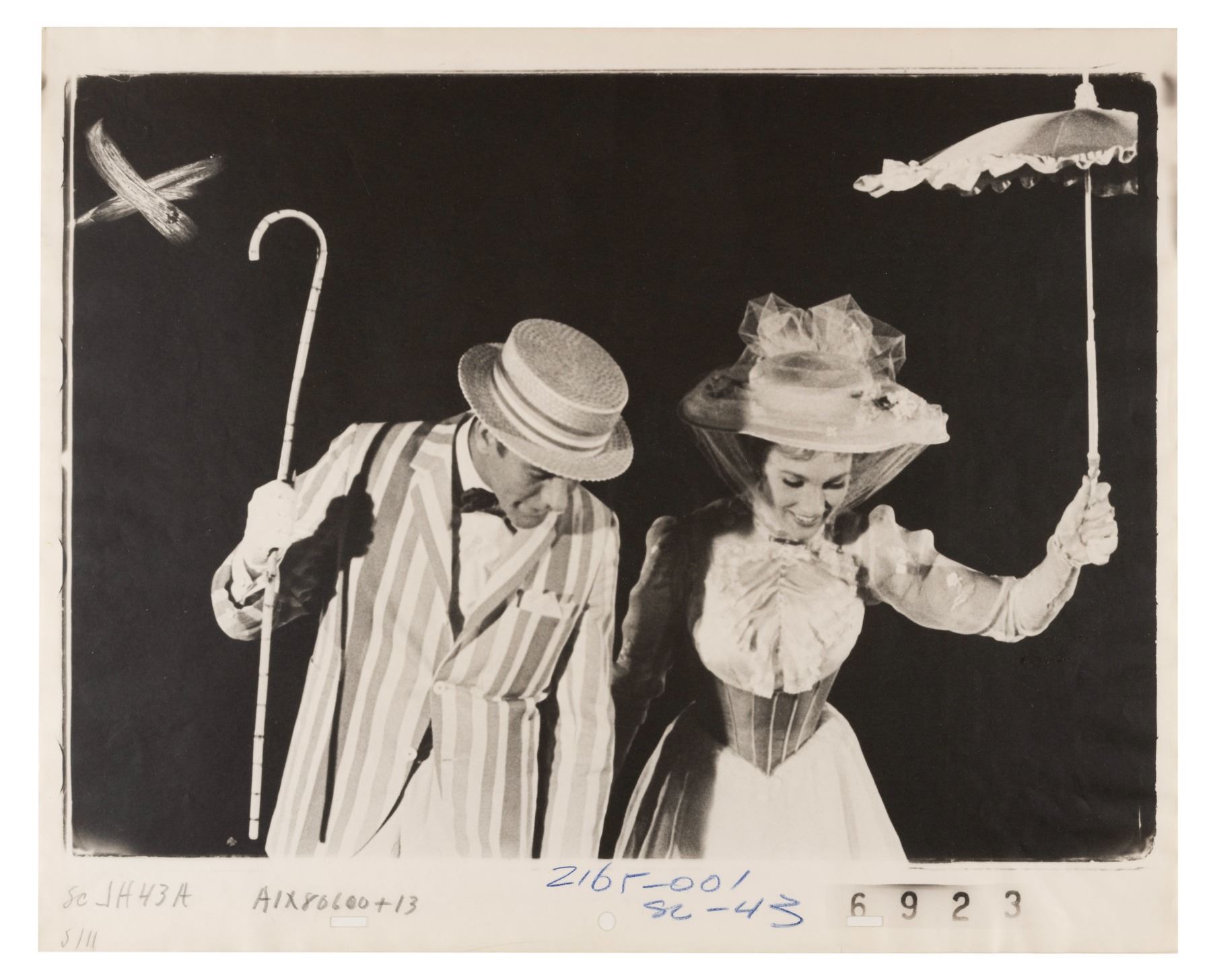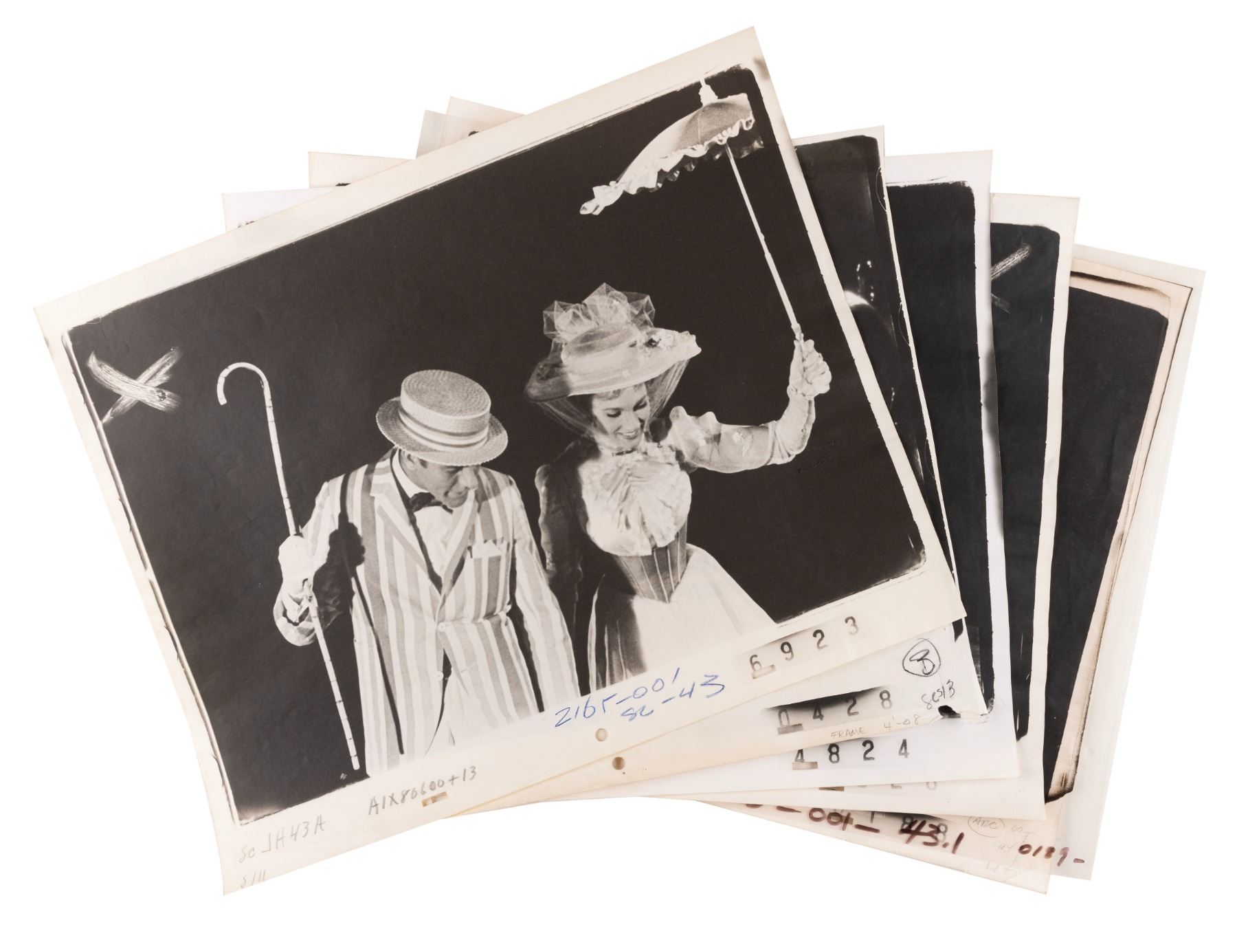 (Disney, 1964) A collection of five Mary Poppins photo prints on 16-field 3-peghole paper. The film used the traveling matte process to create the composite images of animation and live action. As part of the process, blow-up prints of individual live-action frames were created for the animators to use as reference to plot out the action of the animated characters. The prints include images of Mary Poppins, Bert, and Admiral Boom. Measuring 12.5” x 15.5”, the prints are in good condition with handling wear from production use.
