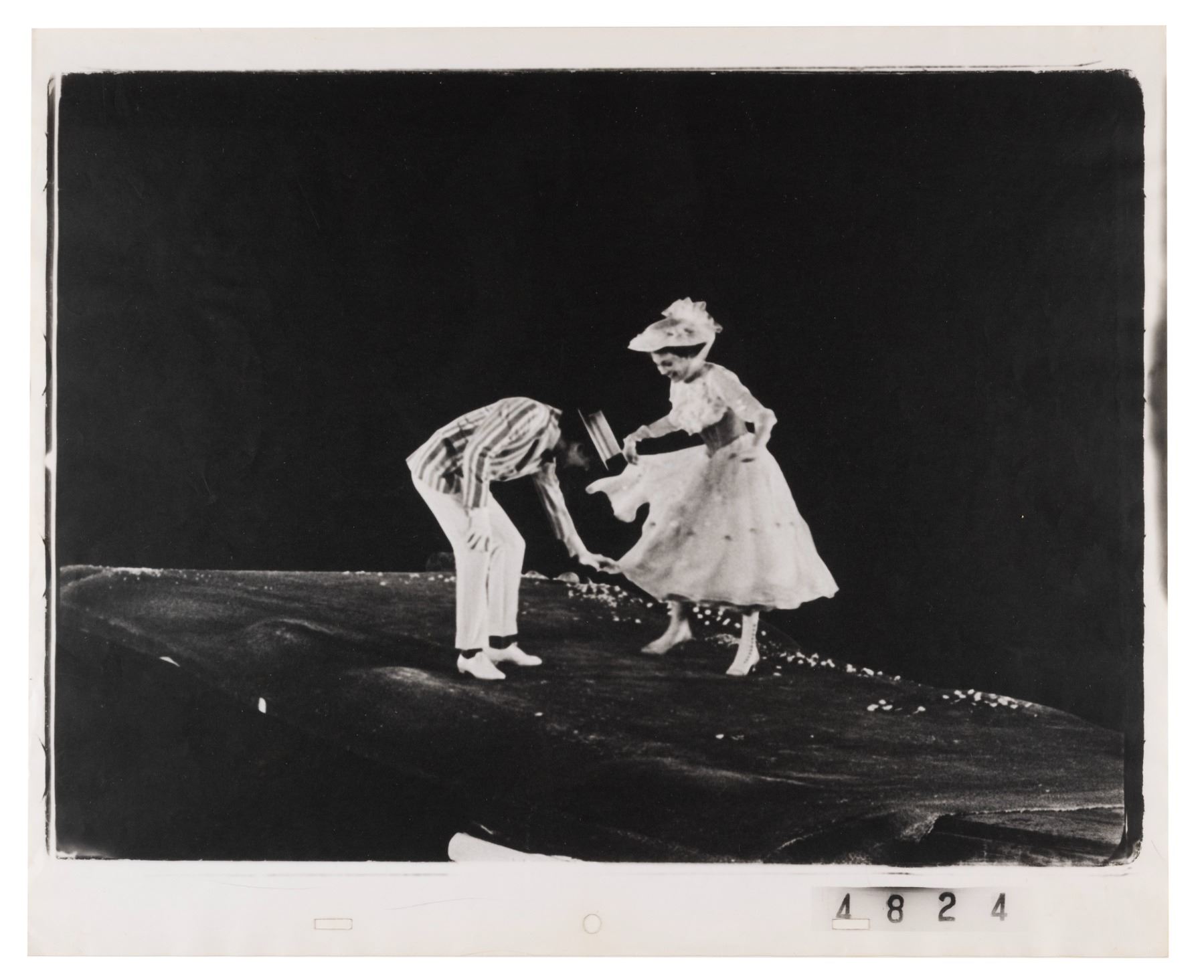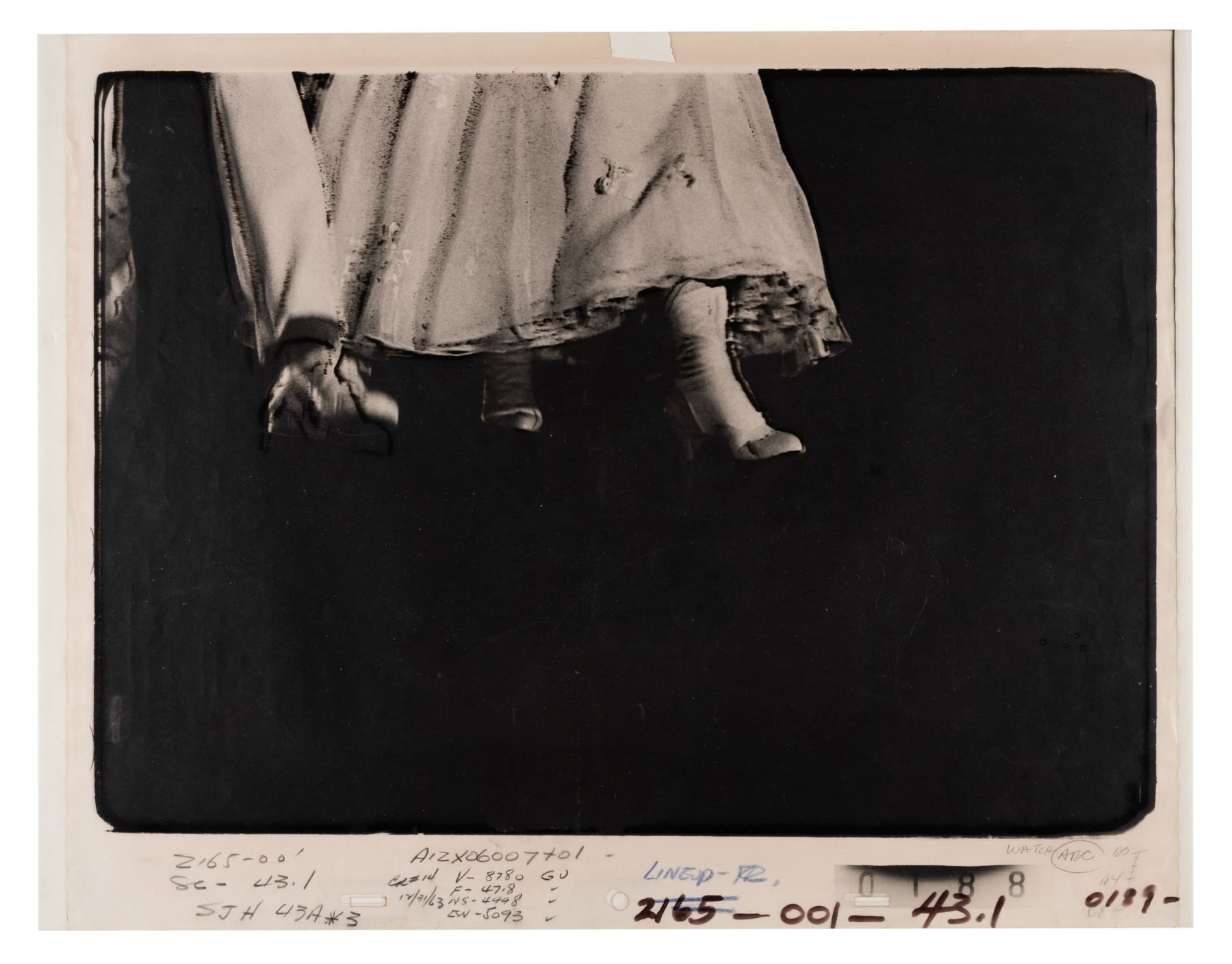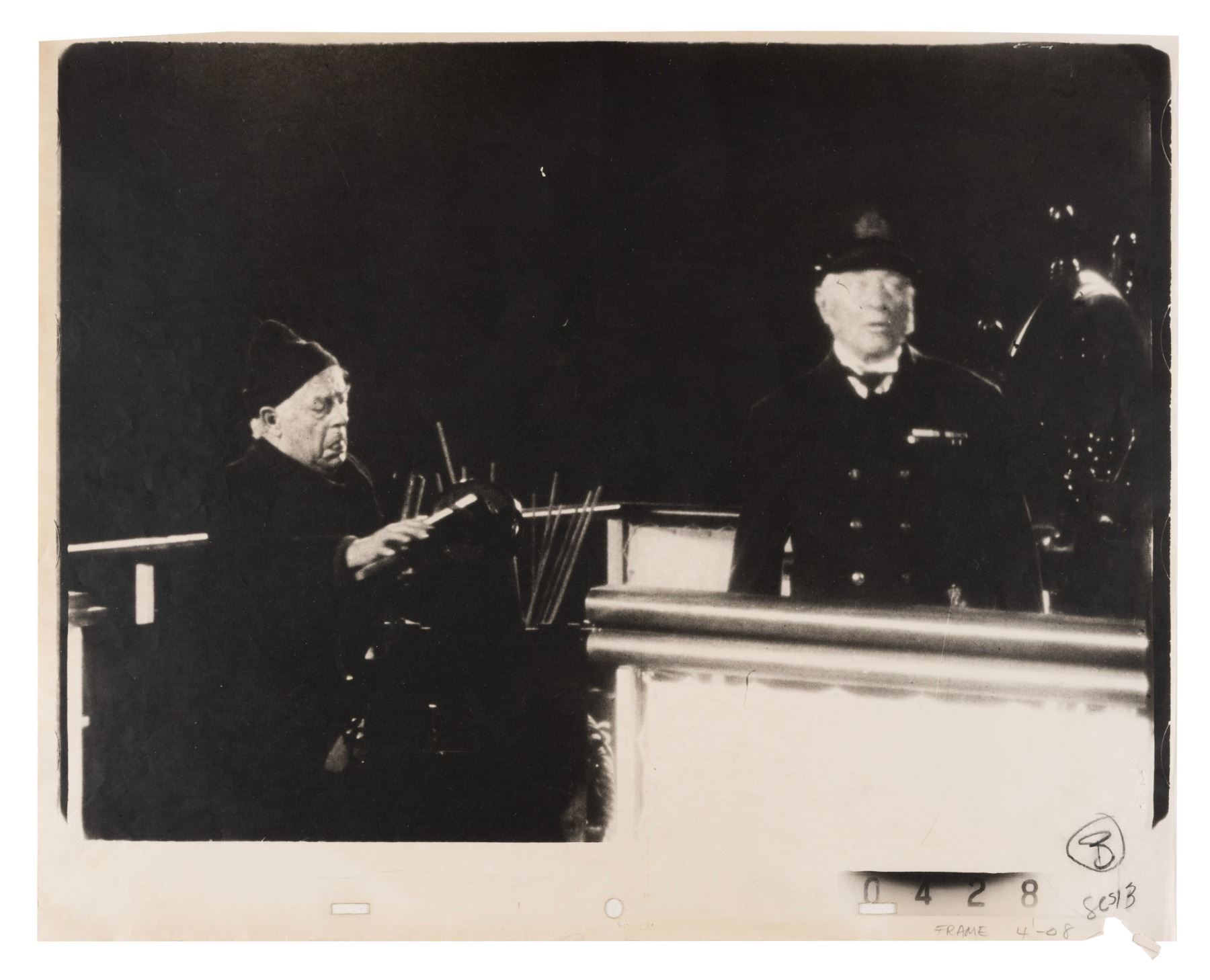 (Disney, 1964) A collection of five Mary Poppins photo prints on 16-field 3-peghole paper. The film used the traveling matte process to create the composite images of animation and live action. As part of the process, blow-up prints of individual live-action frames were created for the animators to use as reference to plot out the action of the animated characters. The prints include images of Mary Poppins, Bert, and Admiral Boom. Measuring 12.5” x 15.5”, the prints are in good condition with handling wear from production use.
