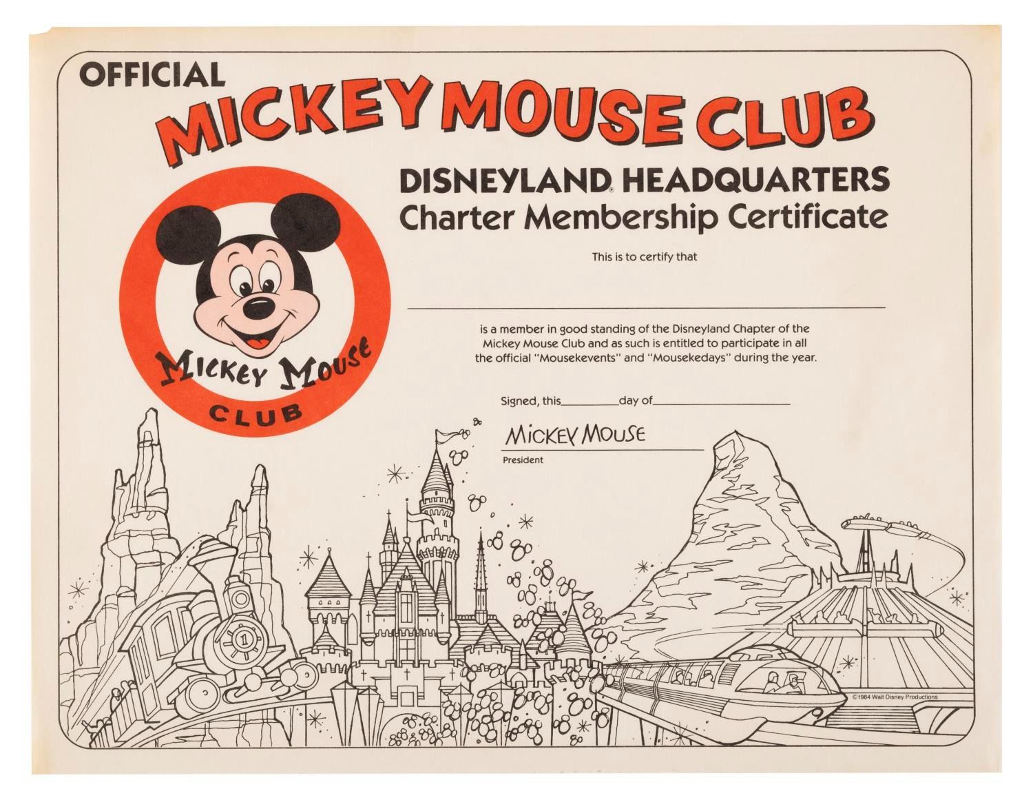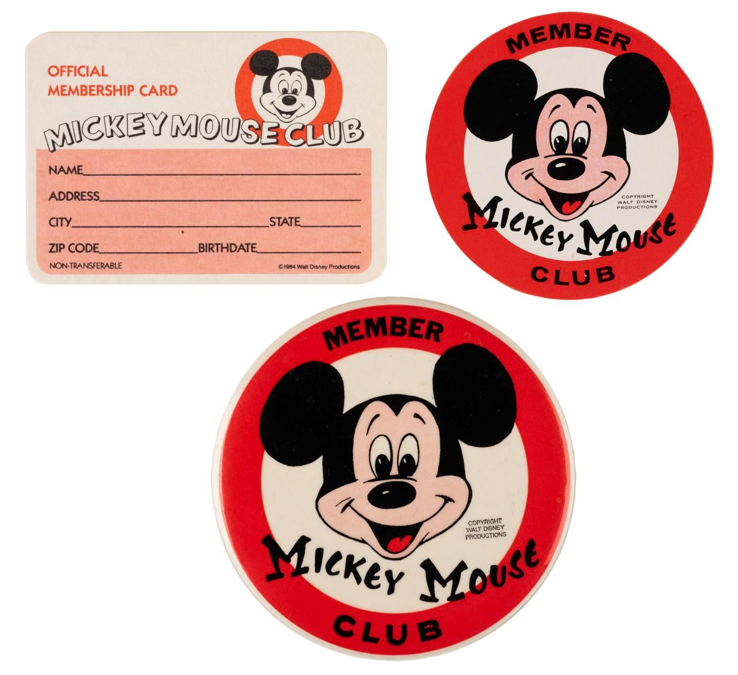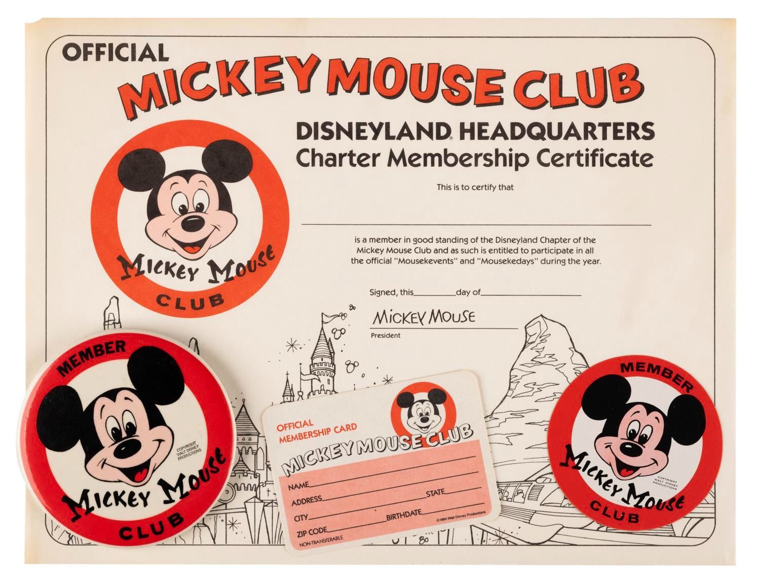 (Disney, 1984) A collection of Mickey Mouse Club membership items including a certificate, a membership card, a button, and a sticker. Measuring from the 2.75" in diameter sticker to the 8.5" x 11.25" certificate, the collection is in very good to good condition with light discoloration from age, edge wear on the certificate, scratches on the button and sticker, and a small pen mark on the card.